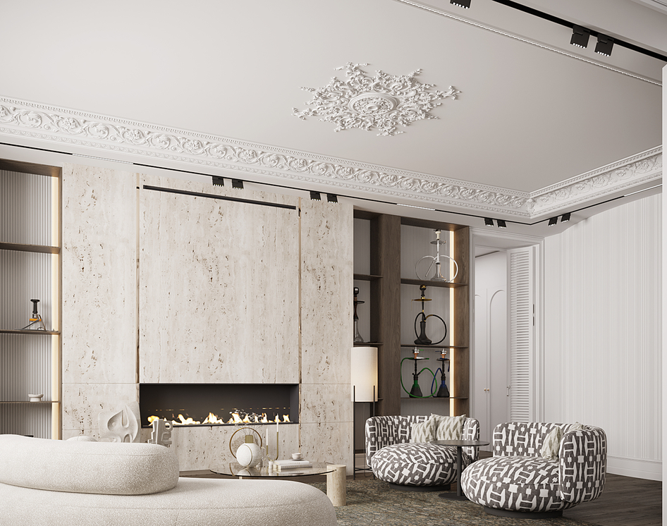 хозяева много курят, но хотели белую спальню с комнатой где они будут курить(ну вот так вот), дверки в спальню сделаем со стеклом, что б дым не шел в спальню, а кальяны на полке...ну не книги же мне им ставить...сейчас библиотеки это редкость, темболее у них есть еще два кабинета, каминная на 1 этаже..На полки что то тематическое поставить, пусть кальяны собирают. вытяжка над камином предусмотрена.