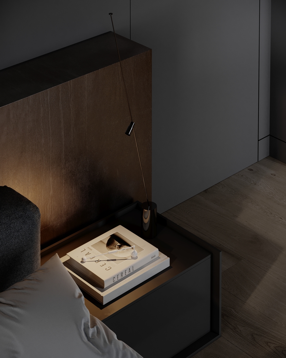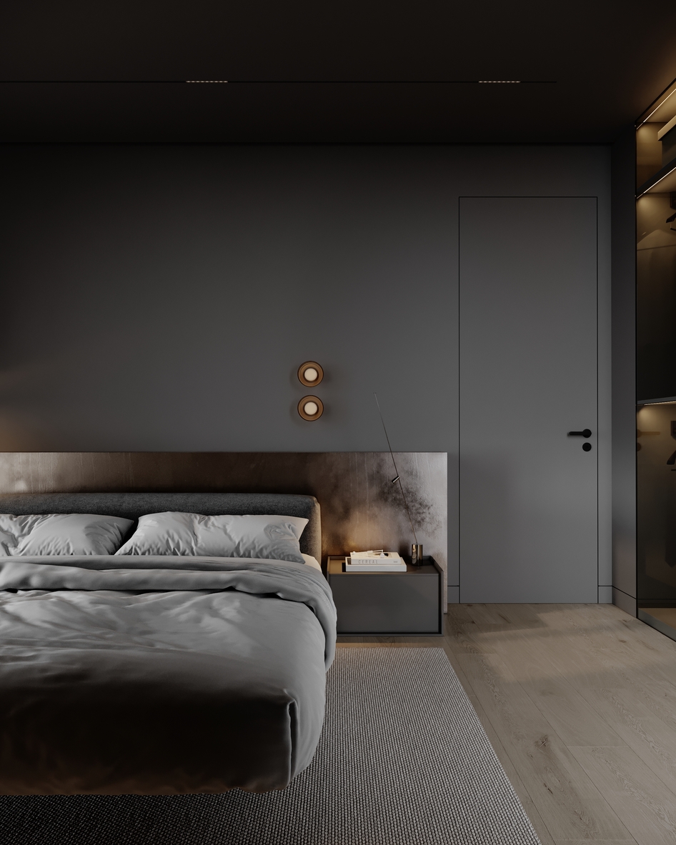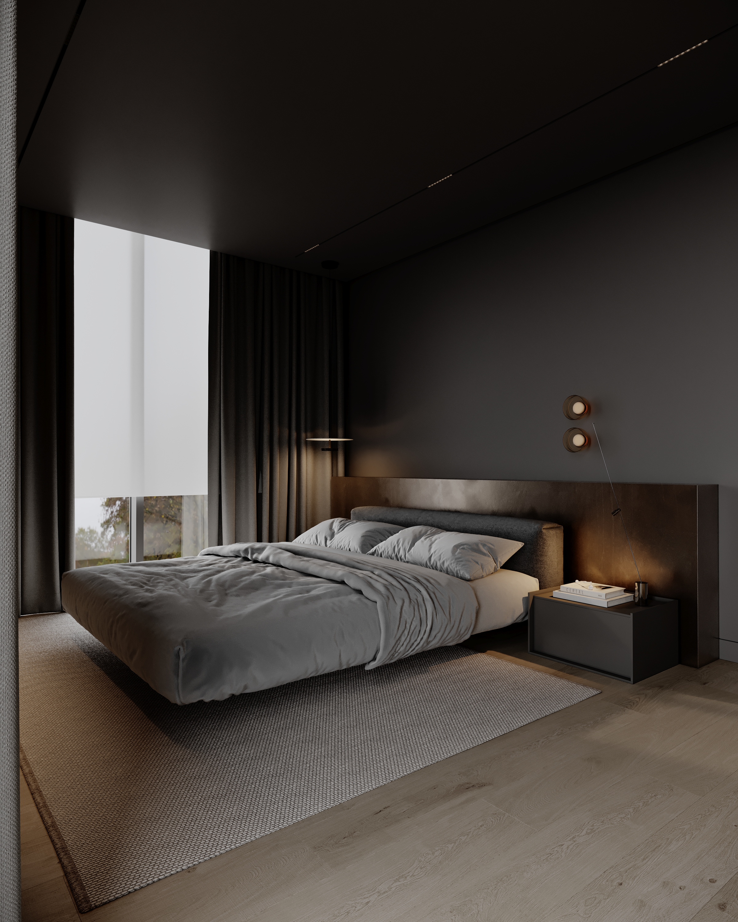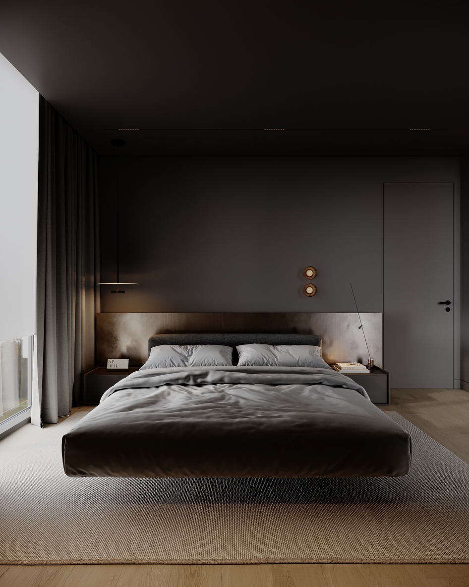 Минимализм во всём: тёмные стены, мягкий свет и кровать от @boca_room , будто парит в воздухе.