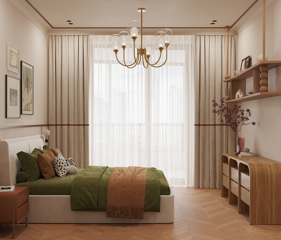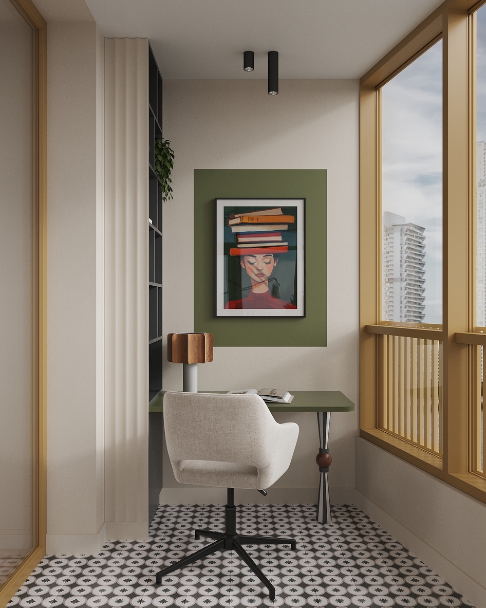 Яркая спальня с рабочей зоной на балконе