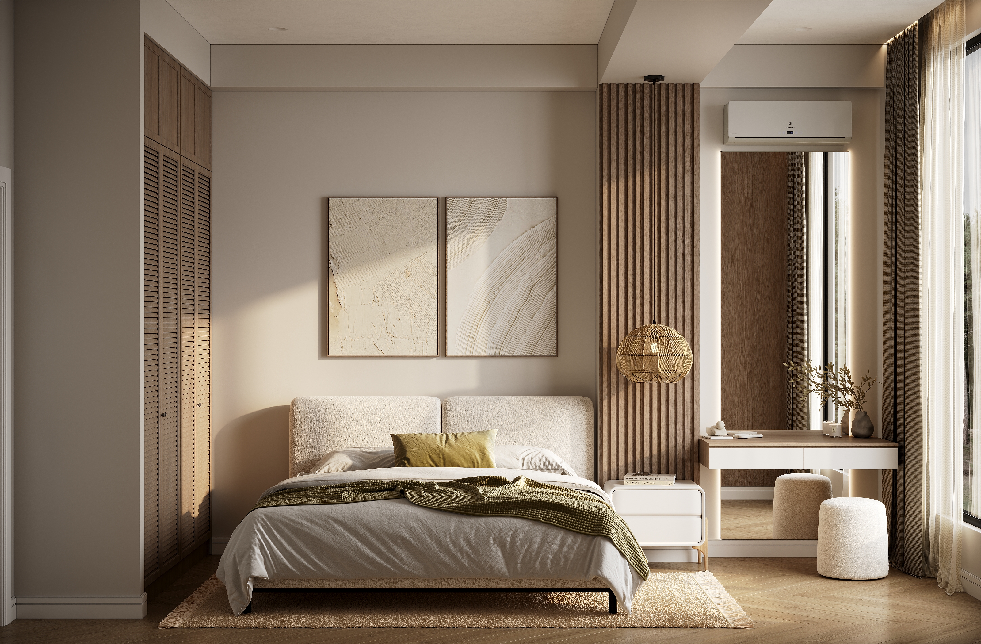 Небольшая, уютная спальня молодой девушки в закатном свете по проекту дизайнера