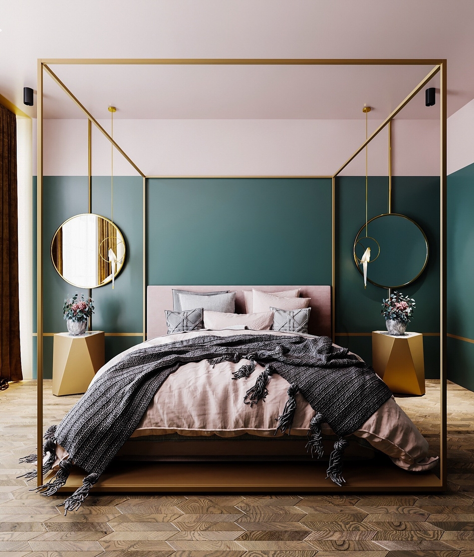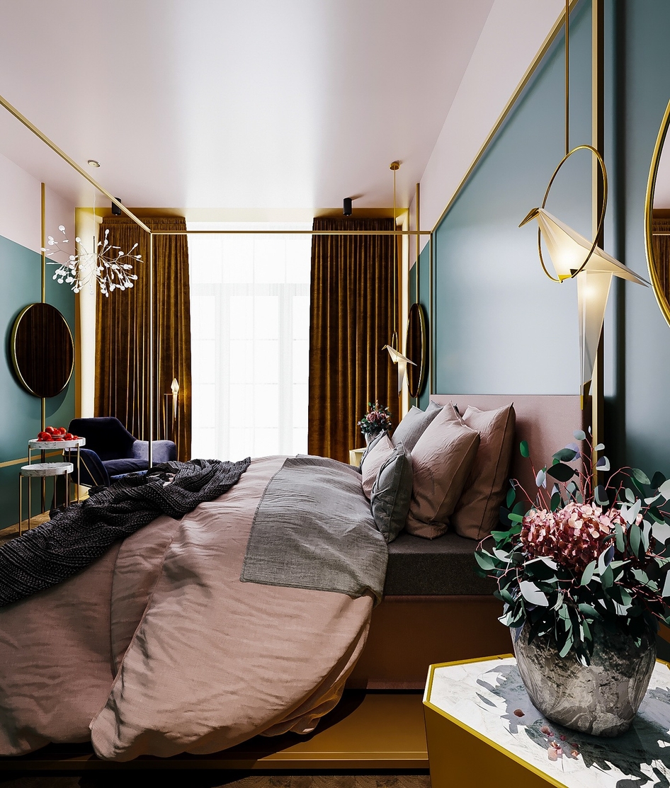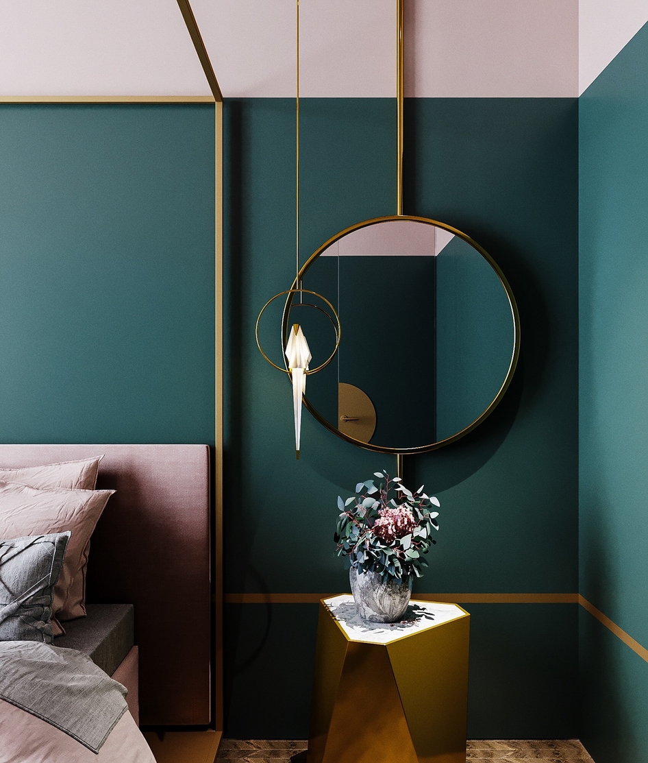 Очень модные фишки- эти сочетания цветов и присутствие цветных металлов)) Классно смотрится. 5+ Но розовый потолок... смущает, чисто психологически будет некомфортно в таком помещении долго.