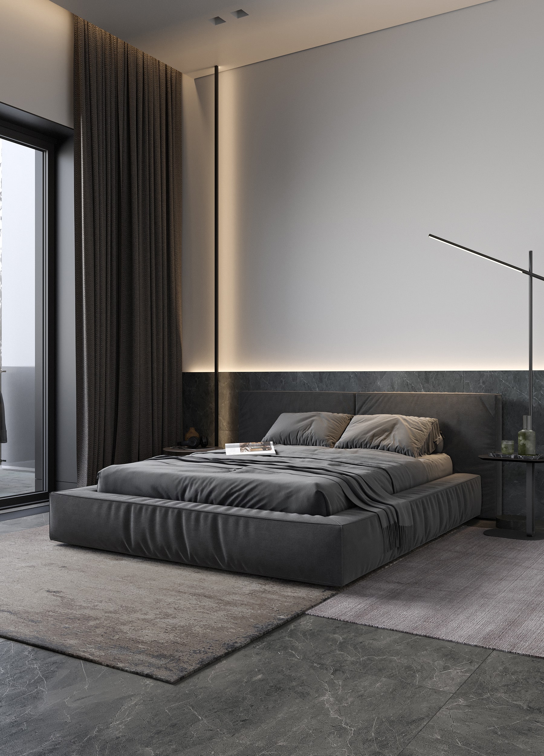 Спальня. Современный минимализм. Дизайн практически полностью перенесен на новую планировку с предоставленного заказчиком референса. Автор референса Dim Eysner