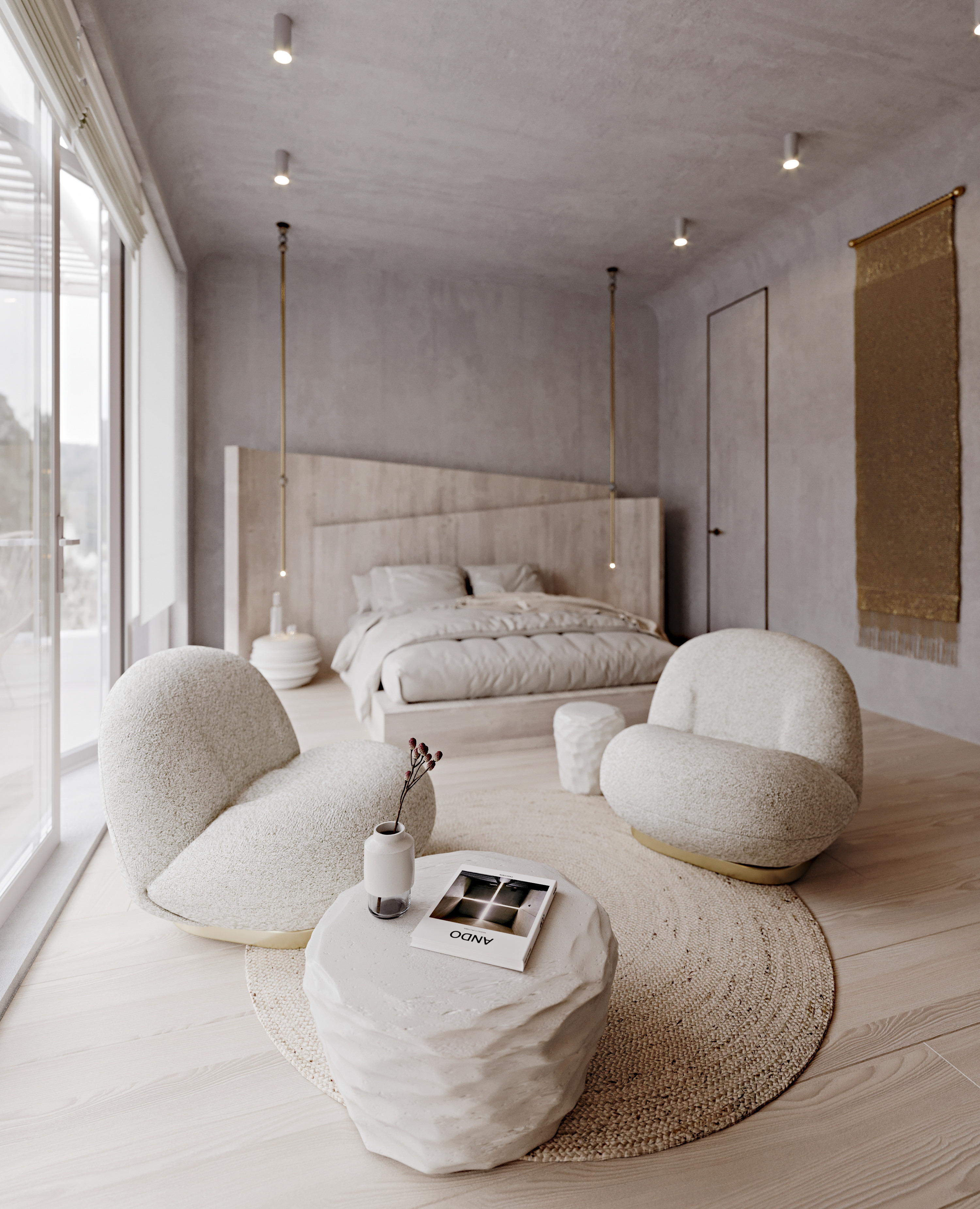 Спальня в светлых бежевосерых тонах. Кровать, латунные светильники и керамические столики дизайн Katerina Shahmanova.