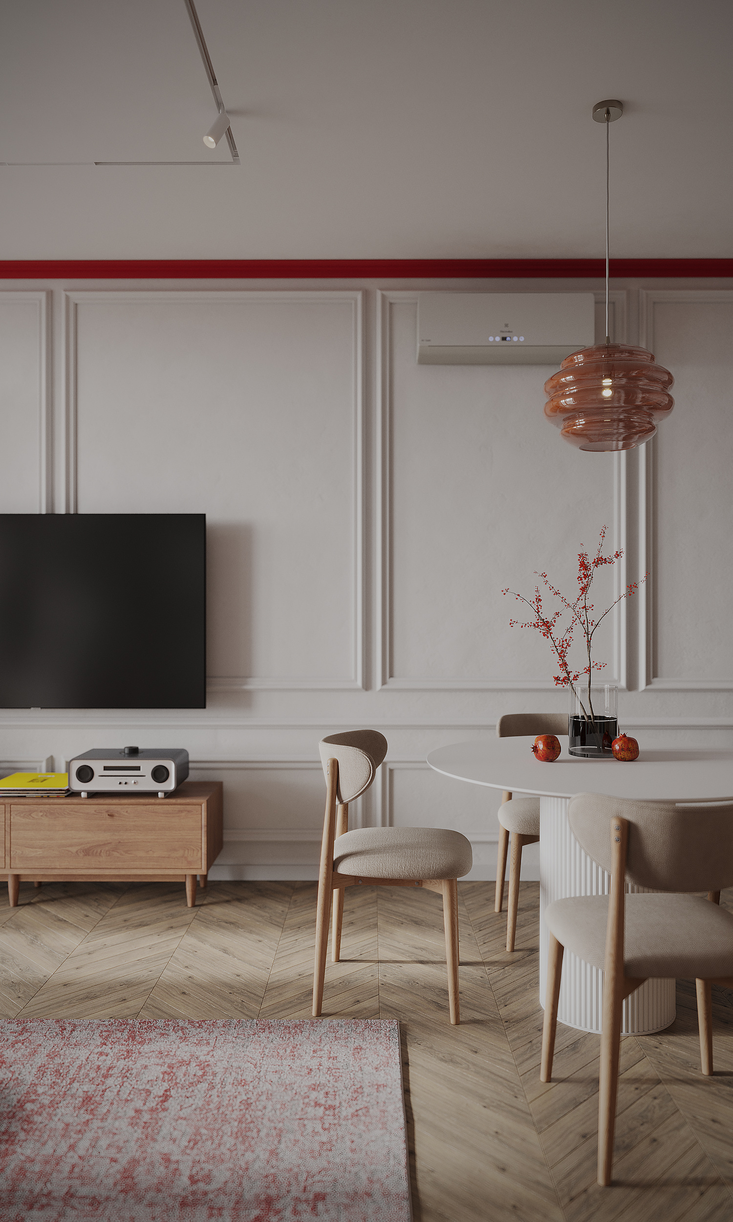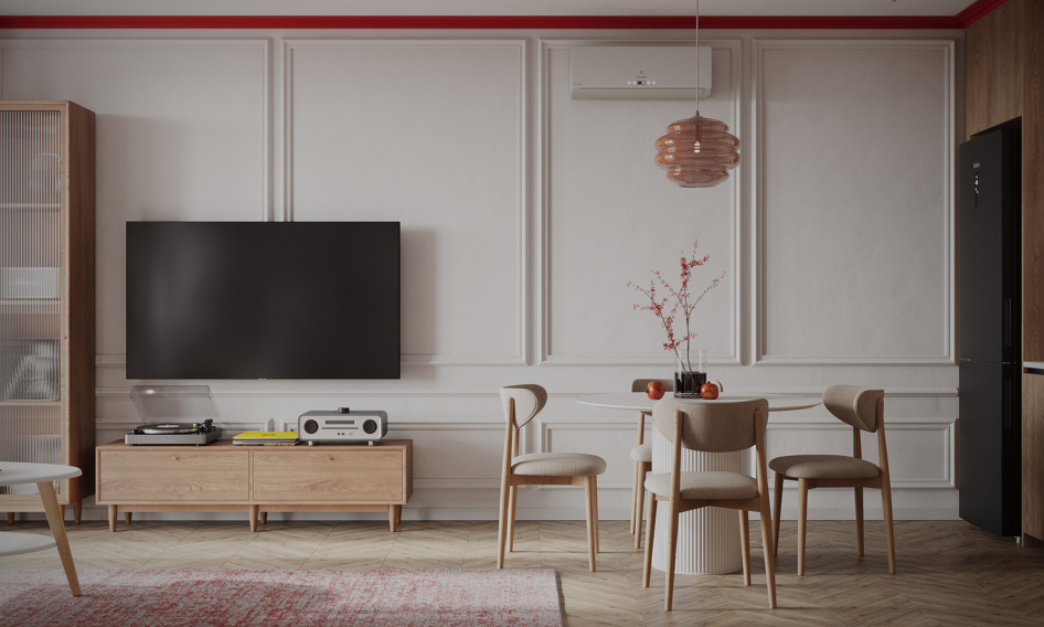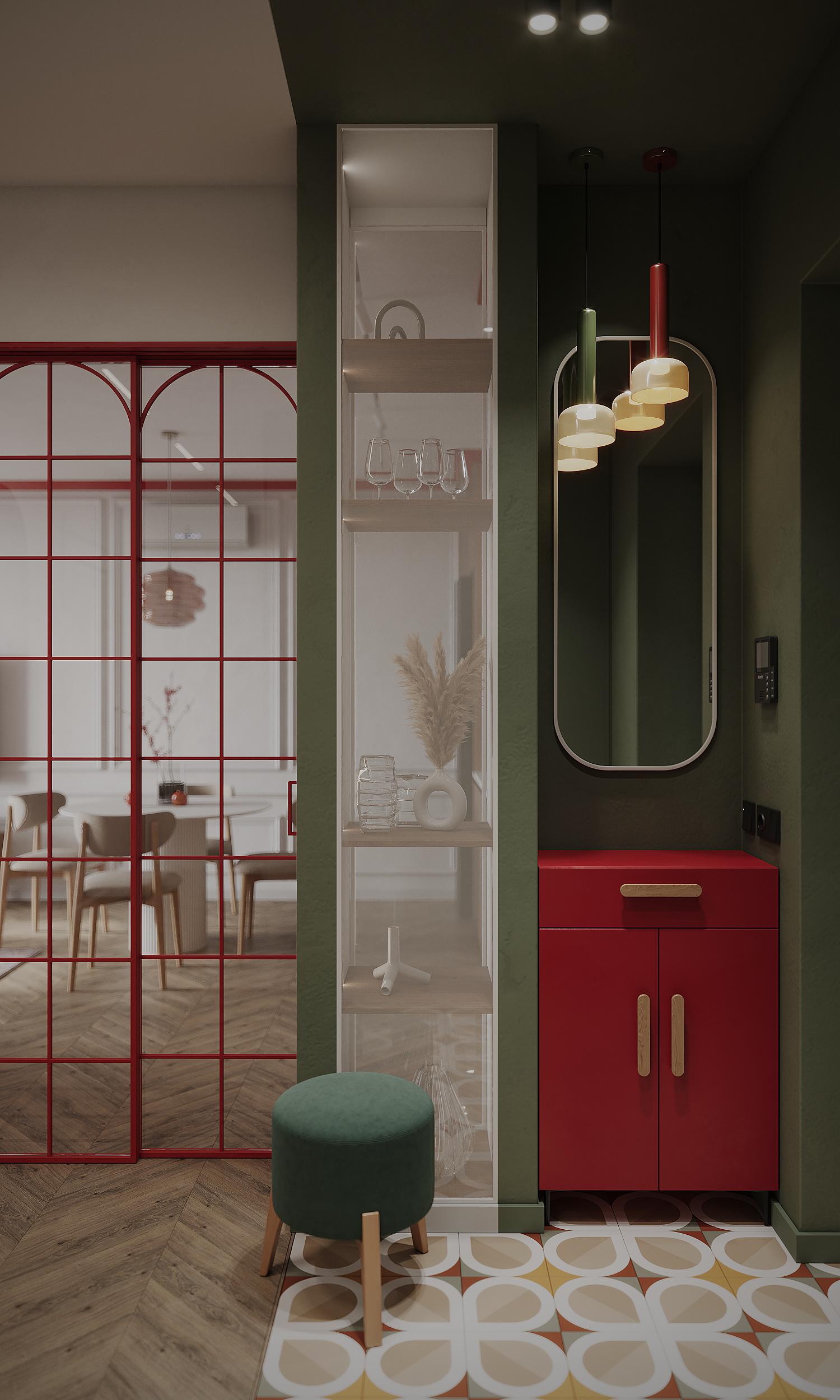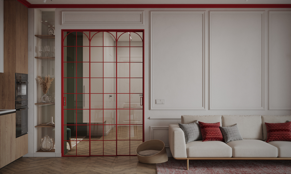 Небольшая кухня-гостиная и прихожая с яркими акцентами.