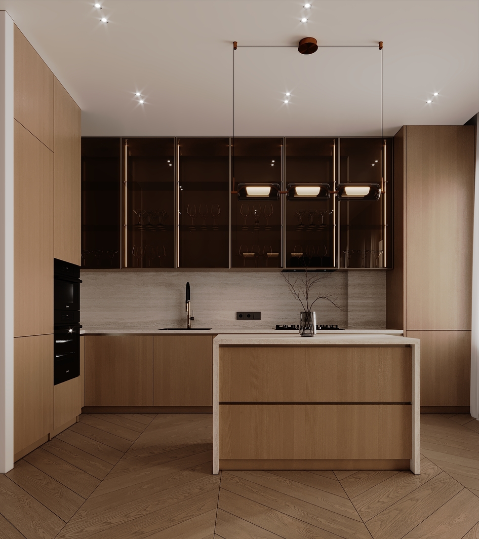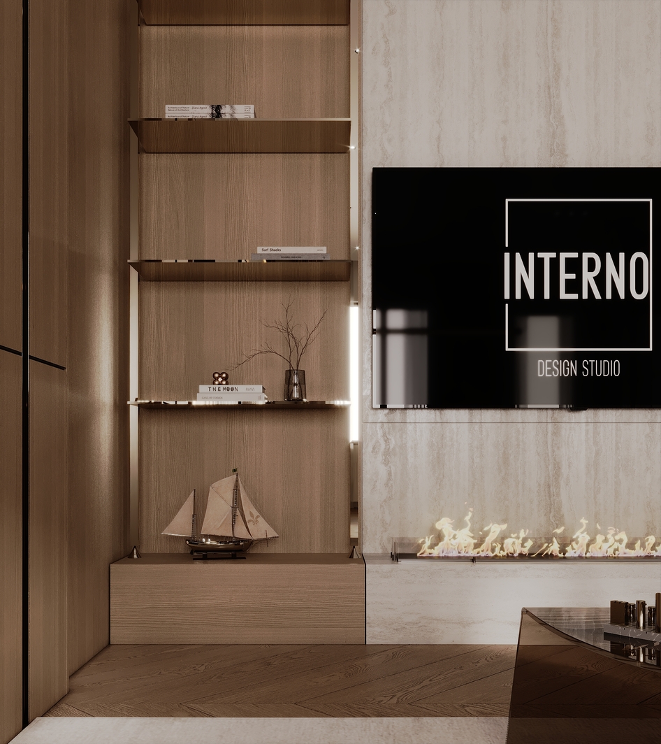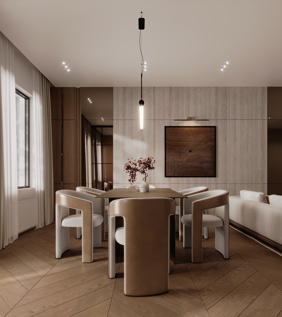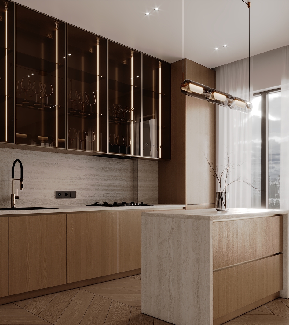 Этот дизайн — ода современной элегантности. Мы использовали теплую, монохромную палитру из бежевых, песочных и светло-коричневых оттенков, сбалансированных текстурой светлого дерева и фактурой травертина на стенах