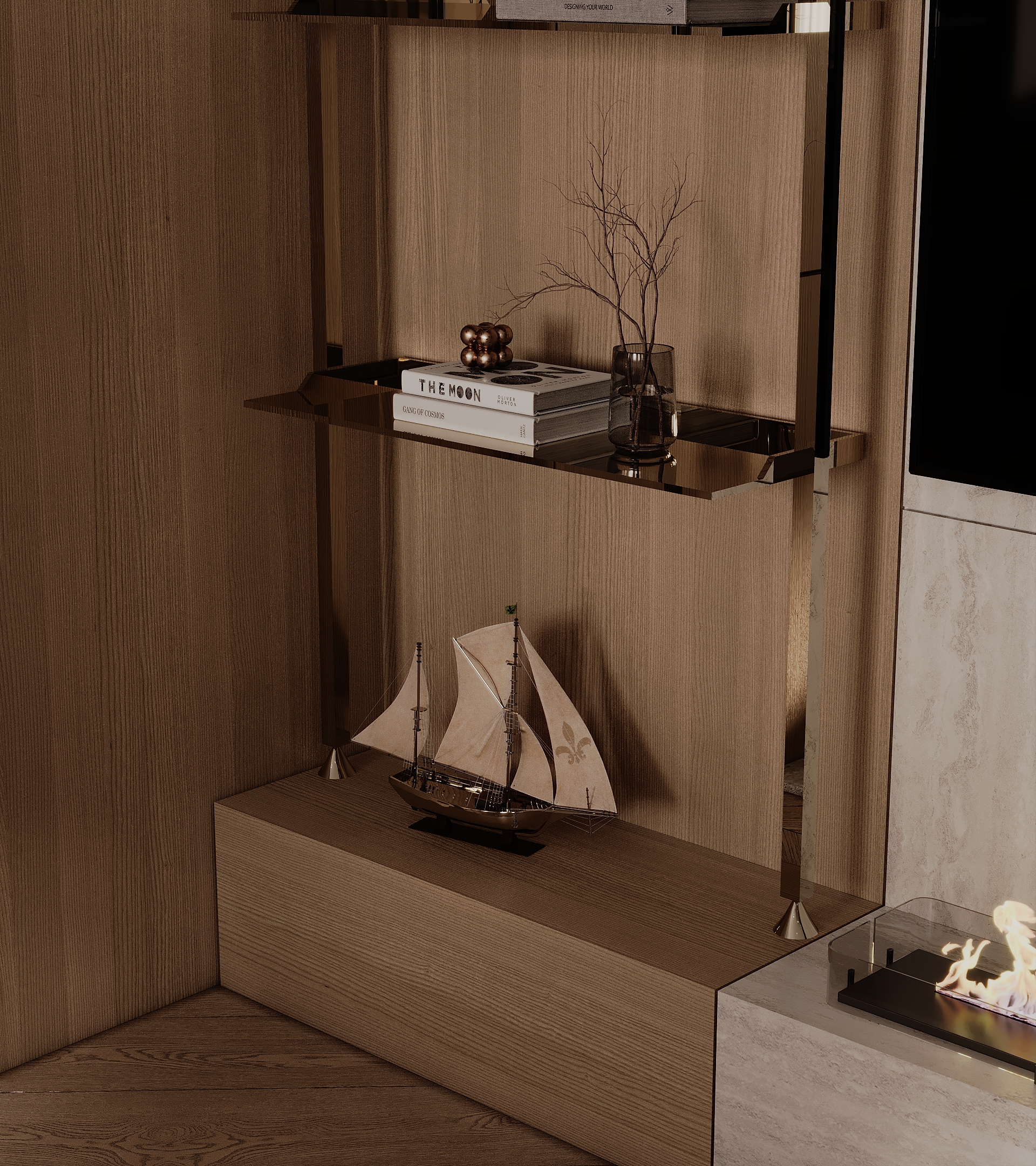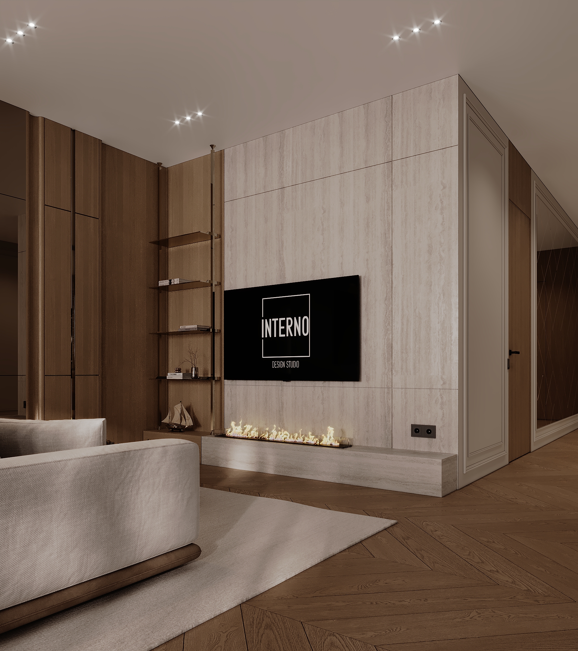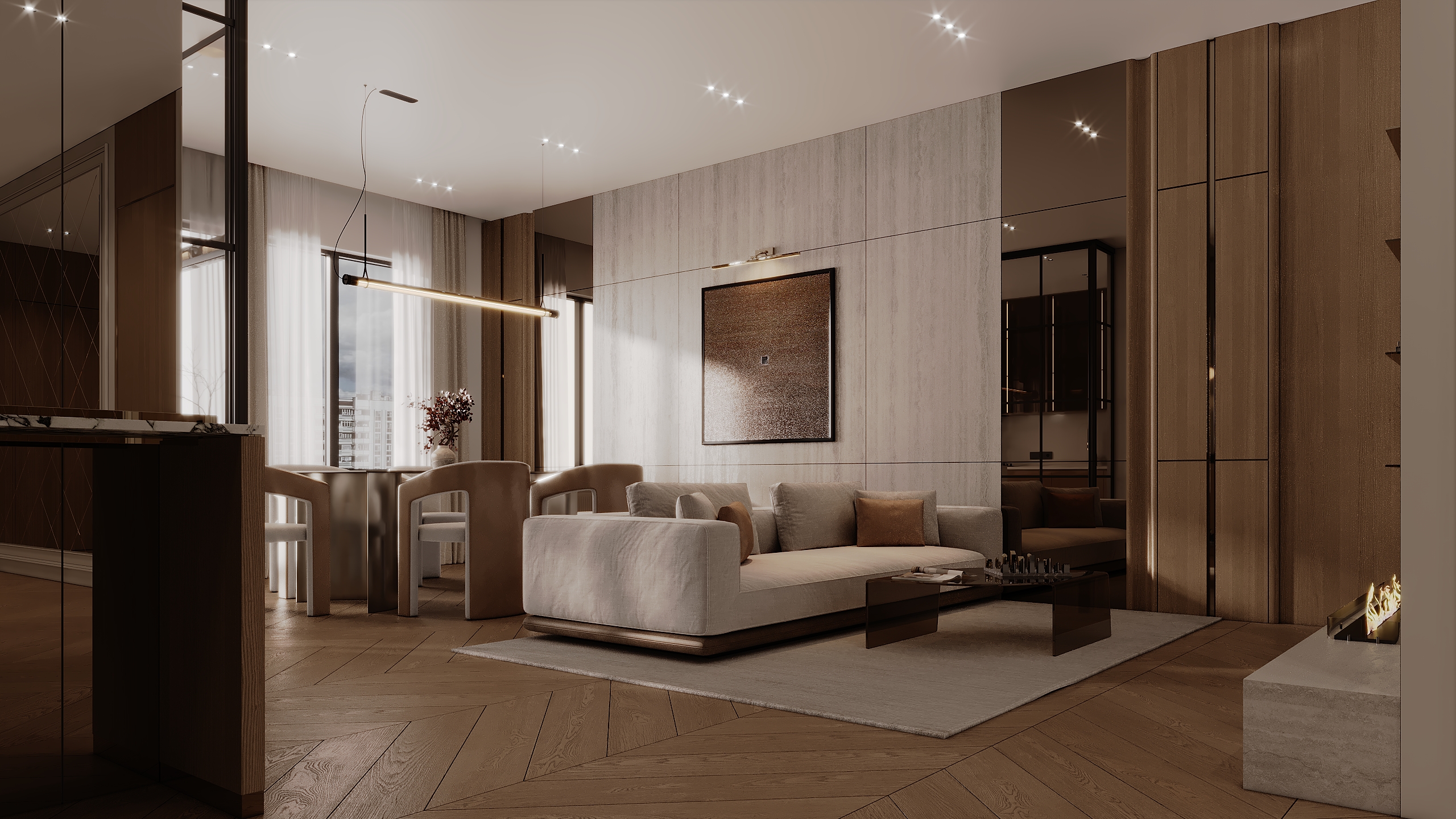 Этот дизайн — ода современной элегантности. Мы использовали теплую, монохромную палитру из бежевых, песочных и светло-коричневых оттенков, сбалансированных текстурой светлого дерева и фактурой травертина на стенах