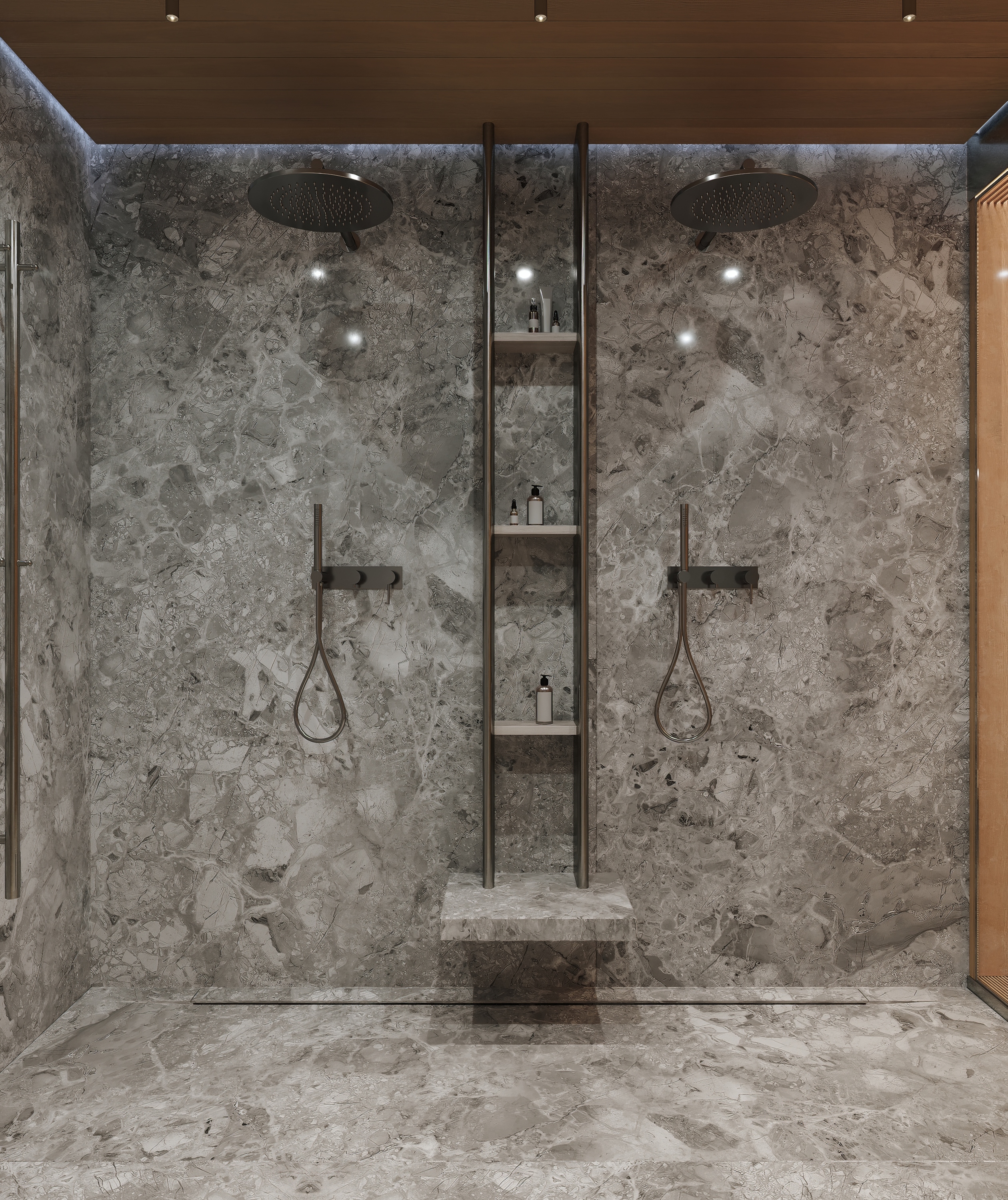 Дизайн и визуализация ванной комнаты с домашней сауной.