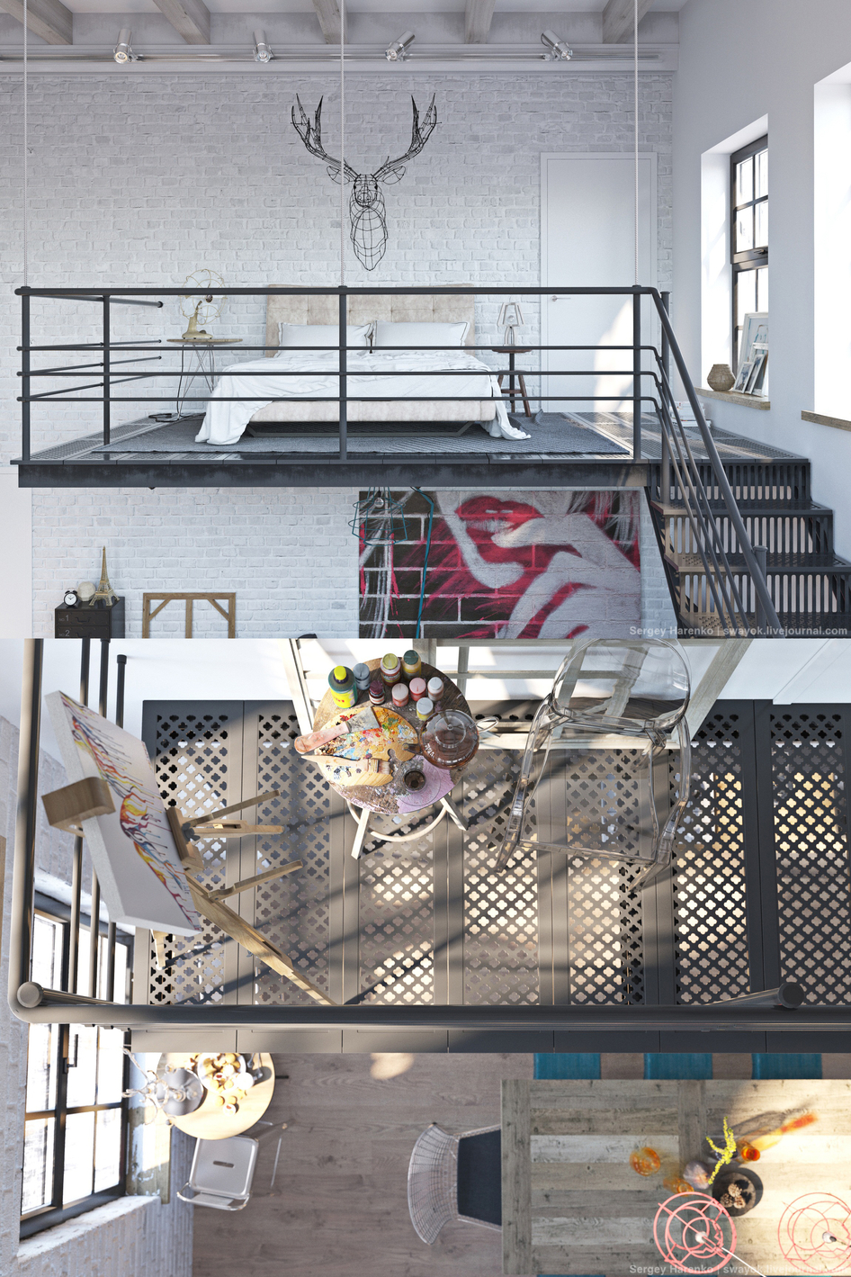 Визуалка отличная, дизайн, мебель хороши, только сильно смущает рабочая зона для художника. Уж слишком мало места для творчества, впечатление что художка чисто как хобби для клиента данного места жительства. Да и еще на балконе, куда нужно подниматься, постоянные отрывания дверей, хождения по лестнице, в порыве творчества будет раздражать такое беганье. Я бы расположил рабочую в зоне спальни , или же все-таки на первом этаже, места хватает.