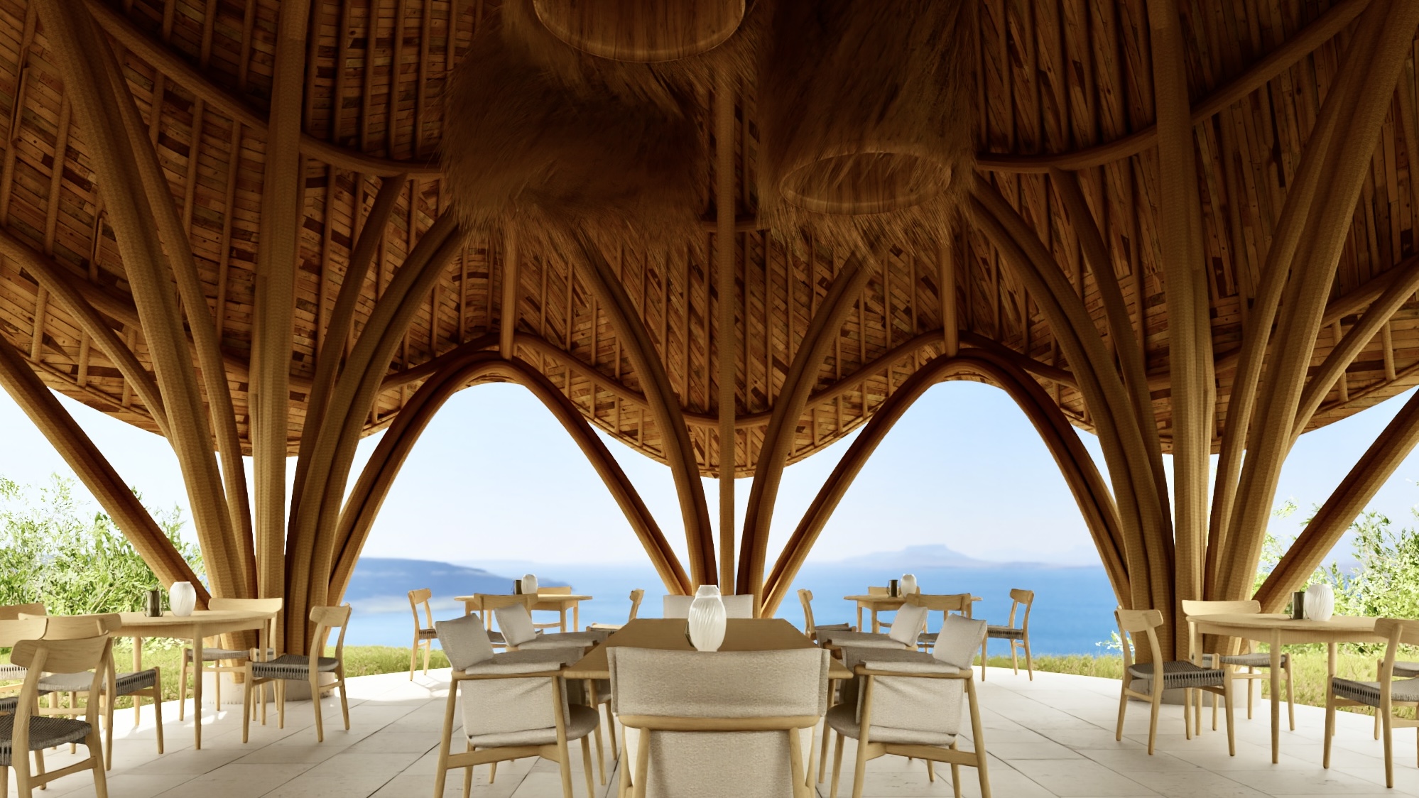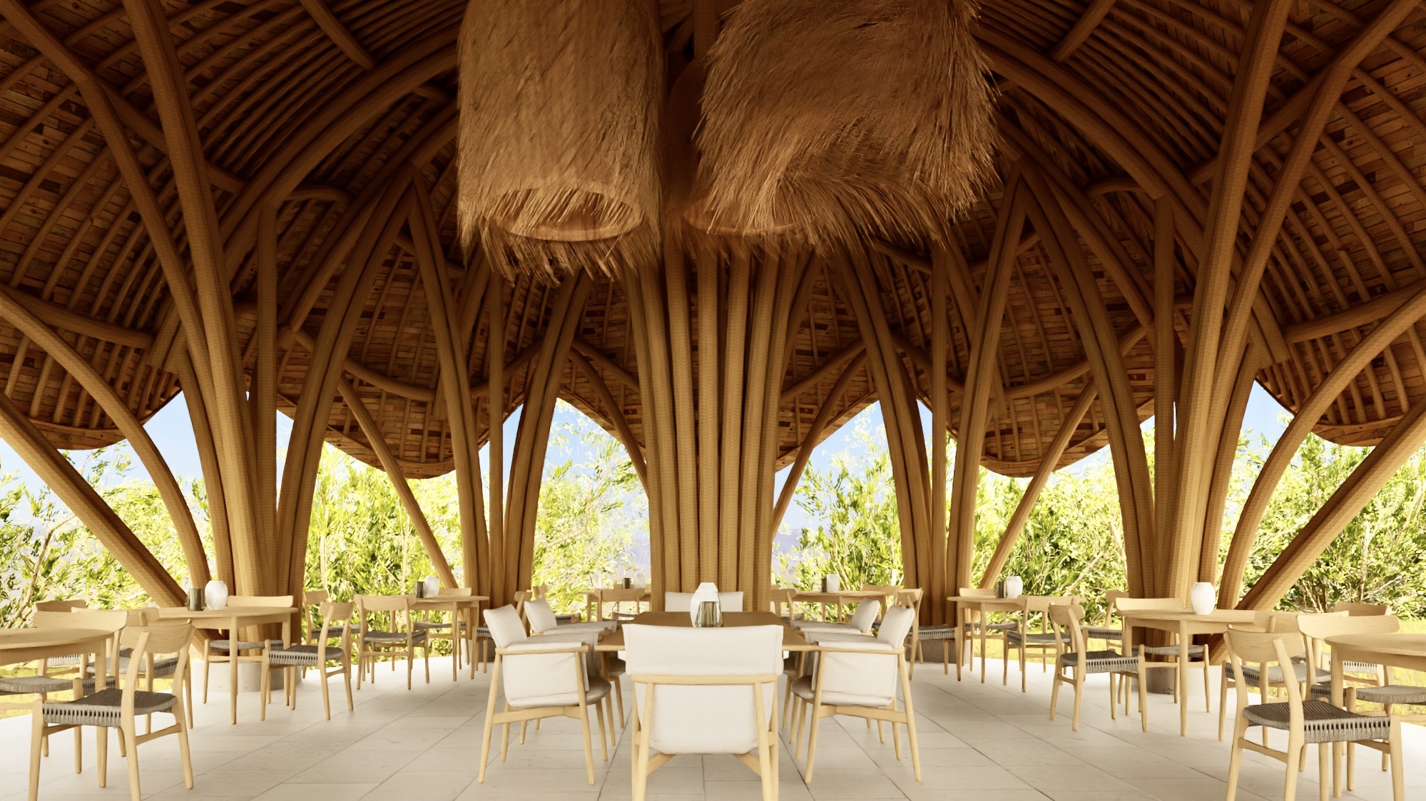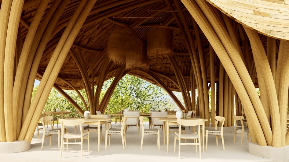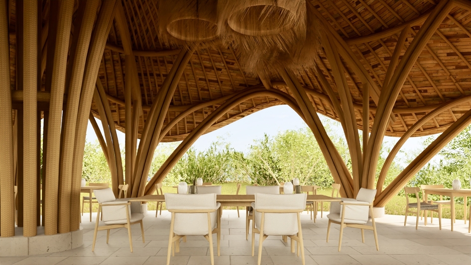 Они сделаны из толстого бамбука, на визуализации это не передано просто, проект делался совместно с Балийскими архитекторами, они там много очень из него строят.