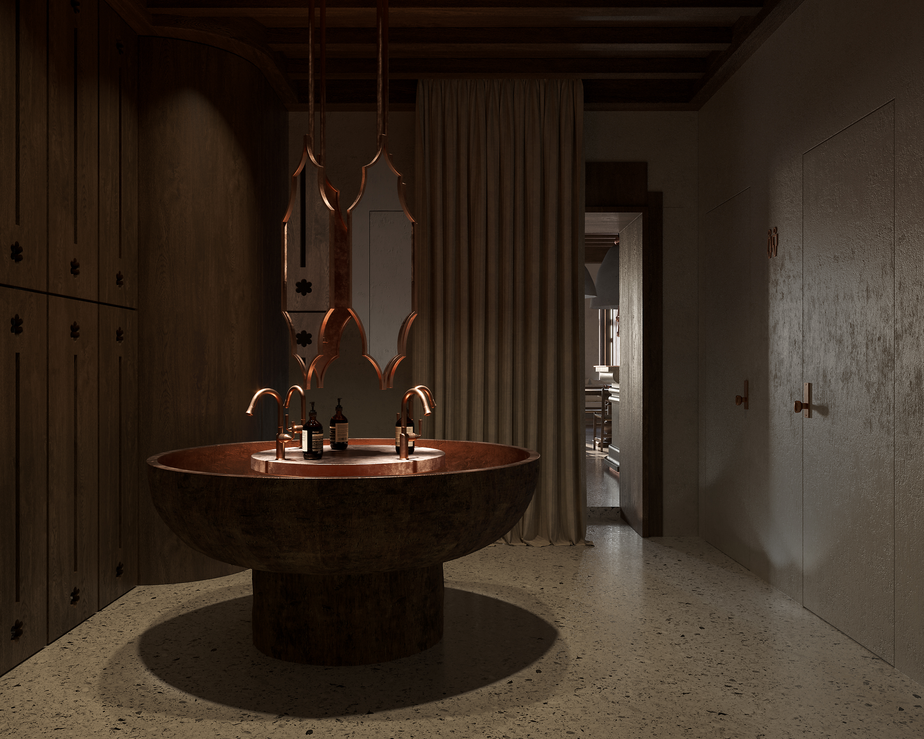 Фрагменты: утренний ресторан и уборная на первом этаже, входная зона, уборная и приватный зал на втором этаже