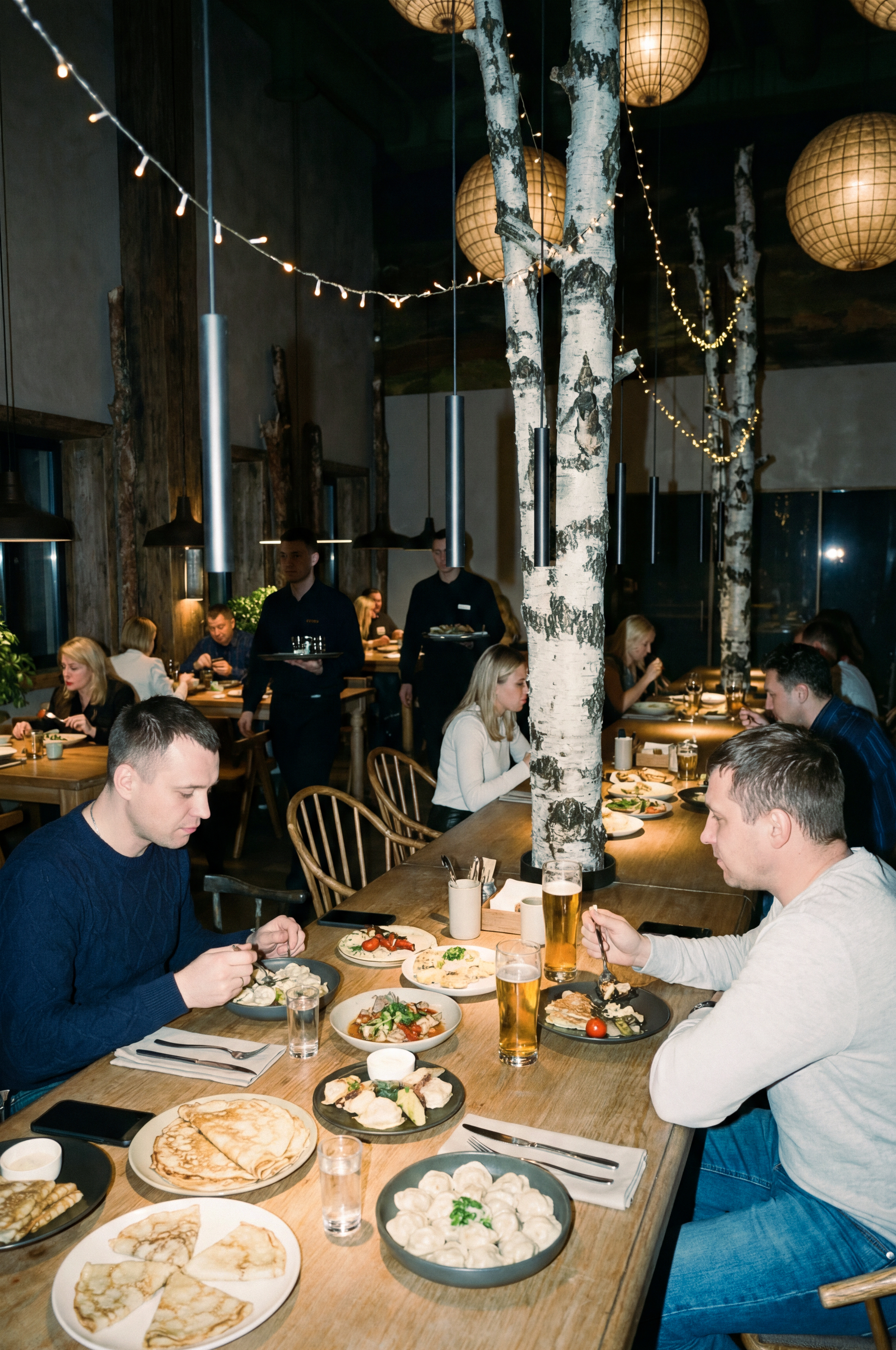 Реалистичность ИИ людей не так впечатляет, как впечатляет освещение, имитирующее то-ли фото на зеркалку и те самые фото из клубов 10-х годов, то-ли фото на мыльницу владельца ресторана, для размещения ради продвижения в социальных сетях. Супер круто выглядит. Аплодисменты автору. Единственное что бросается в глаза это форма берёз - очень уж они одинаковые ближе к макушке.