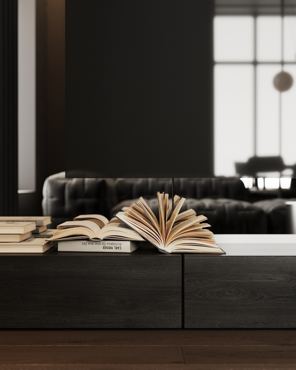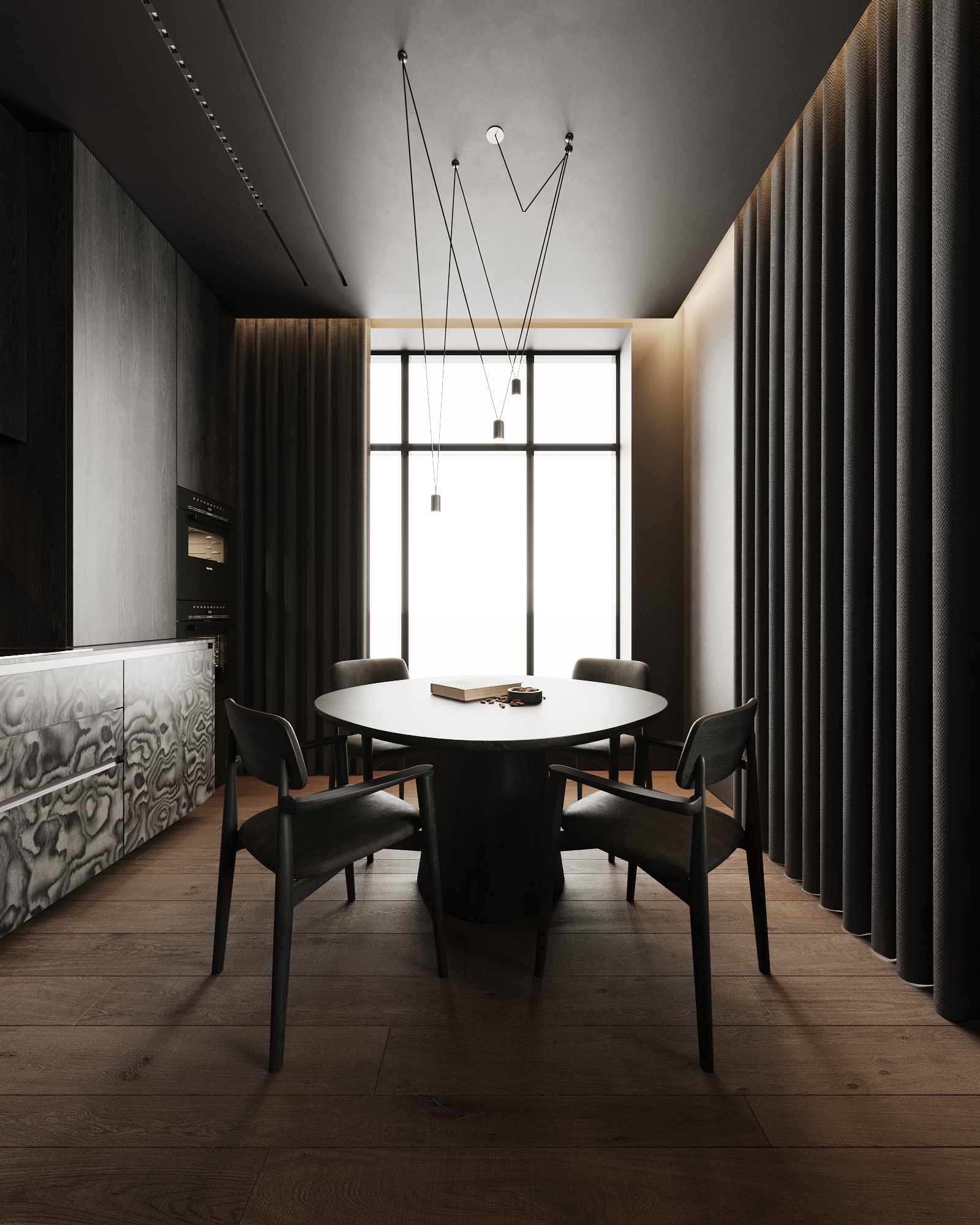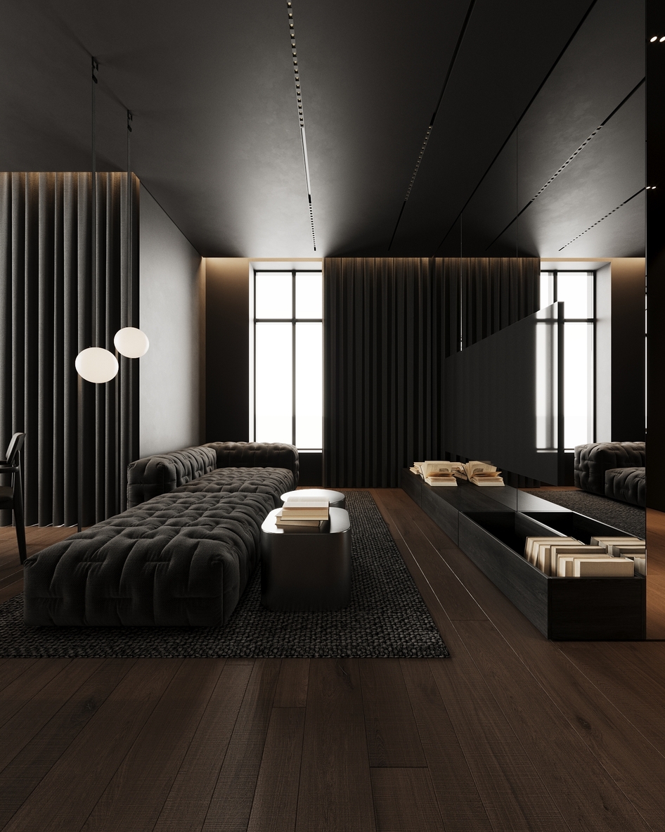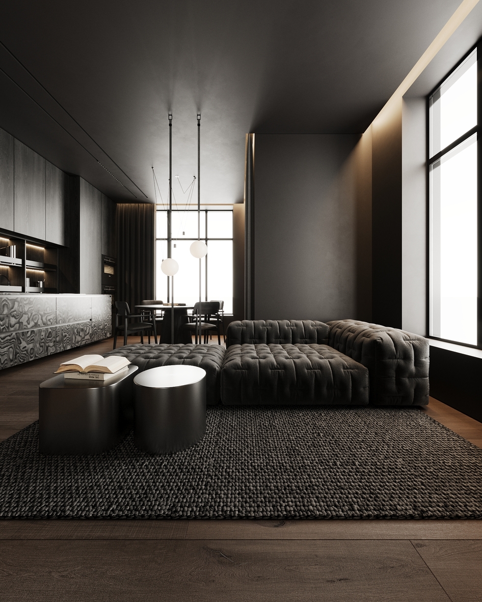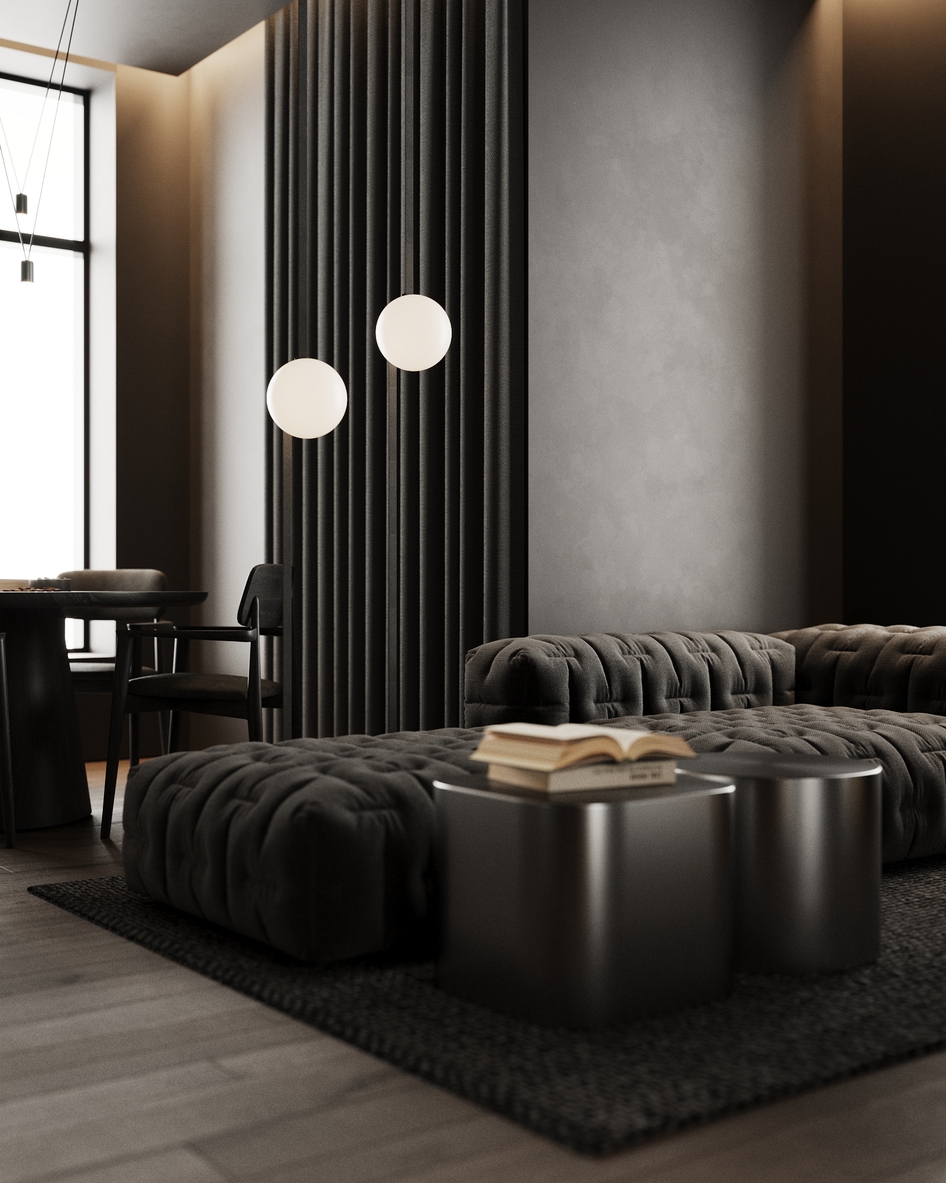 Интерьер выполнен в современном минималистичном стиле с элементами брутальности и акцентом на тёмную палитру.