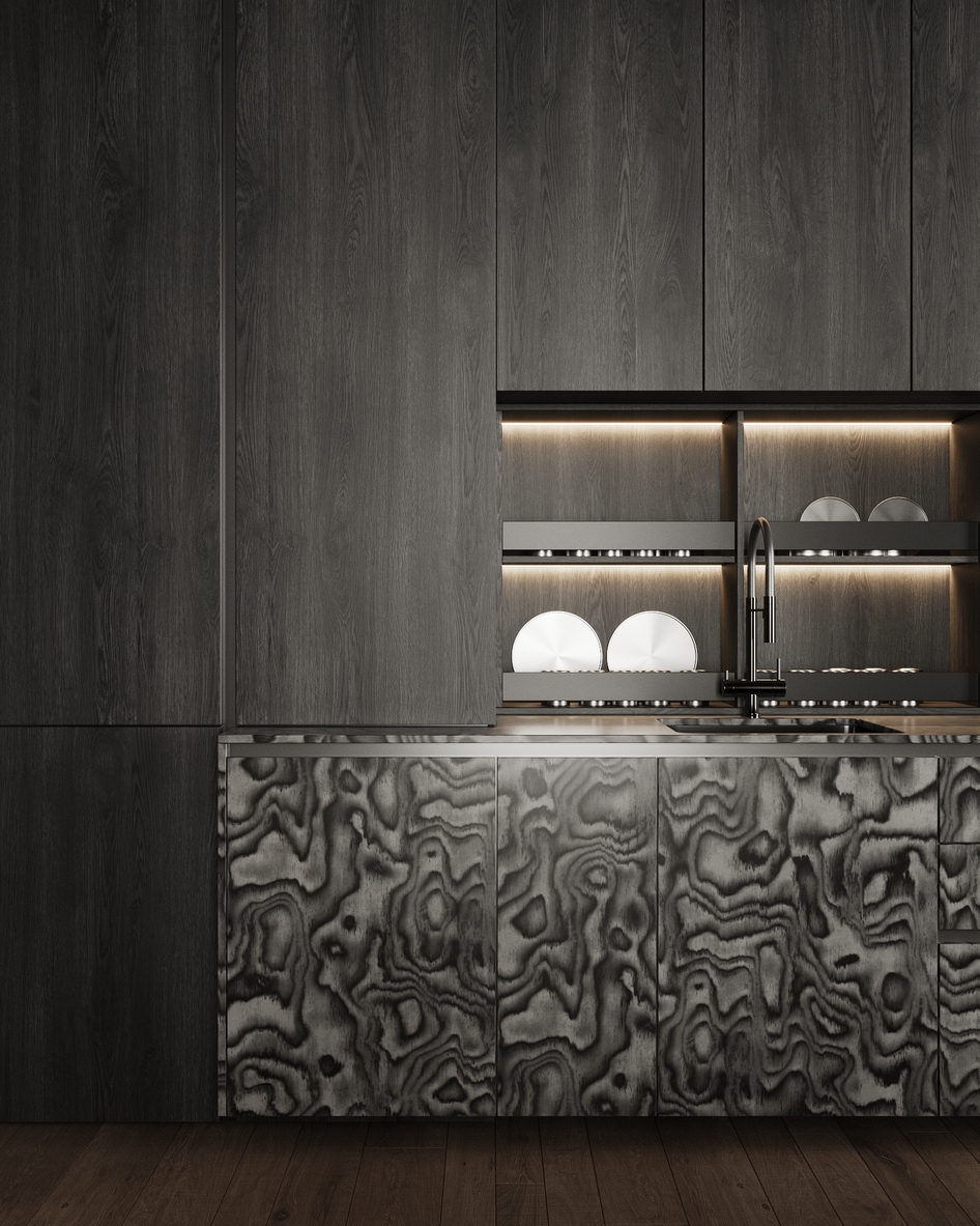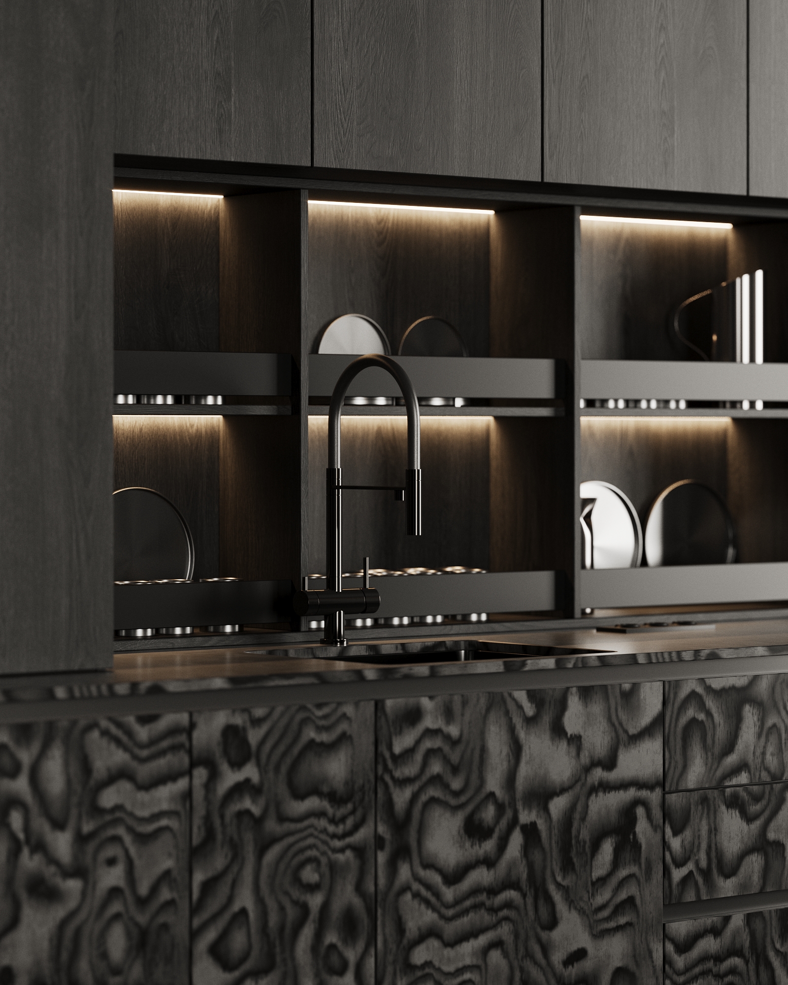 Фасады кухонных шкафов выполнены в чёрном дереве, а нижние панели имеют эффектный волнообразный узор, создающий акцент.
