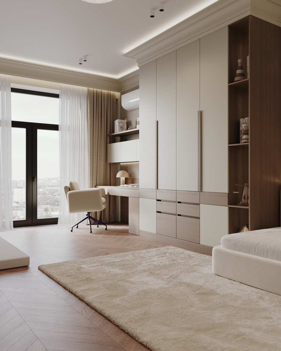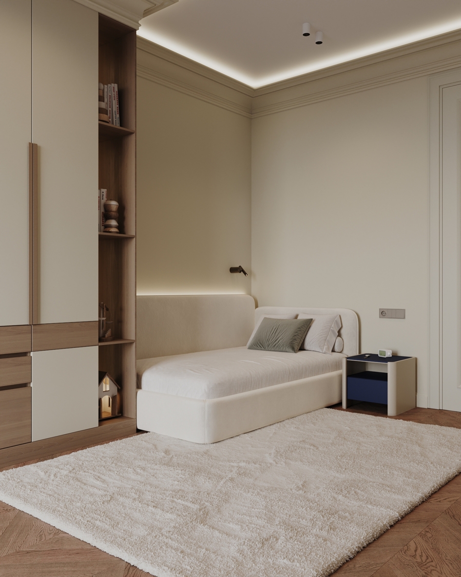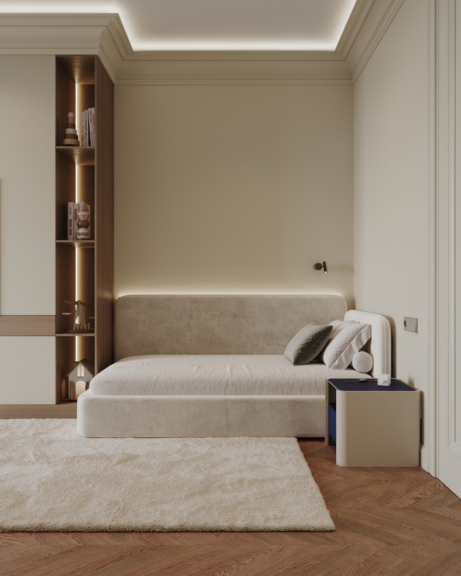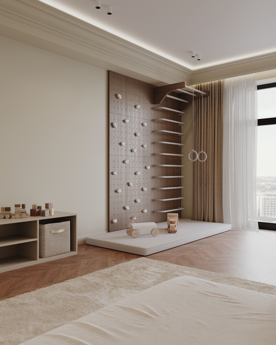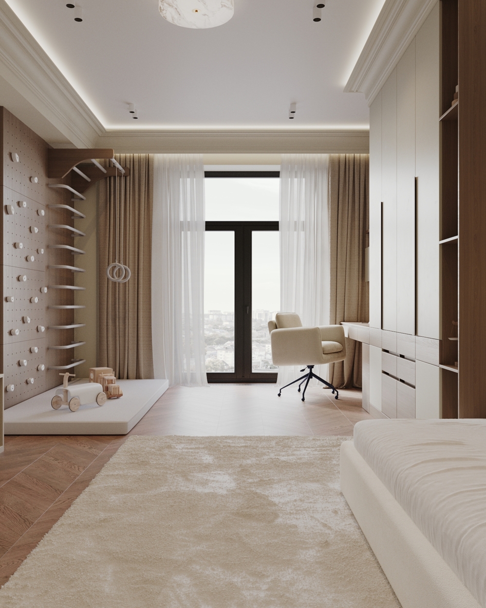 Мягкая палитра, натуральные текстуры и спокойное пространство для сна, игр и роста. Визуализация детской комнаты мальчика квартиры 167 кв. м. в г. Каспийск по проекту дизайнера Мухтаровой П.
