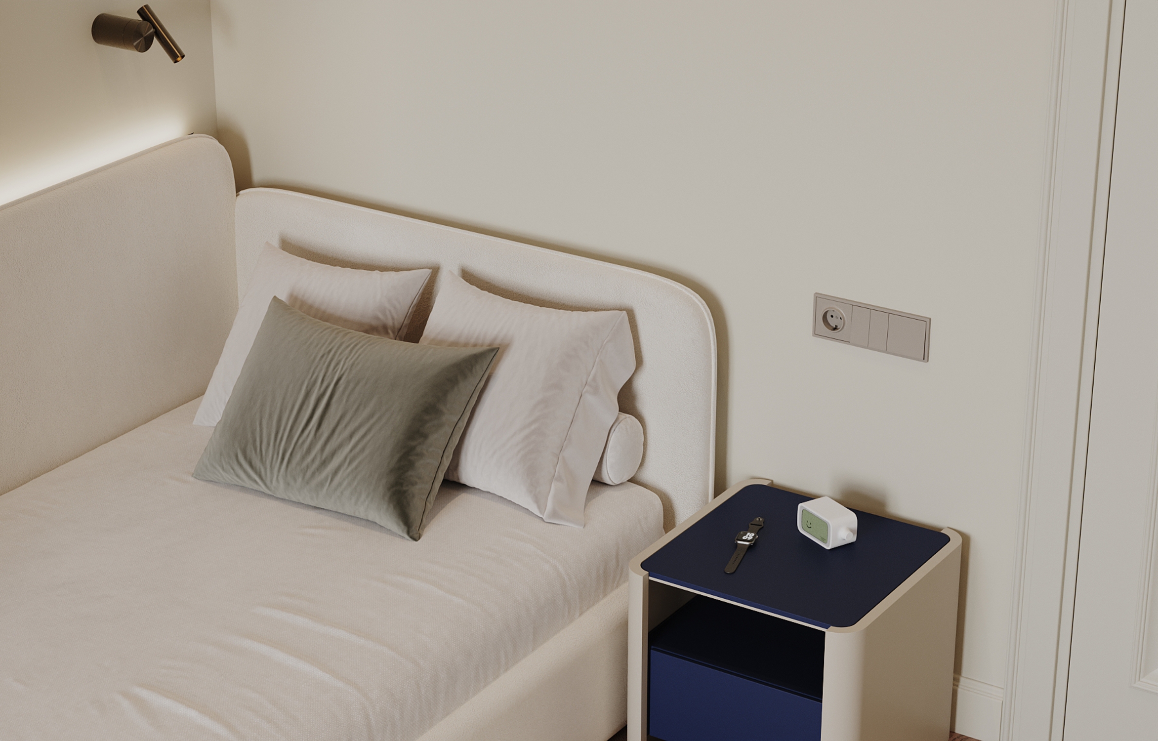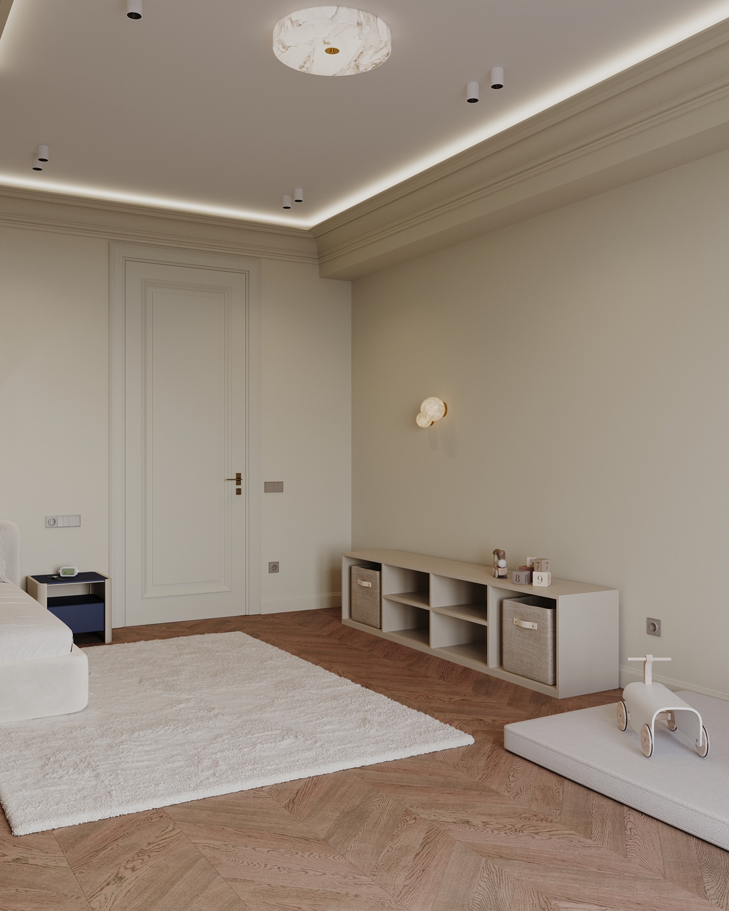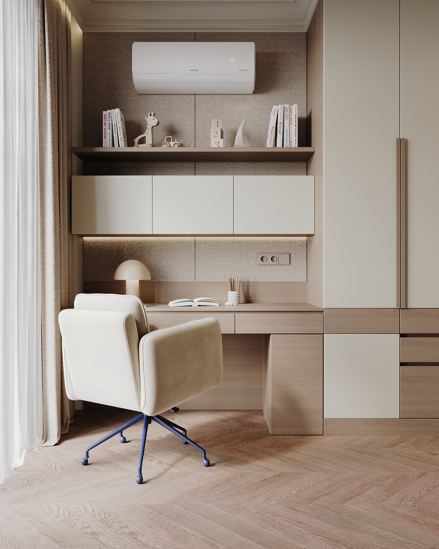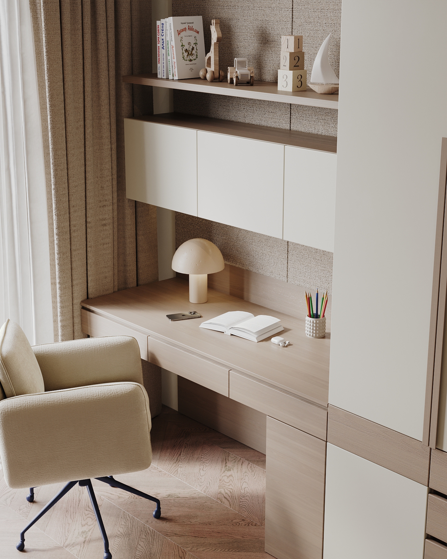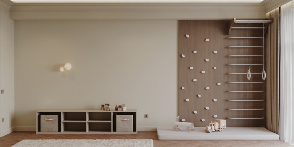 Мягкая палитра, натуральные текстуры и спокойное пространство для сна, игр и роста. Визуализация детской комнаты мальчика квартиры 167 кв. м. в г. Каспийск по проекту дизайнера Мухтаровой П.