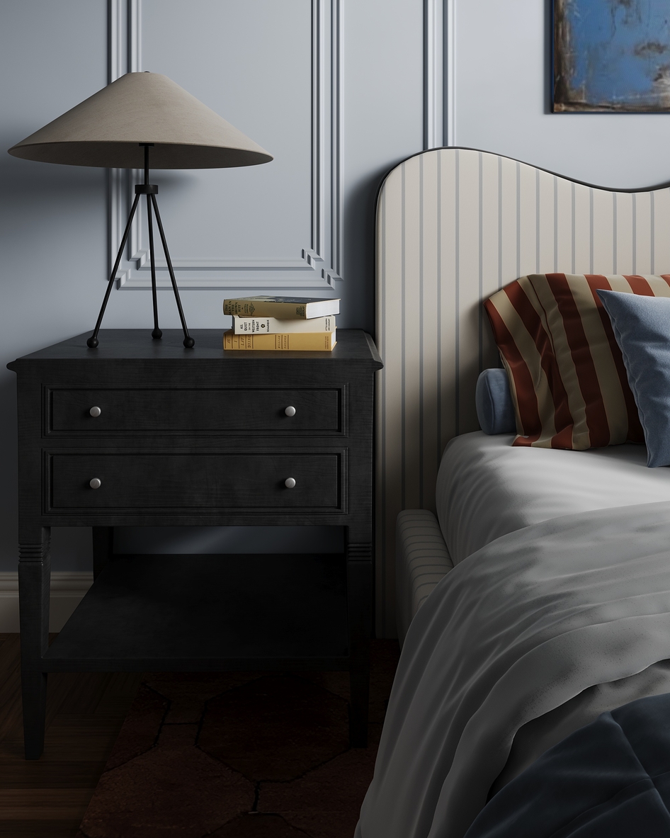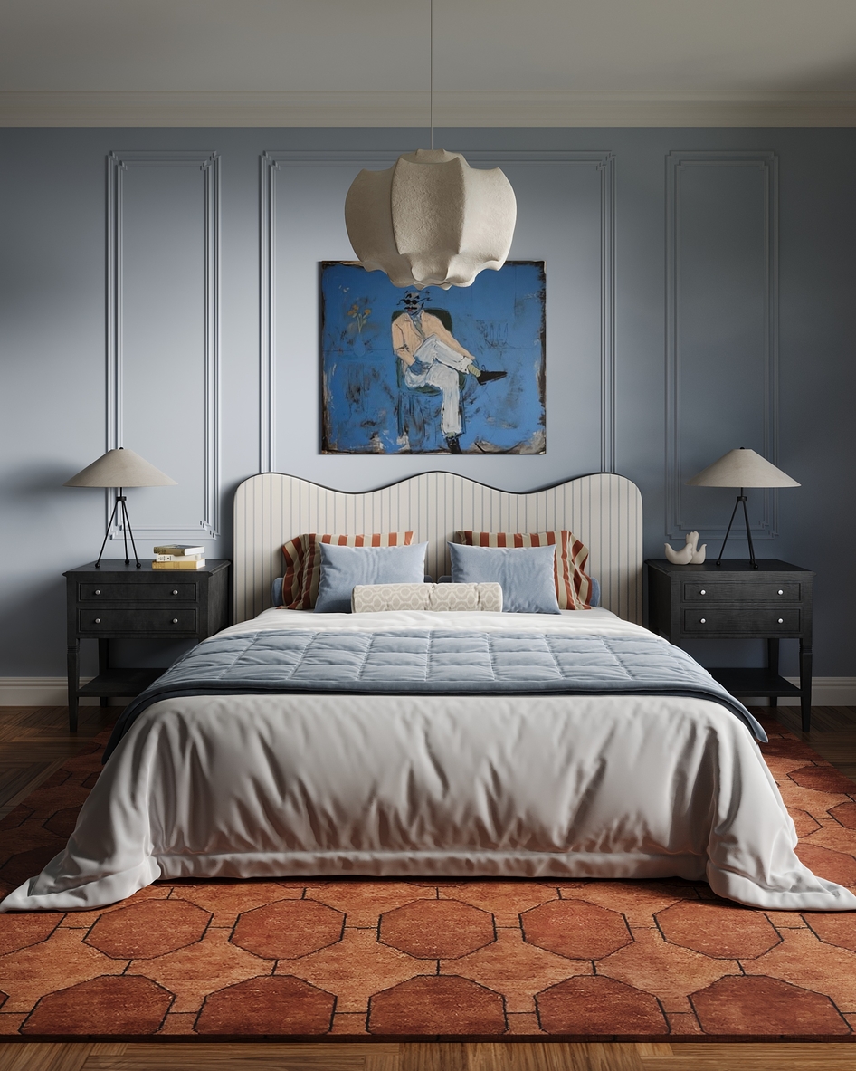 This bedroom has a bold and colorful personality that really stands out. The lighting and material choices are well executed and bring the space to life. Just one small note: some objects like lamps and decor elements feel slightly off-balance in their placement. A bit more visual symmetry could enhance the overall impact.