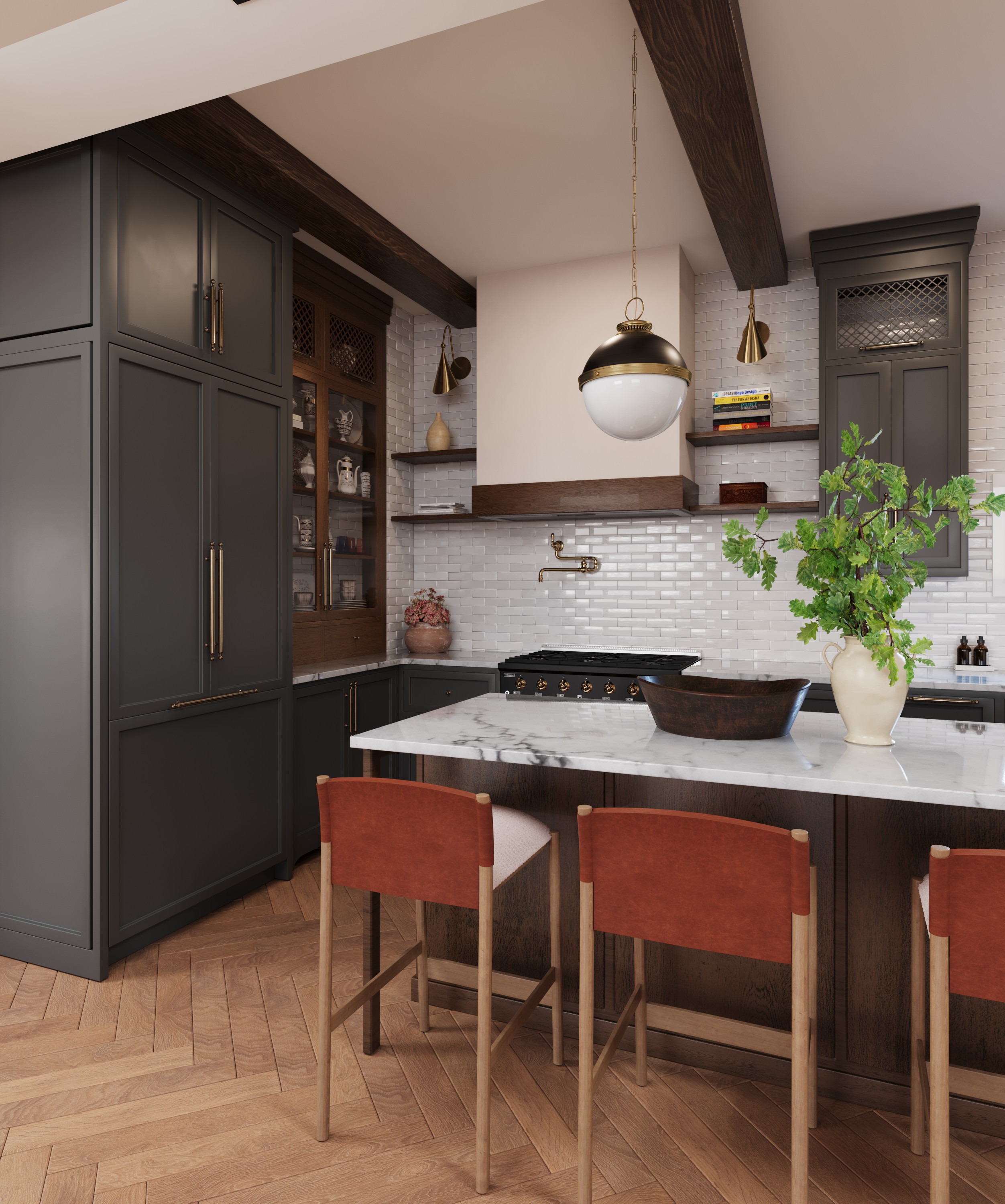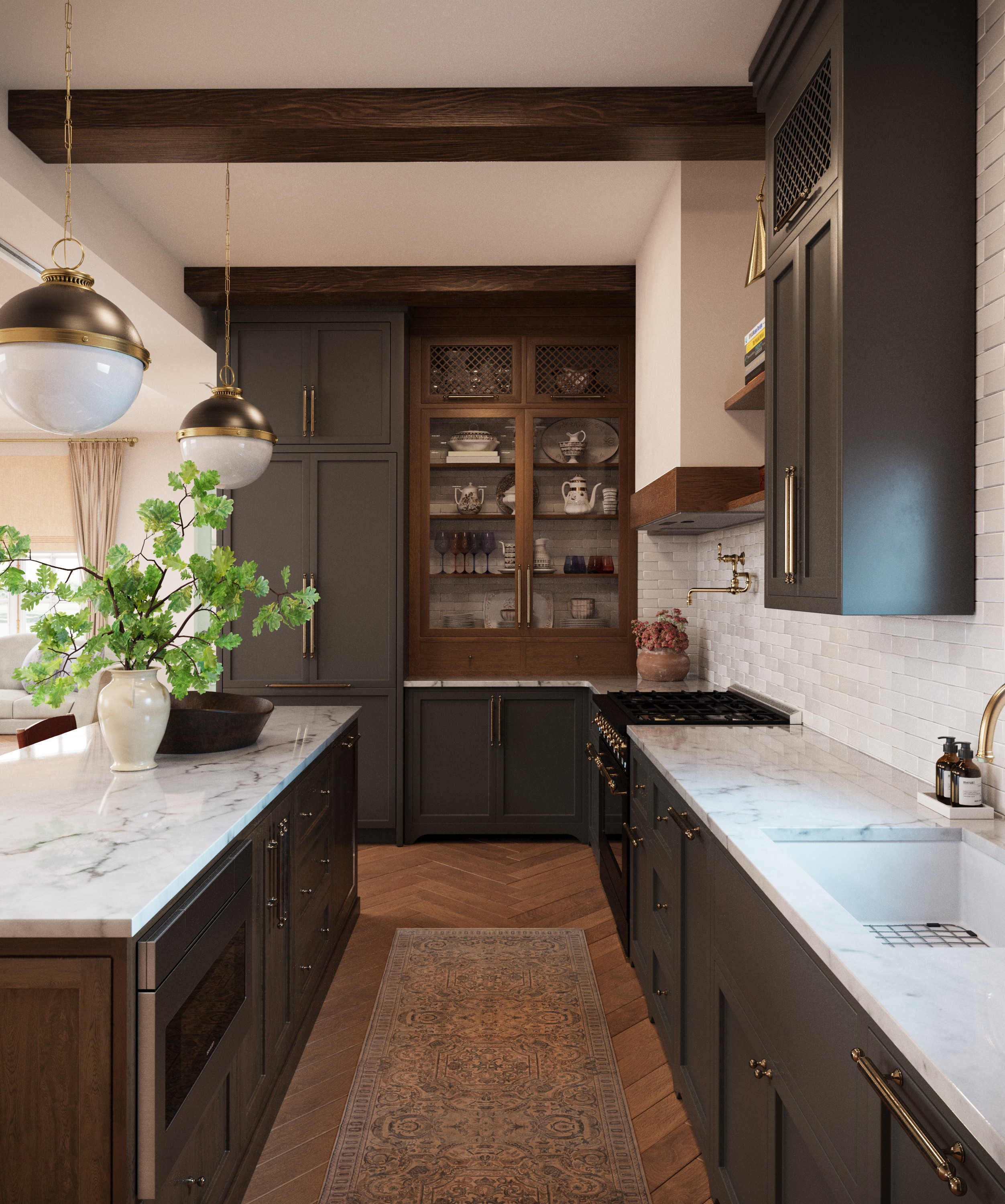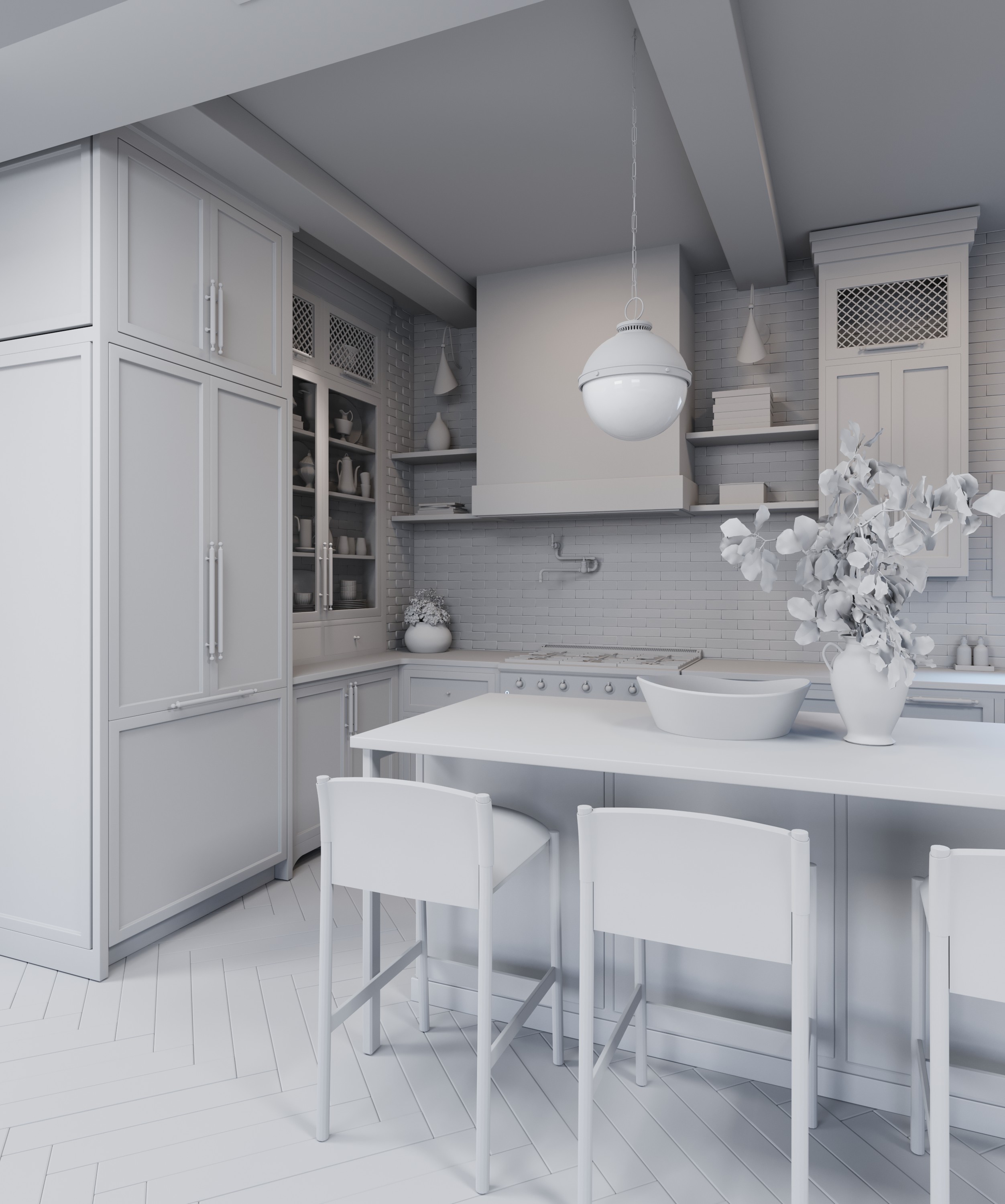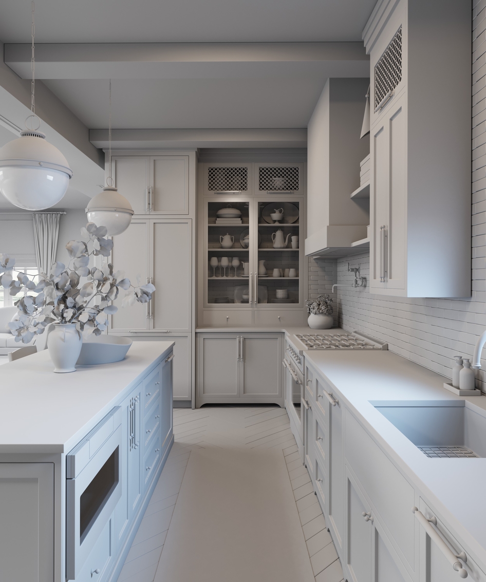 The kitchen is referencing the subtle gold accents and organic details. It was created to demonstrate skills of modeling, texturing and interior visualization. Everything is modelled and textured by me, except small decorative elements. Design leveraged from Pinterest