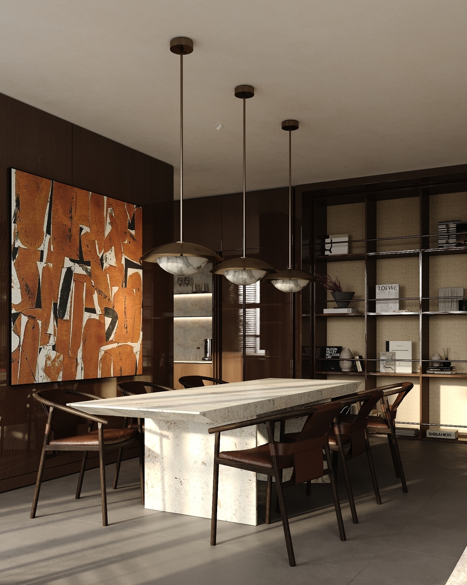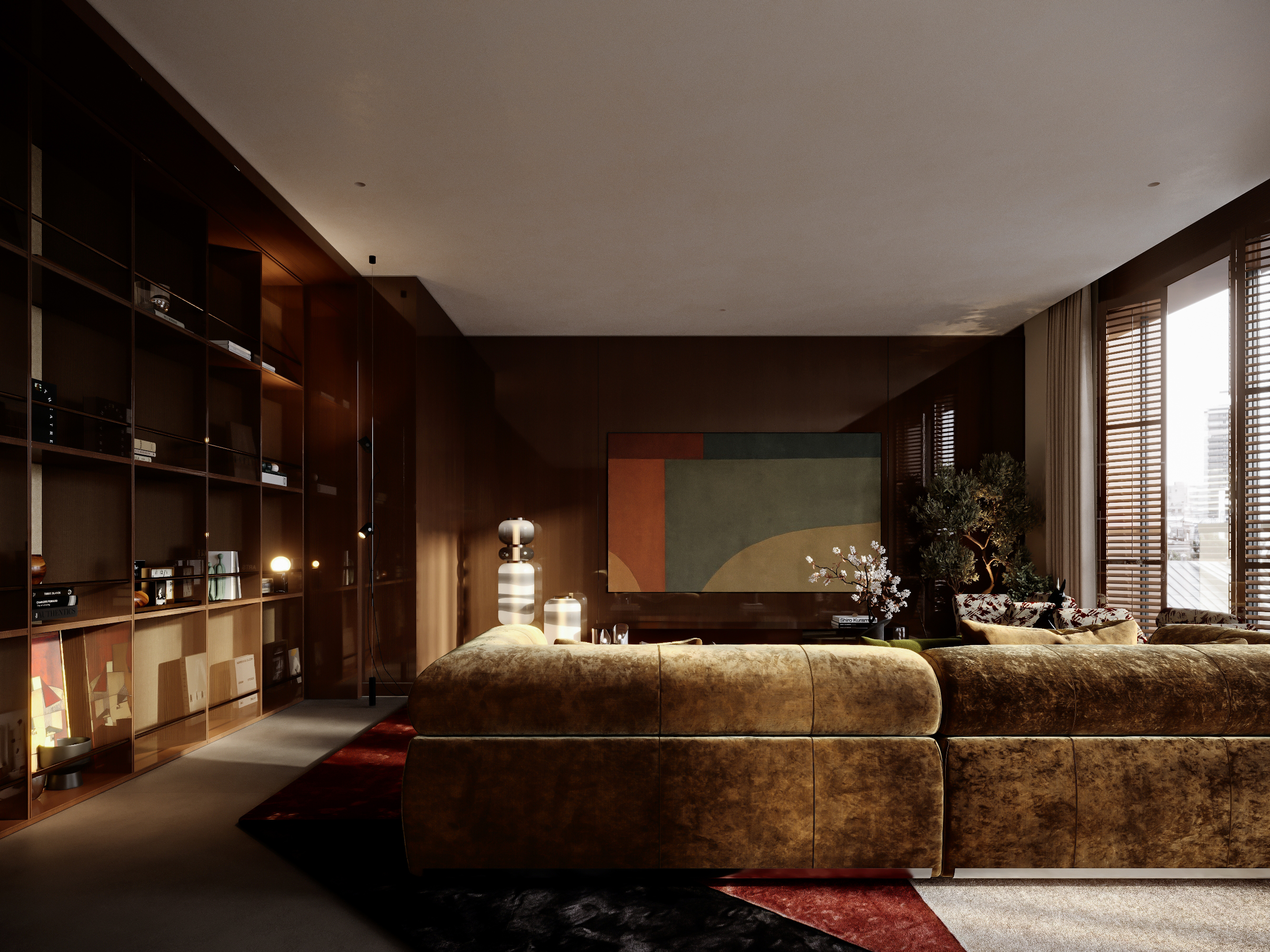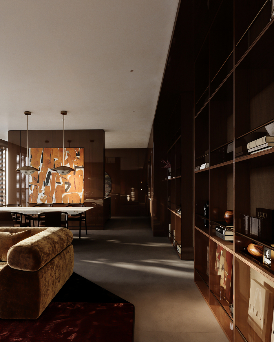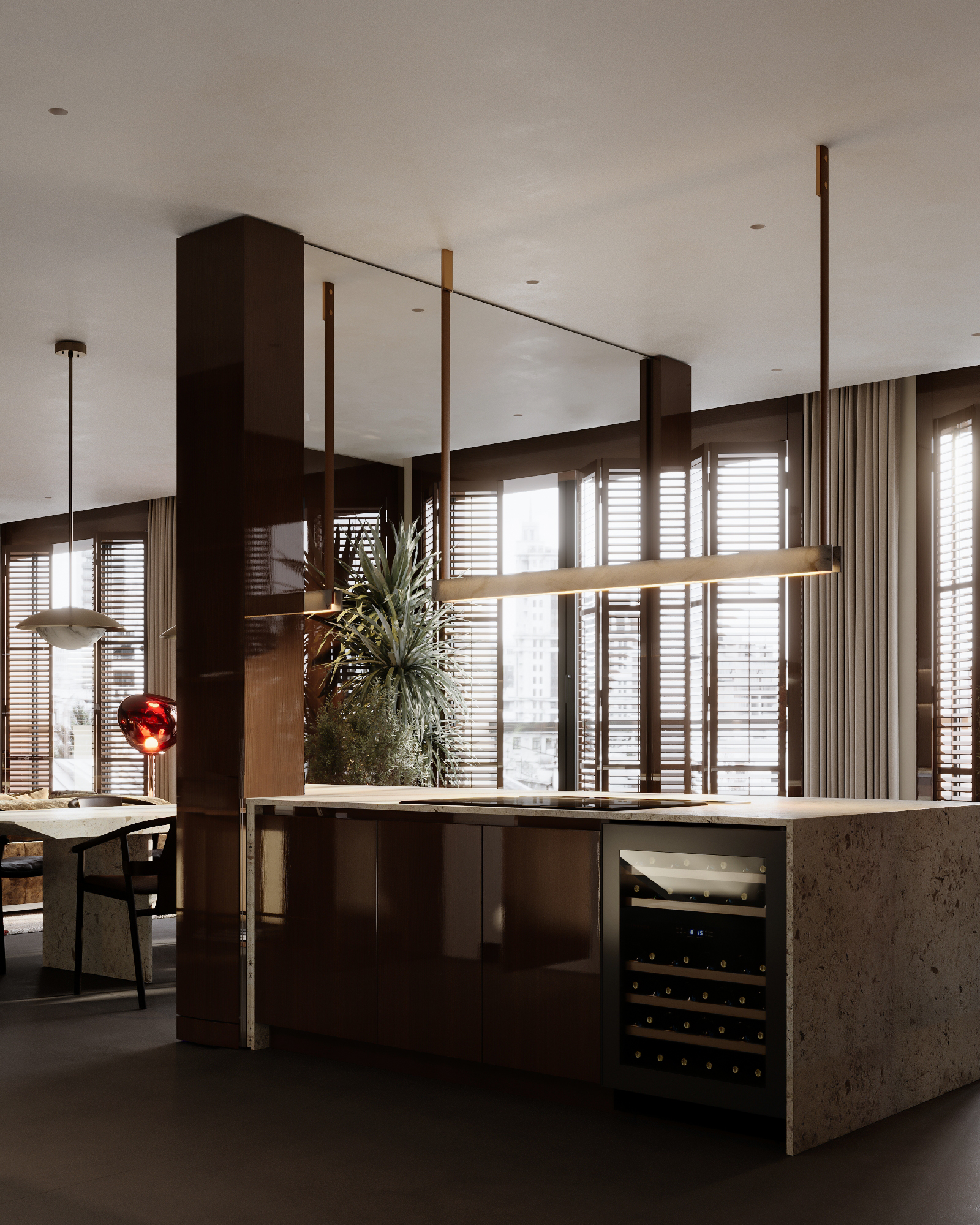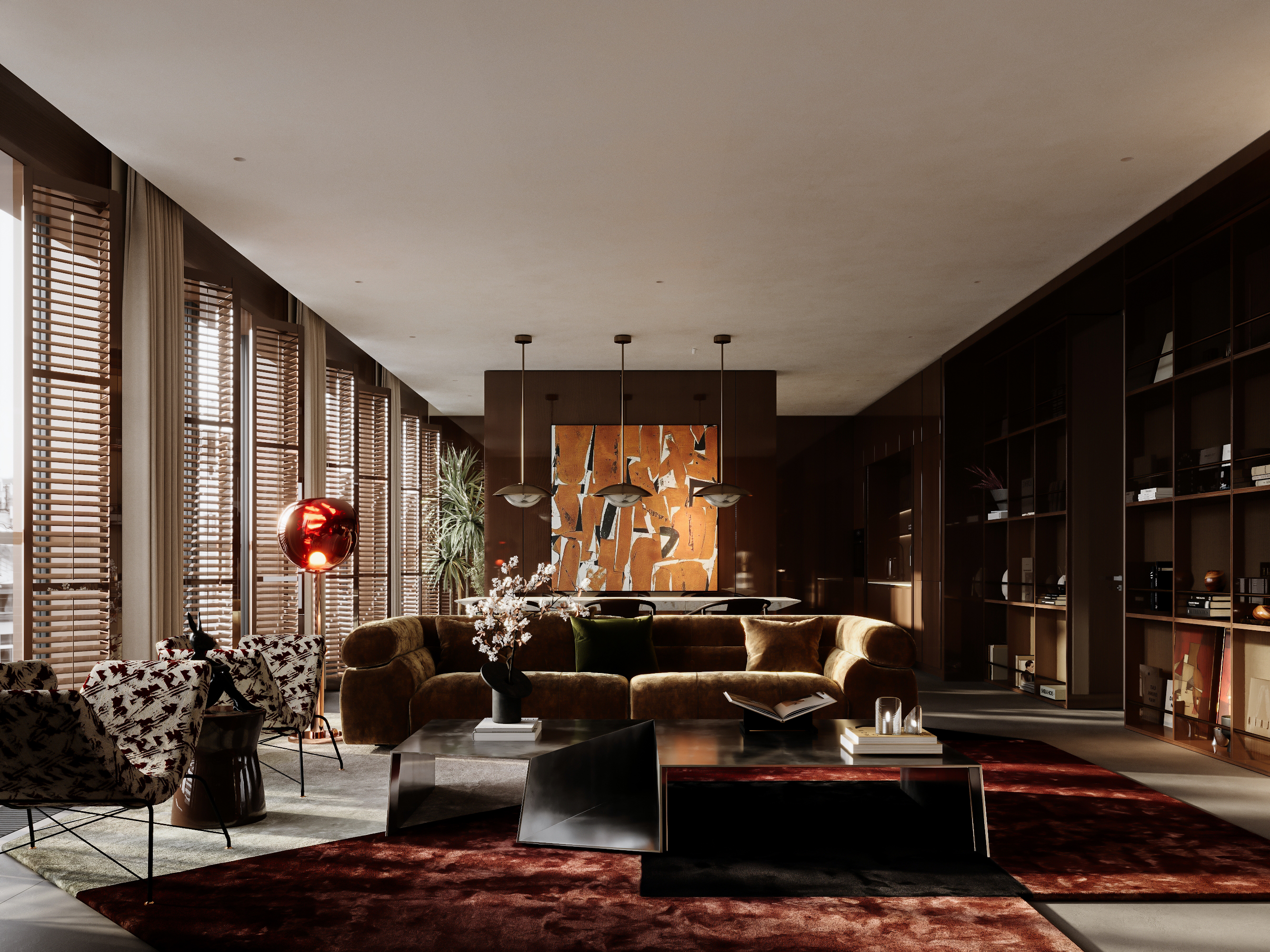 Step back in time to an era of bold optimism and unapologetic color. This open-concept kitchen and living area is a vibrant celebration of retro design, where lively hues, sleek lacquered furniture, and playful patterns create a space that is both nostalgic and exhilaratingly fresh.
