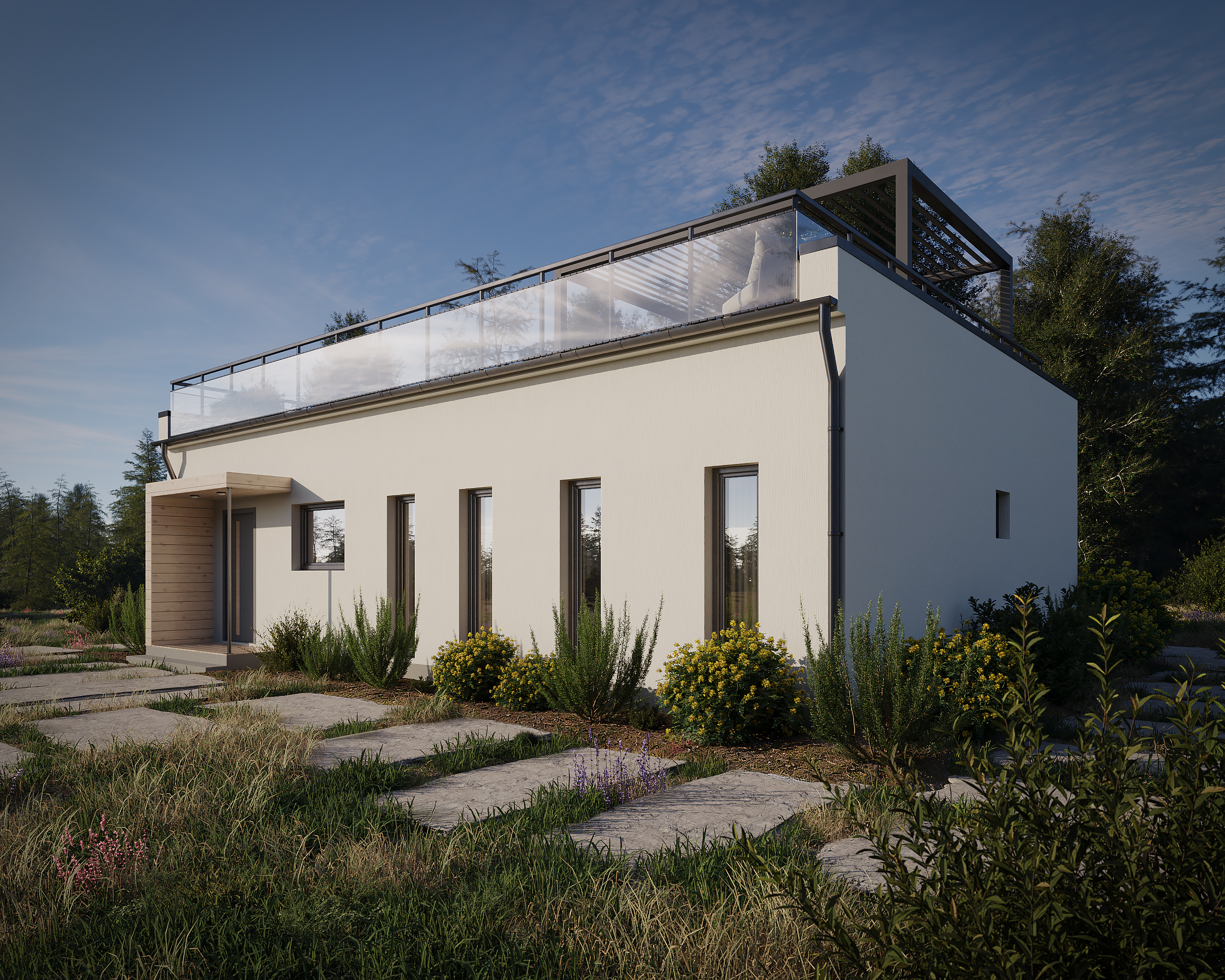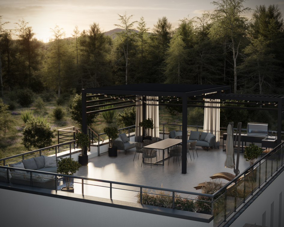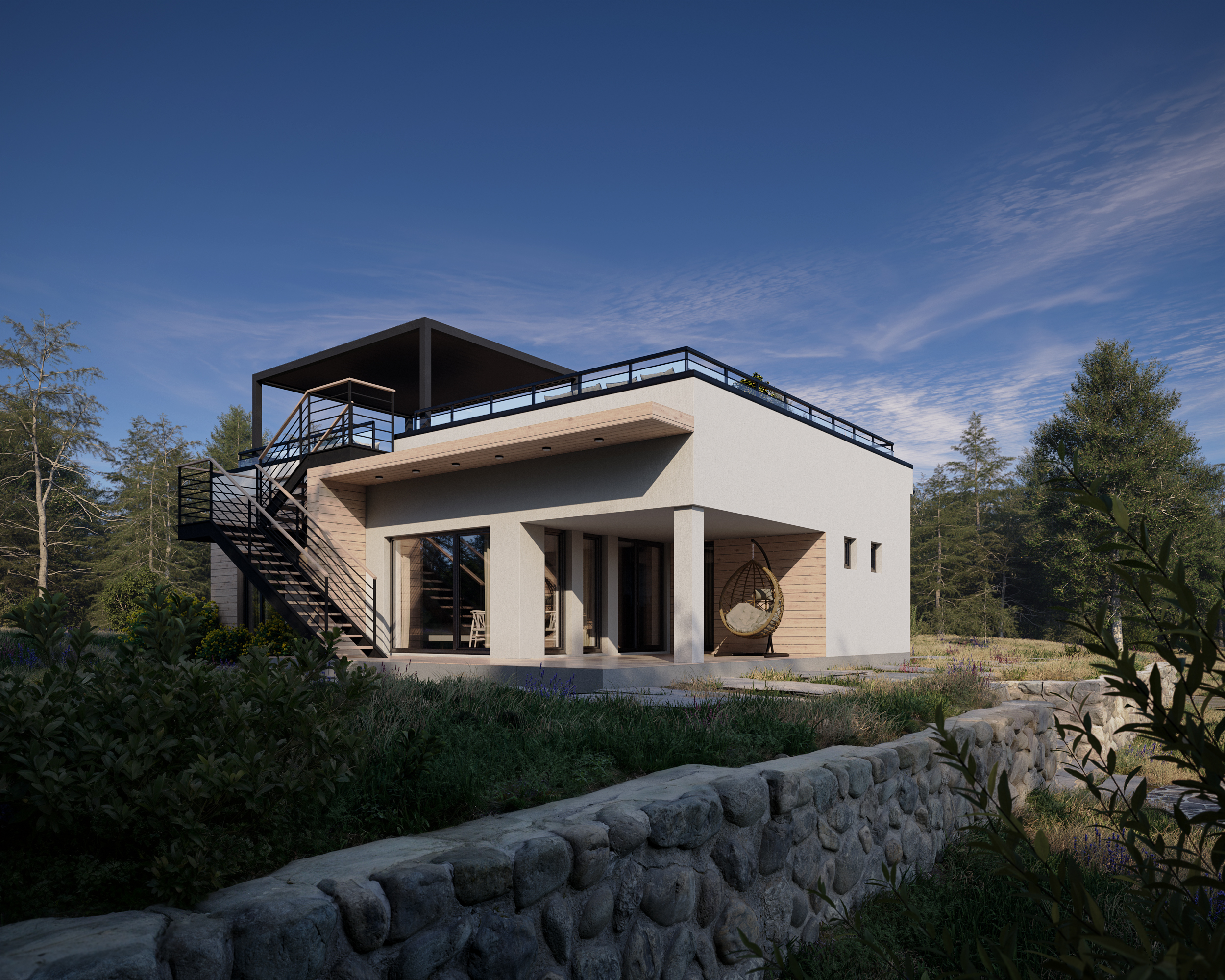 В кульминационной летней версии дом предстаёт в своей самой открытой ипостаси: с лестницей, ведущей на эксплуатируемую кровлю, что создаёт идеальную картину для жизни на свежем воздухе.