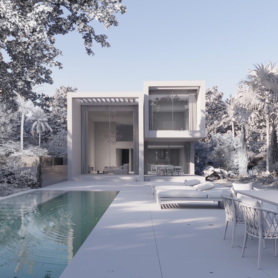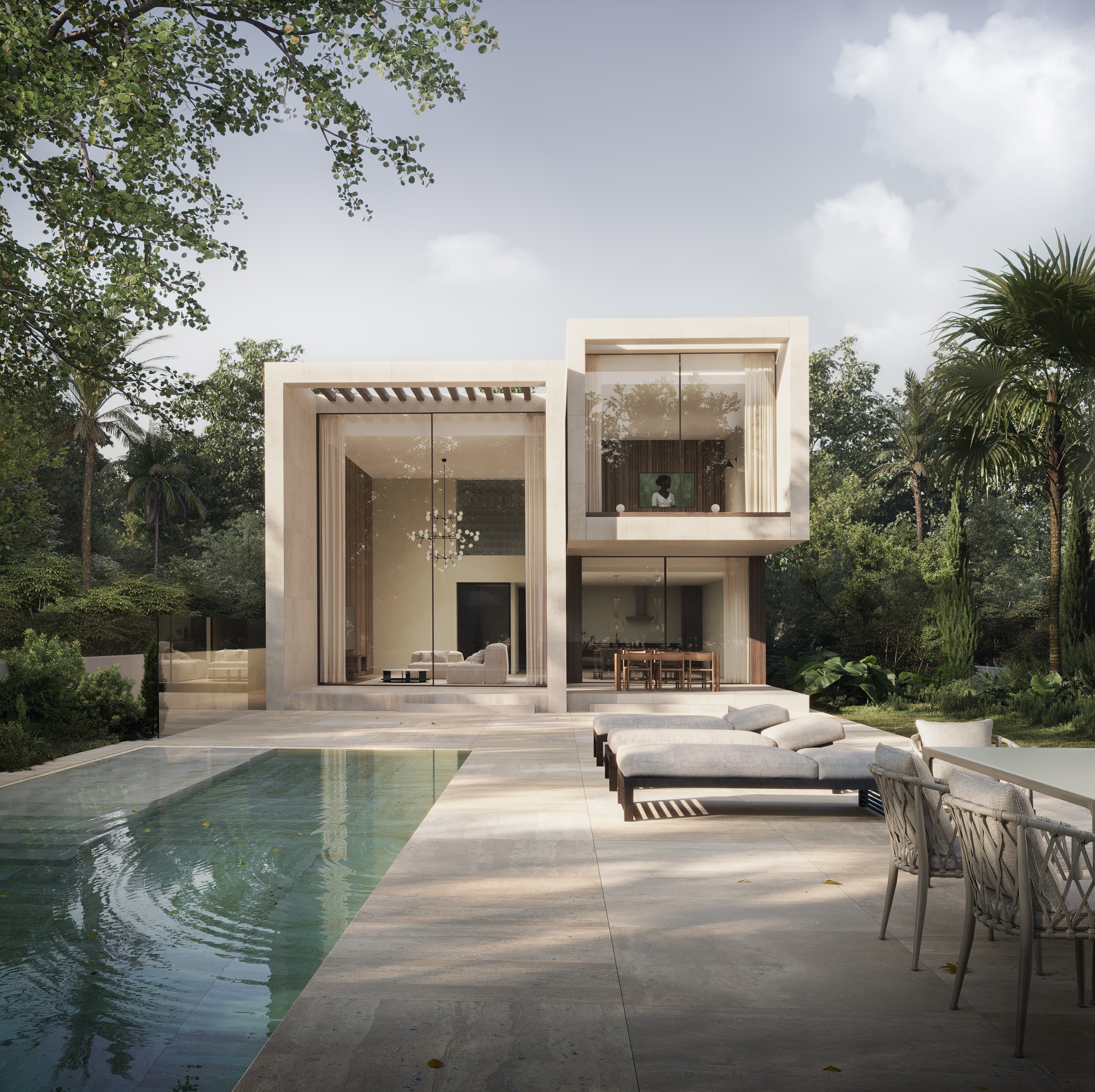 . This exterior design showcases its clean lines, warm stone, and expansive glass converge in this serene modern retreat. Surrounded by nature and reflected in the stillness of the pool, the home embodies effortless balance between sophistication and calm. Key software: 3dsmax, Corona Render, ForestPack and Railclone. Post-production done in Photoshop.