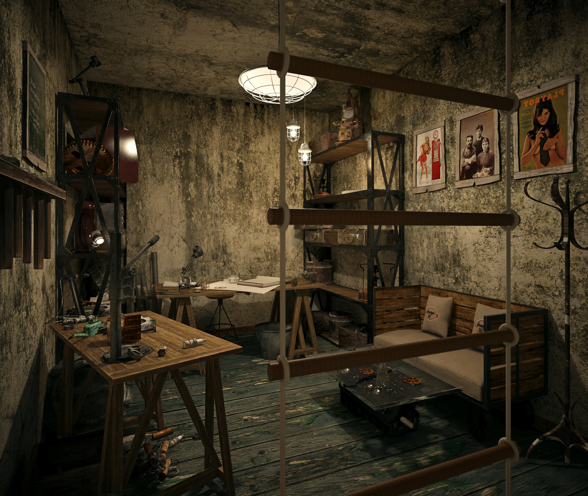 Квест состоит из трёх помещений сначала лифт затем попадаешь в тех. помещение а с него на второй уровень в эту комнату. Все это создавалось для декораторов т.е по заданию надо было показать общую тематику настроение так сказать..