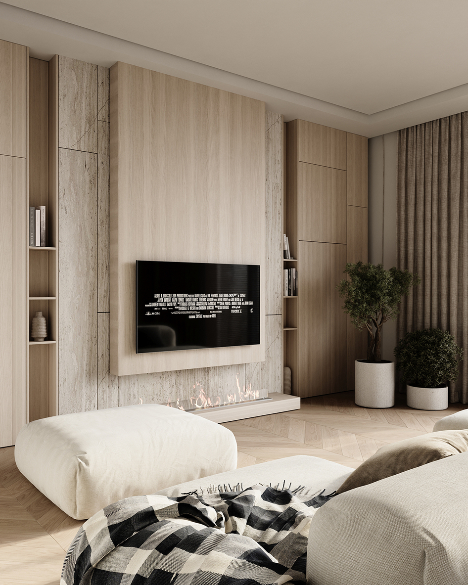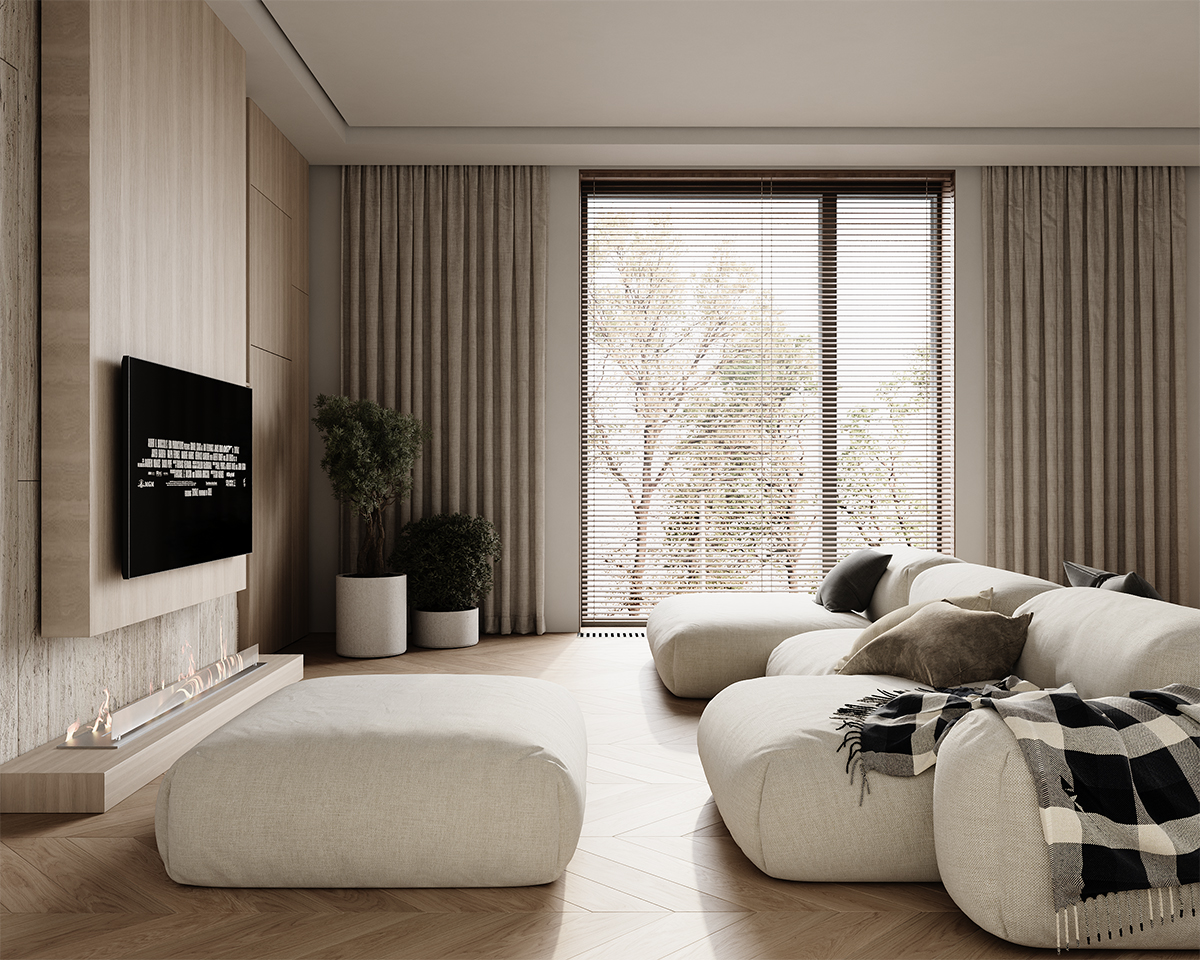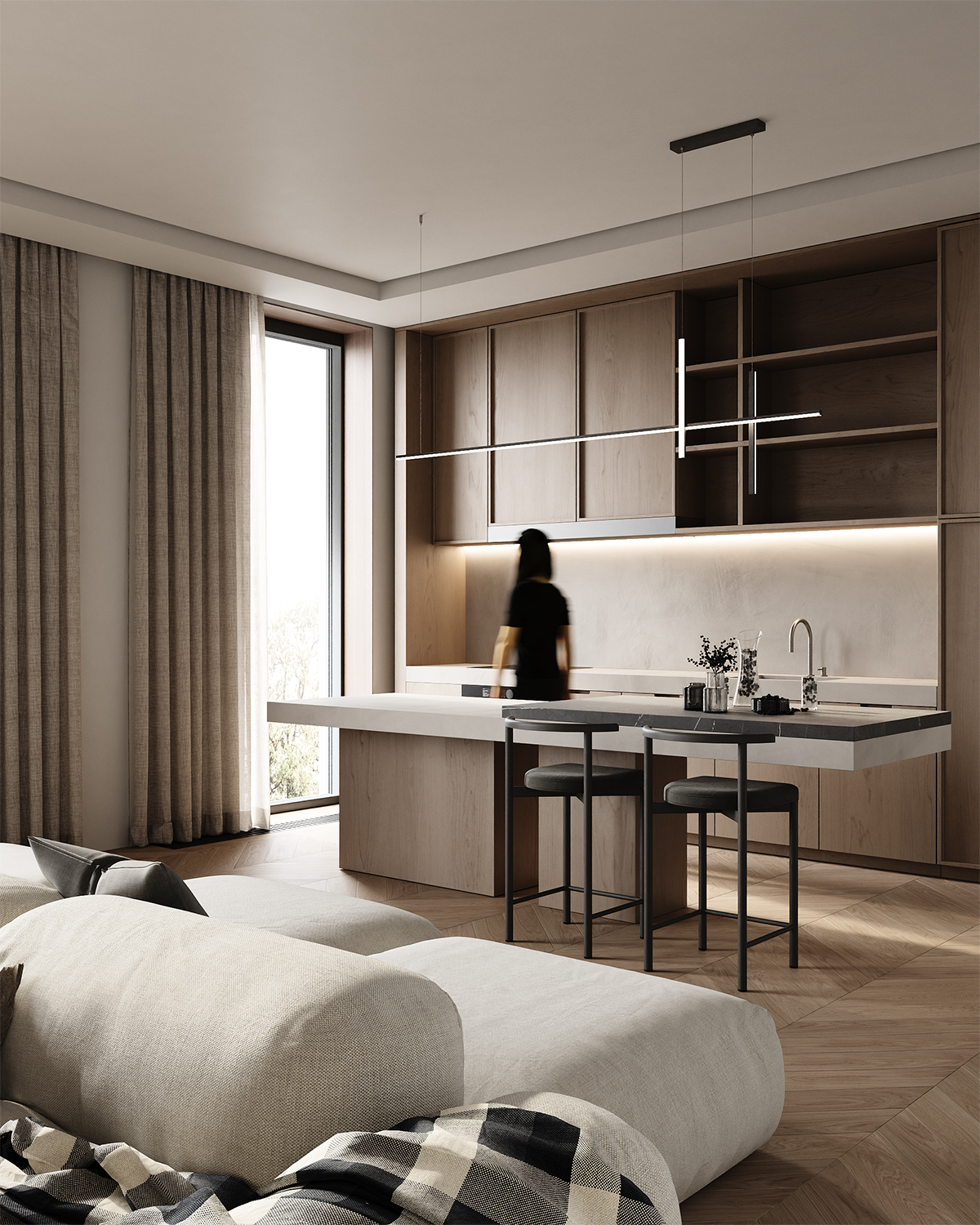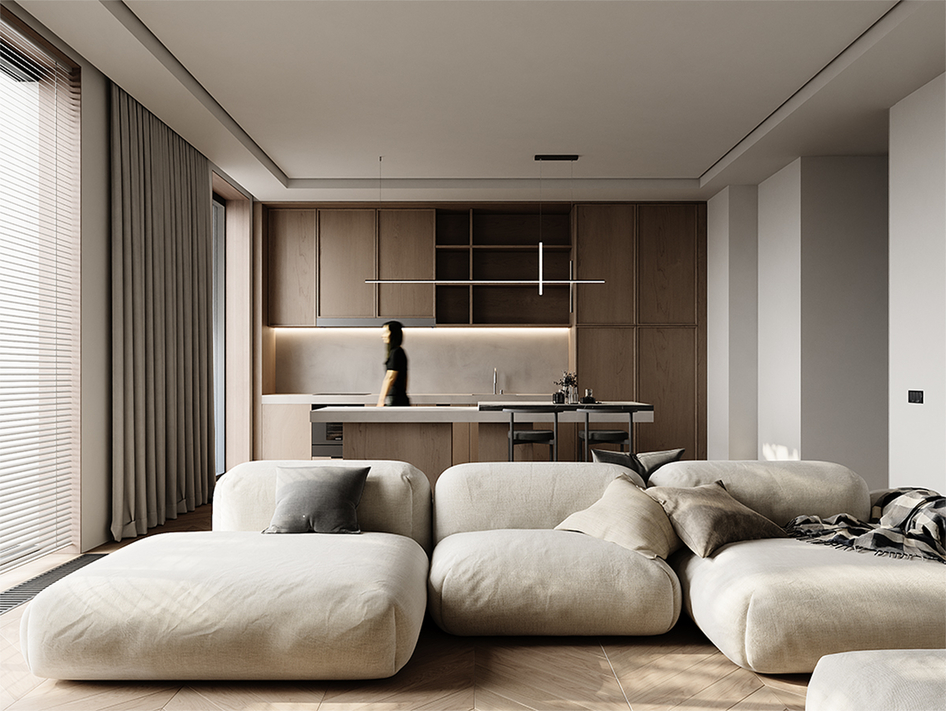 This design presents a sophisticated open-plan interior with a warm, minimalist aesthetic. Natural wood tones, soft neutrals, and clean lines create a serene, elegant atmosphere, balancing functionality and comfort through refined details, integrated storage, and subtle lighting.