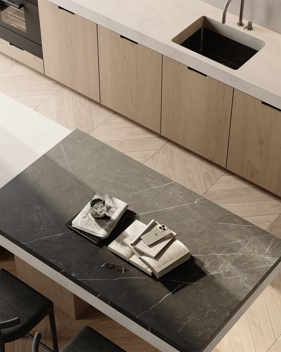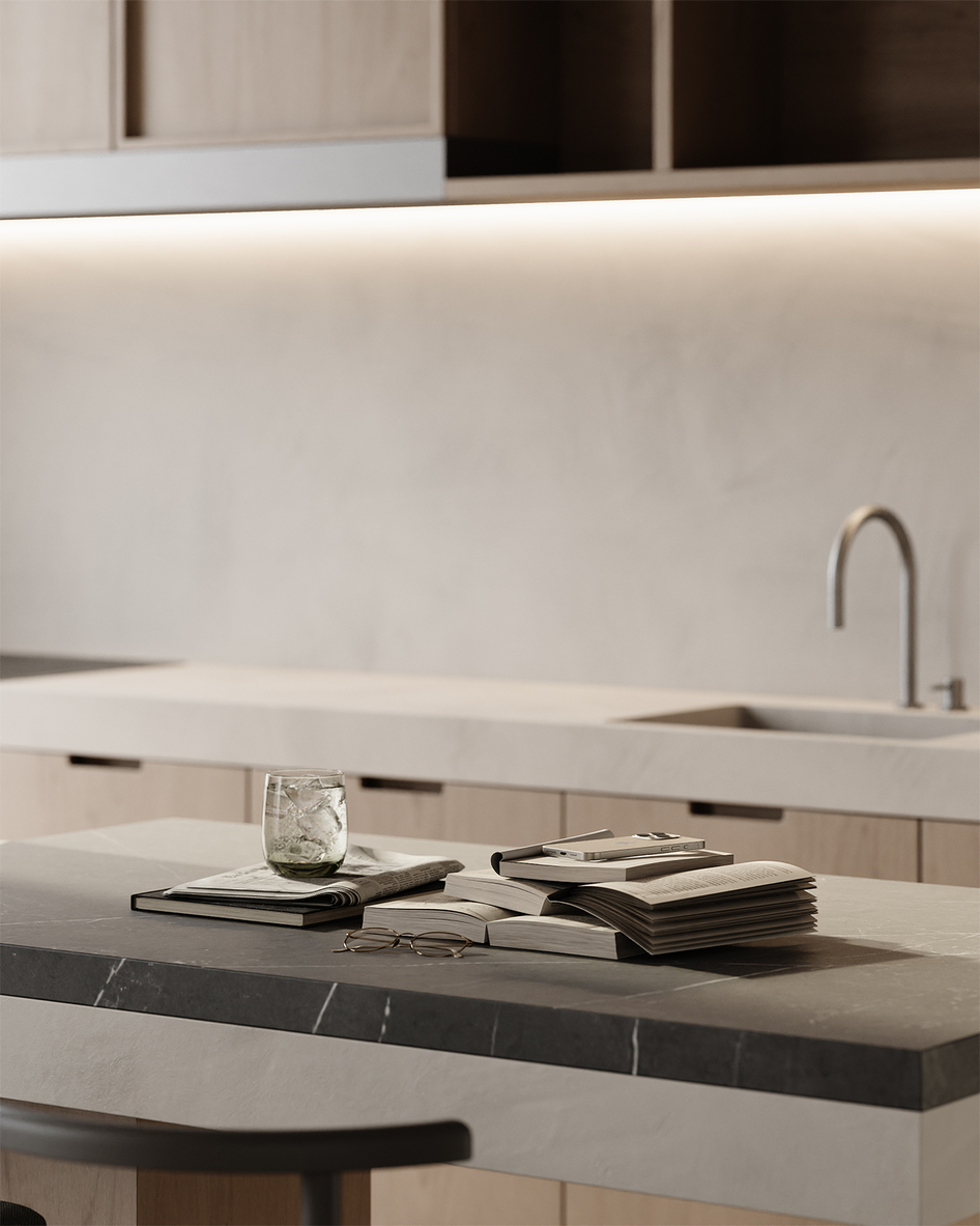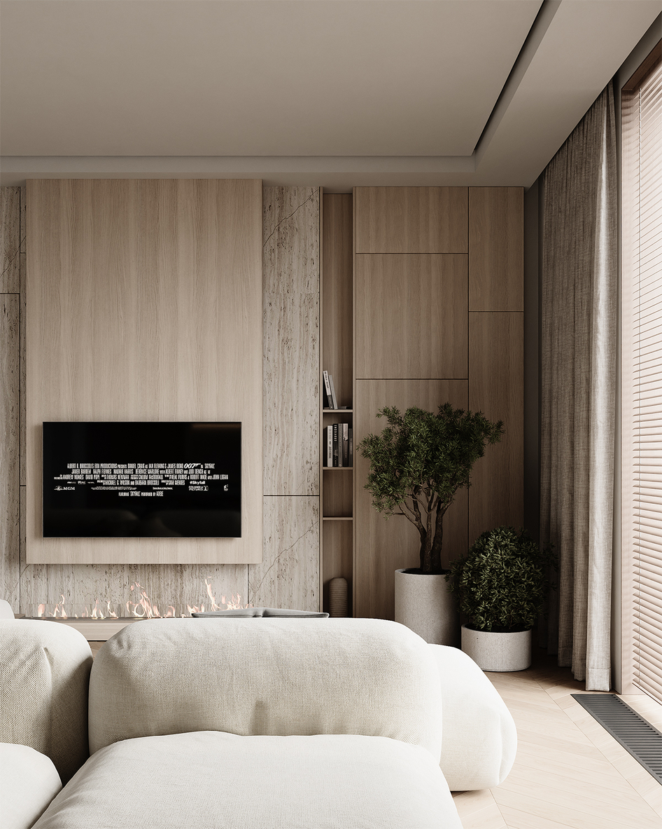 This design presents a sophisticated open-plan interior with a warm, minimalist aesthetic. Natural wood tones, soft neutrals, and clean lines create a serene, elegant atmosphere, balancing functionality and comfort through refined details, integrated storage, and subtle lighting.