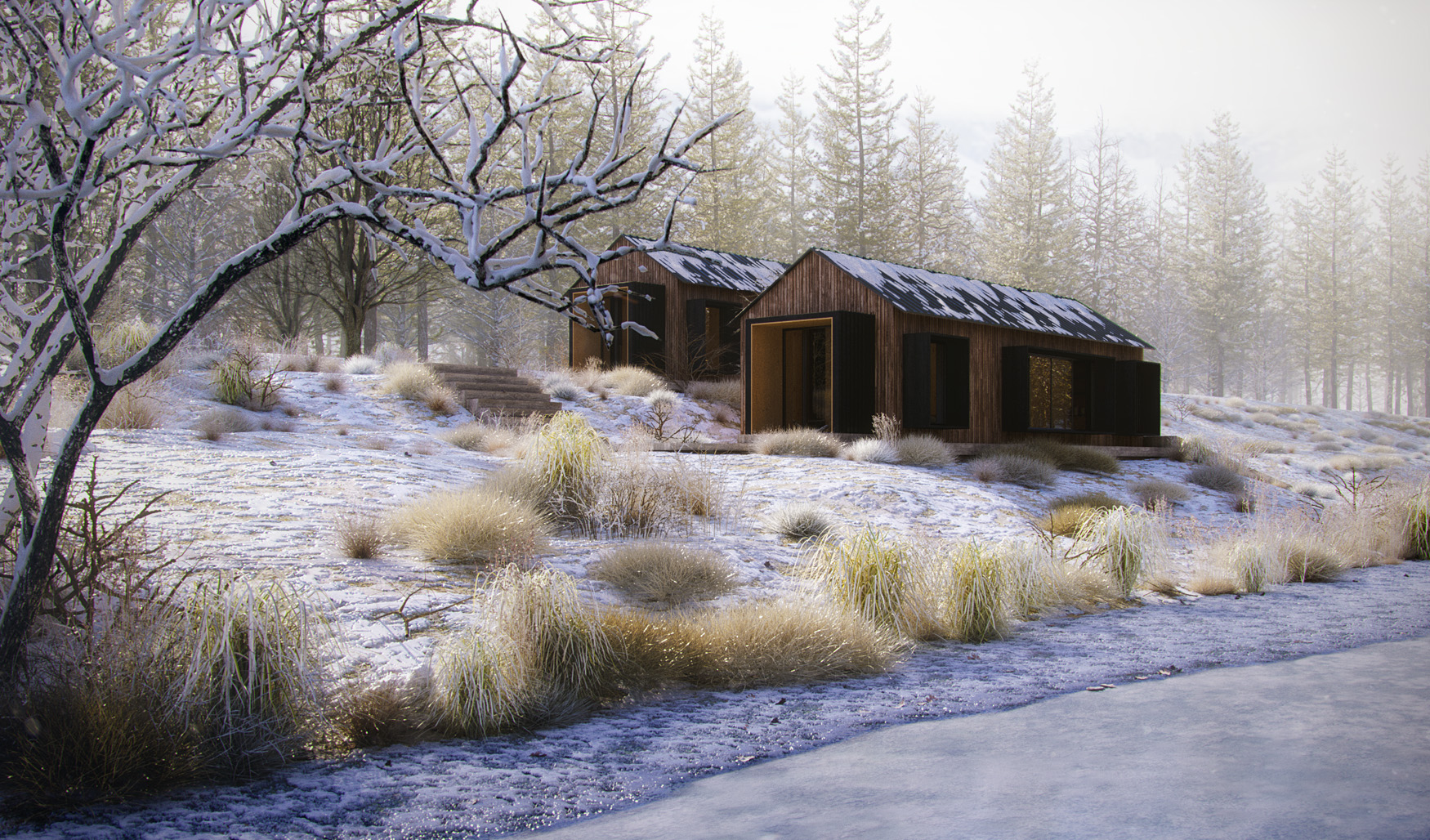Задний домик в упор смотрит в передний, надо было раздвинуть, чтобы в окна обоих раскрывался пейзаж.