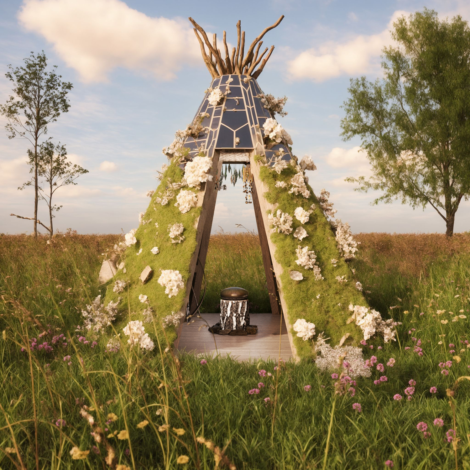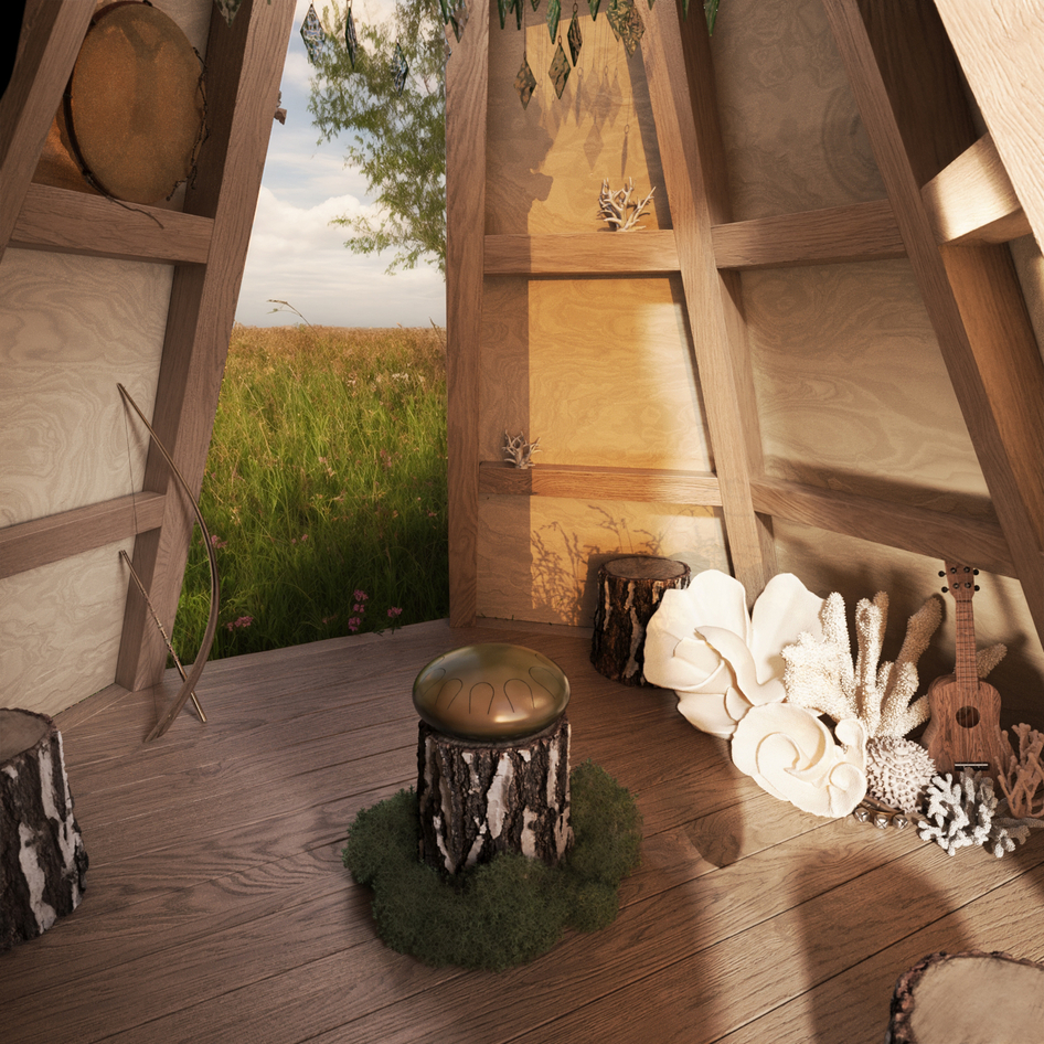 Работа подготовлена для конкурса арт-объектов на фестиваль "Дикая мята". Тики-риф - пространство для джемов наполненное различными инструментами с центром в виде глюкофона.