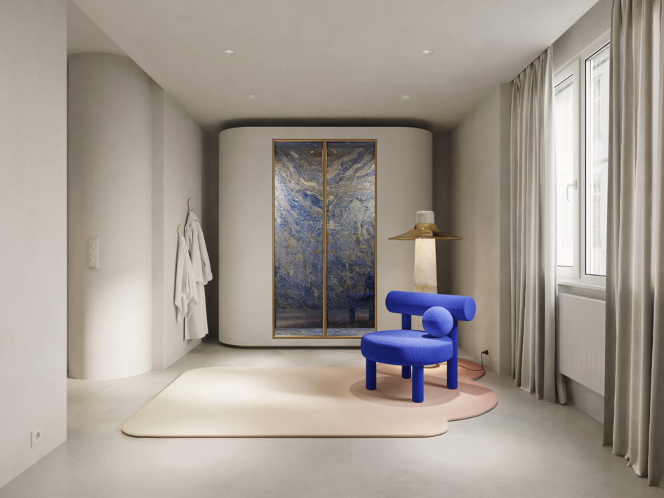 современно,оригинально) а что за бренд подвеса над столом? и стульчик синий?