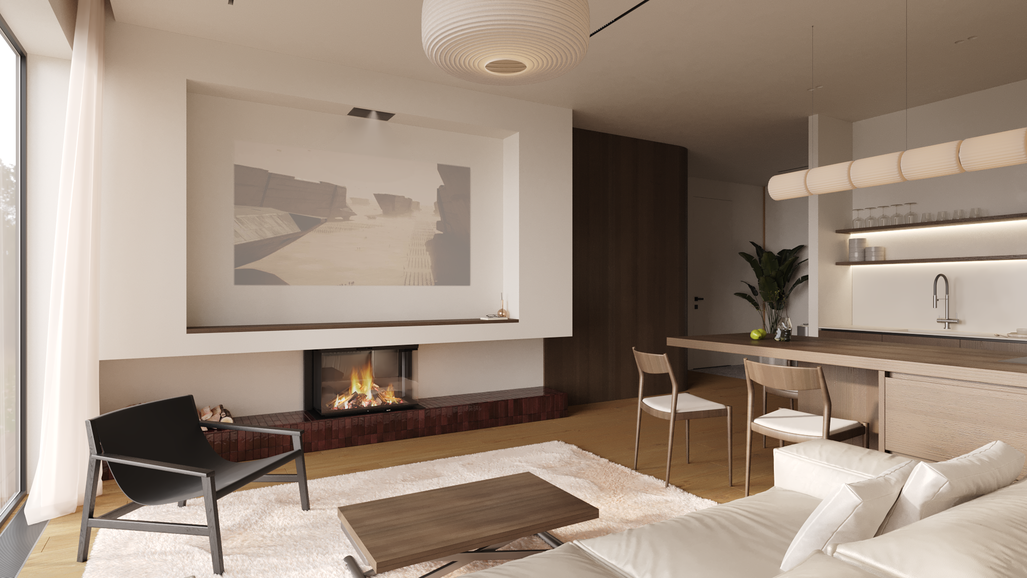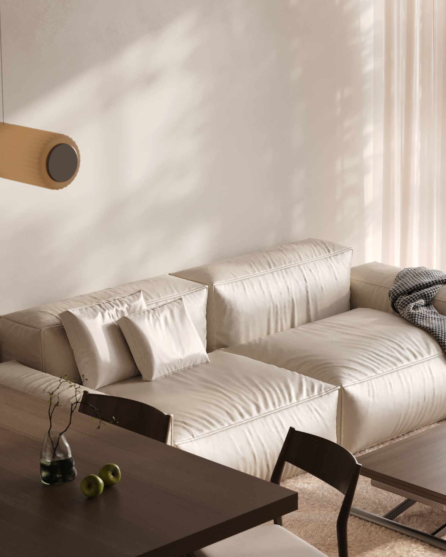 Уютный и минималистичный проект визуализации интерьера, объединяющий гостиную и столовую зону. Дизайн фокусируется на открытом пространстве, мягком дневном свете и балансе дерева, белого и нейтральных тонов.