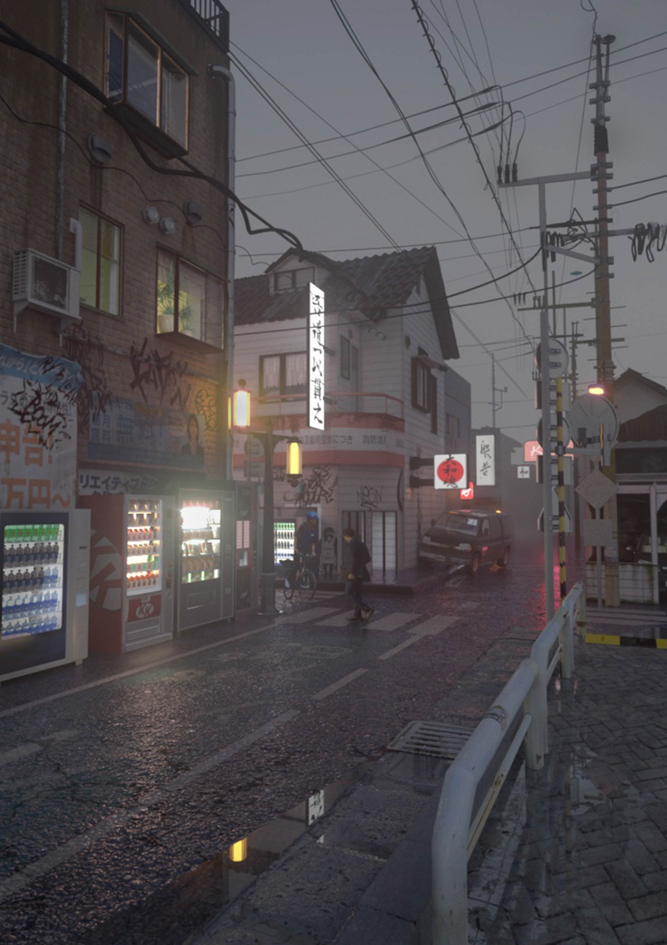 ИМХО, конечно, но что-то не так с пропорциями: текстура асфальта слишком крупная, торговые автоматы великоваты, вход в магазин (где бусик припаркован) низковат.