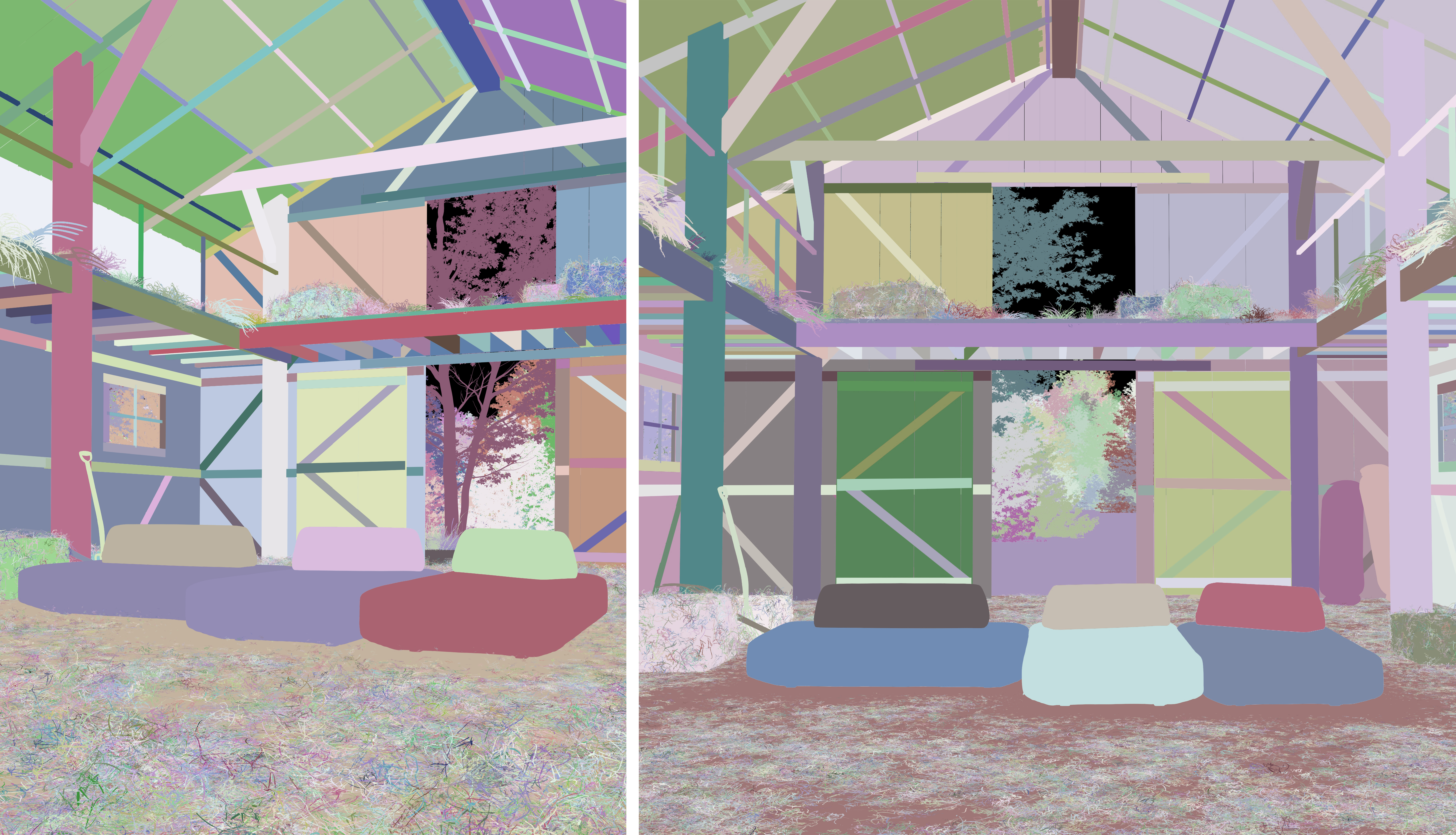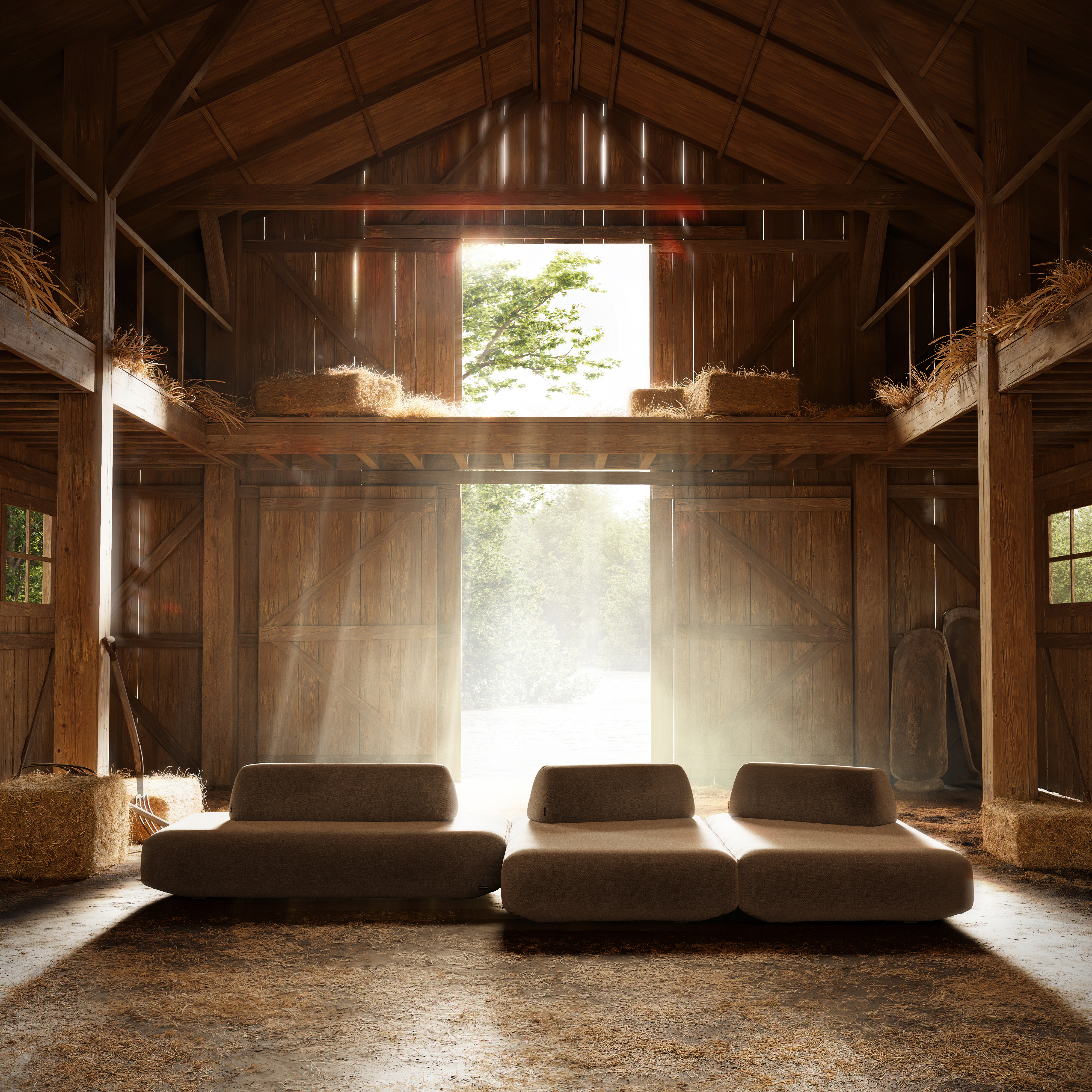 Modeling: 3ds Max Hay and vegetation: Forest Pack Character (woman): AI-generated Lighting and post-production: Photoshop