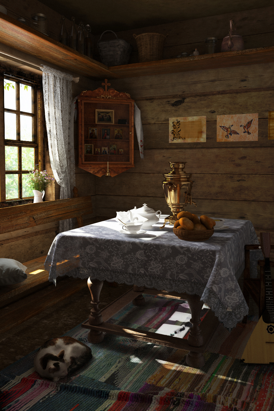 Попыталась изобразить интерьер,воссоздающий атмосферу русской избы)Самое большое и красивое место в крестьянском доме, где принимали пищу и встречали гостей была горница. Это была одновременно и гостиная, и столовая, а иногда и спальня. В горнице по диагонали от печи устраивали красный угол – часть дома, где устанавливались иконы.