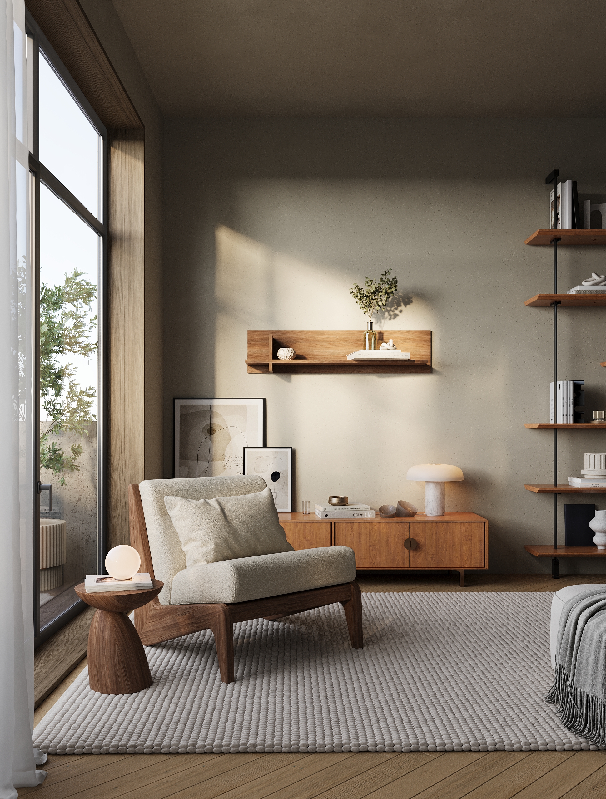 Светлая гостиная с натуральным деревом, мягкими текстурами и спокойной атмосферой. Идеальное место для отдыха с книгой или чашкой чая.