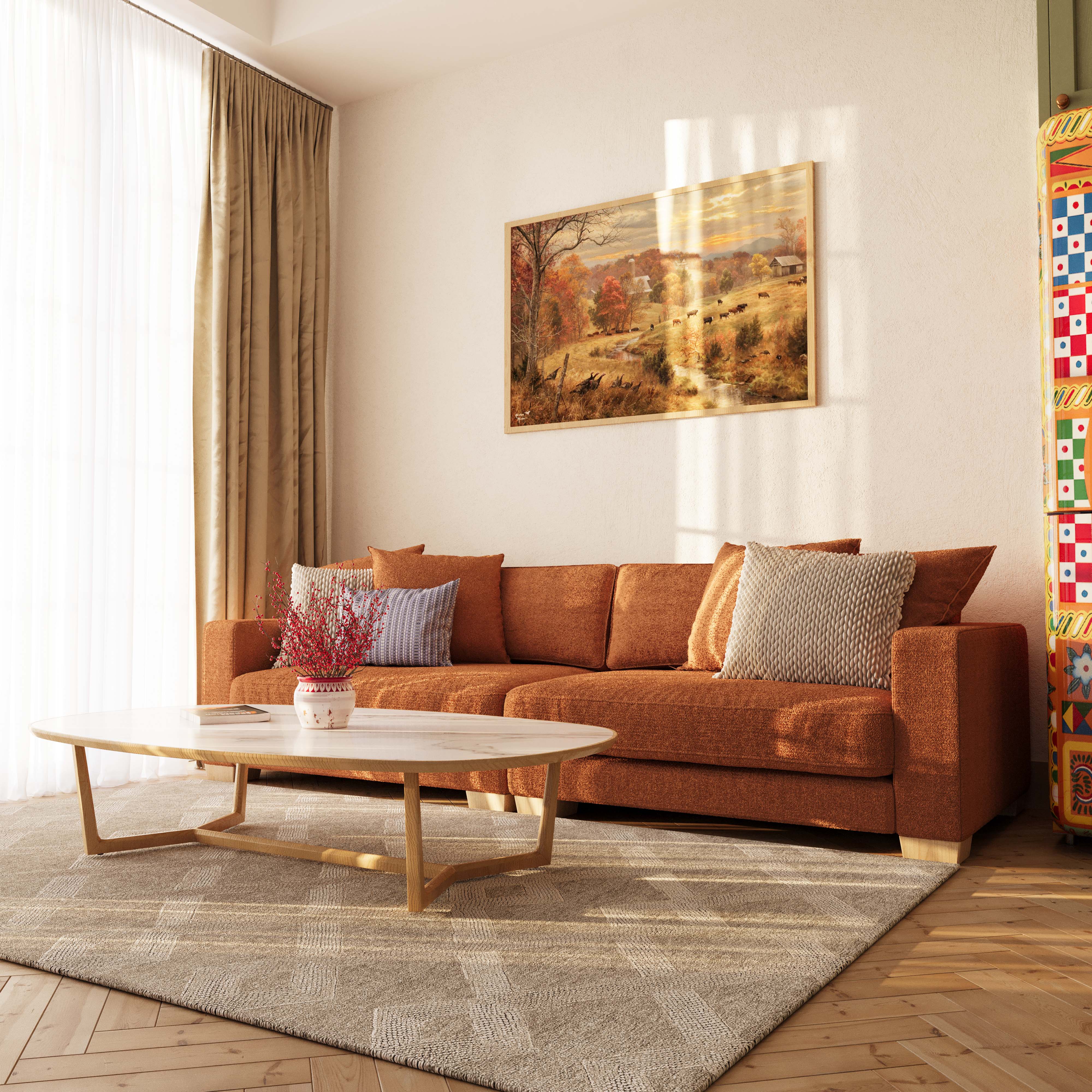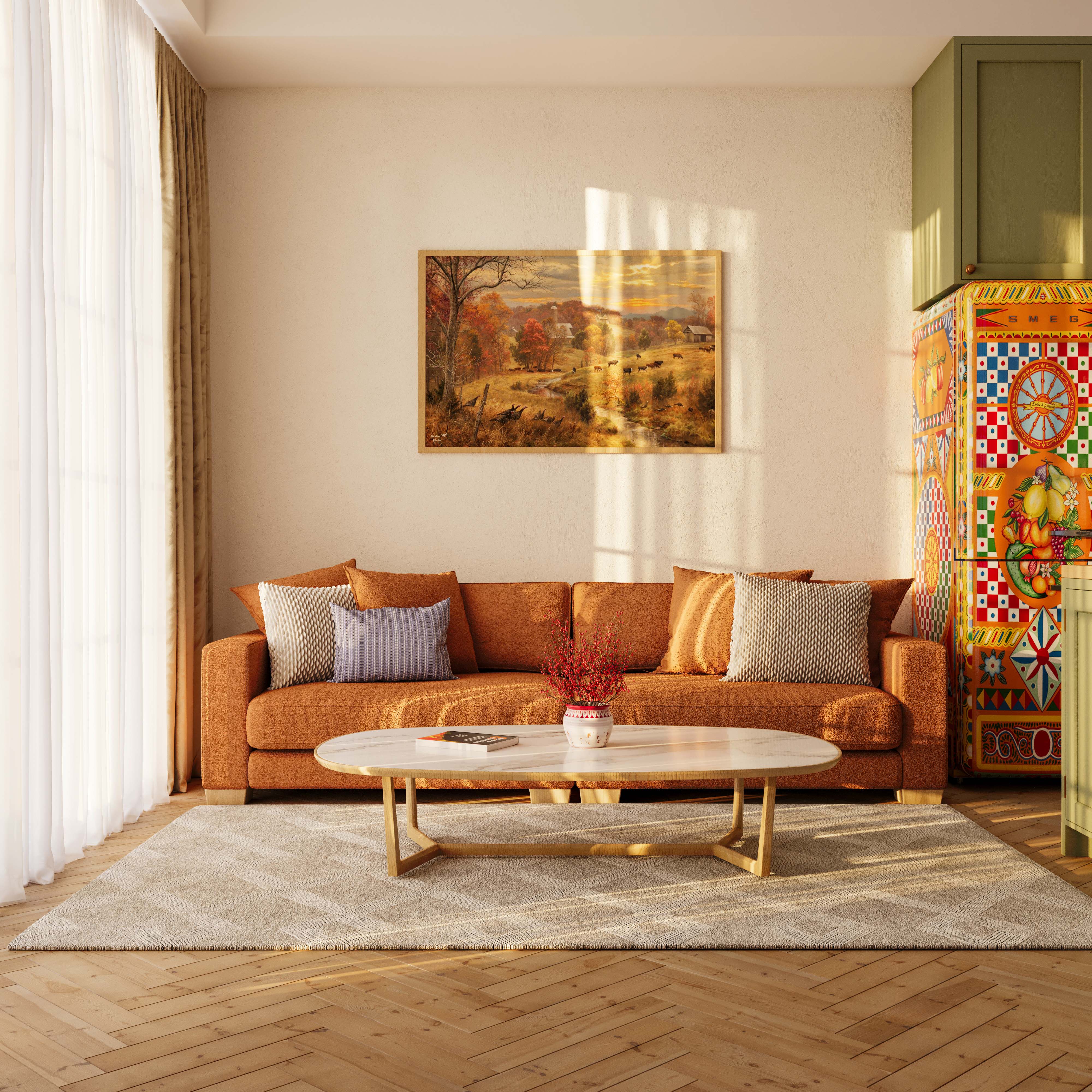 Интерьер выполнен в тёплых, осенних тонах с мягким освещением и элементами ретро-декора. Цель — передать атмосферу уюта и естественного освещения в жилом пространстве.