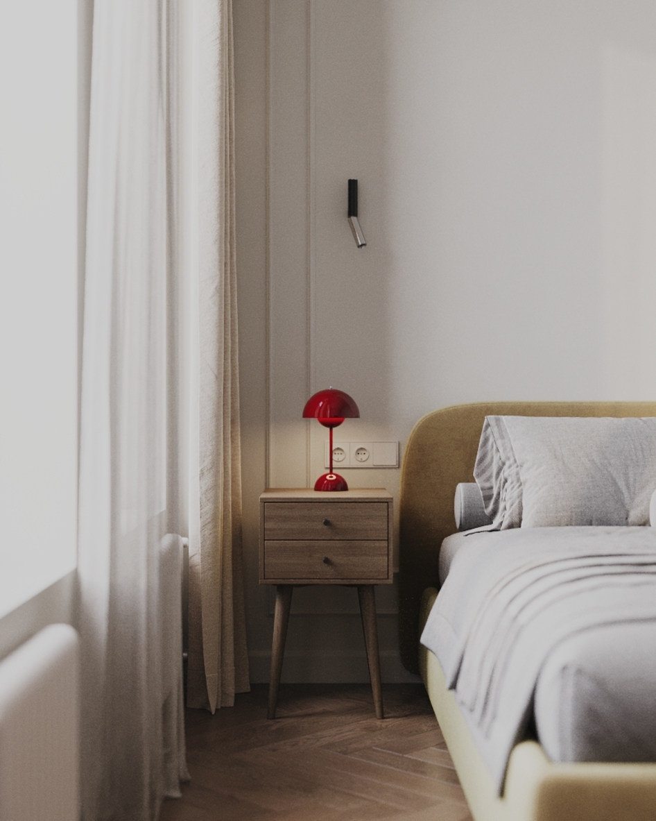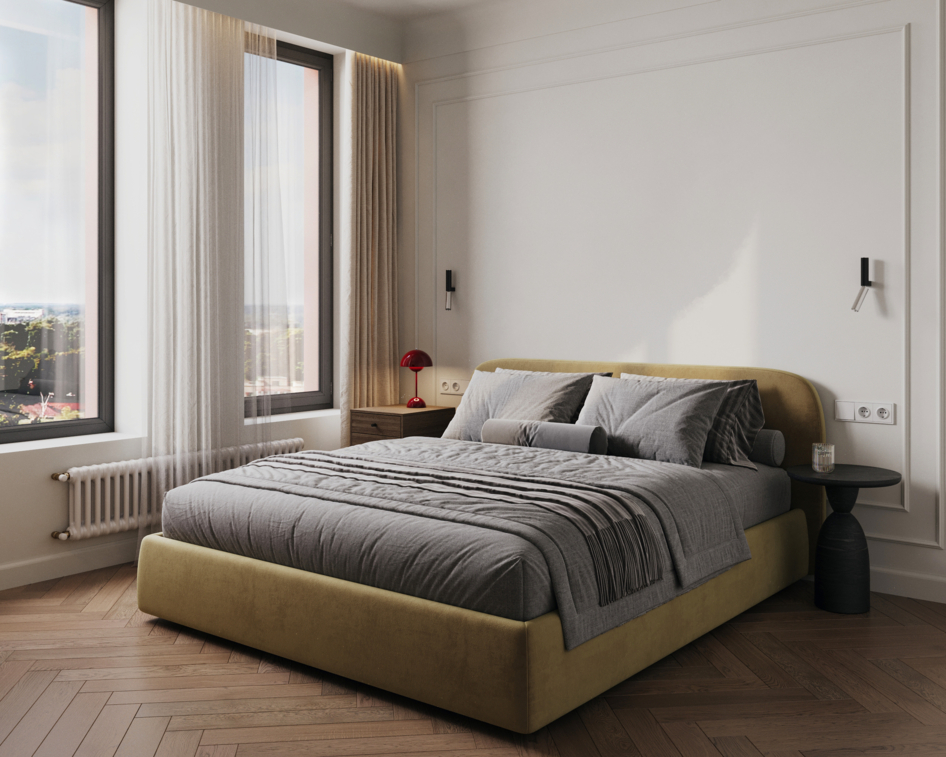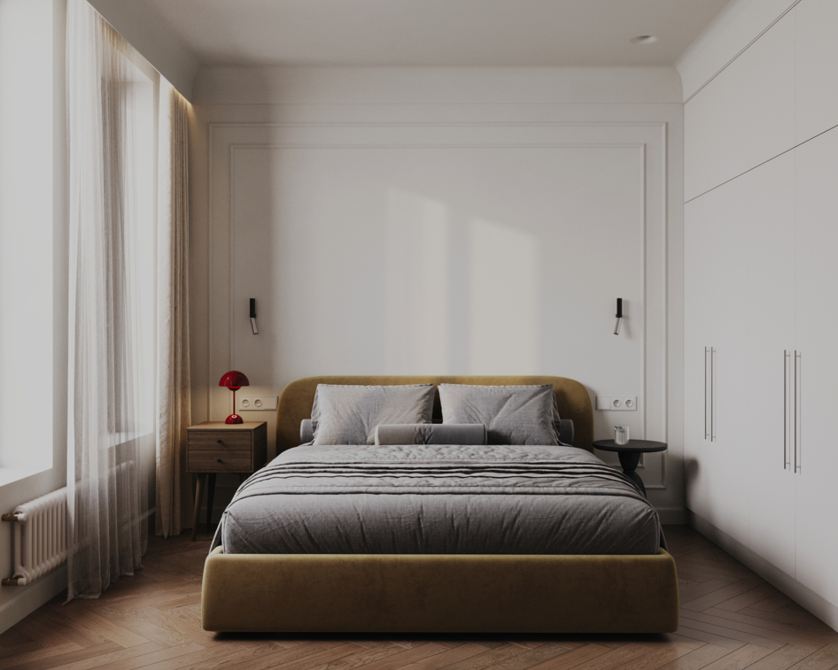 Визуализация ориентирована на ощущение уюта, спокойствия и визуального комфорта, соответствующих функциональному назначению спальни.