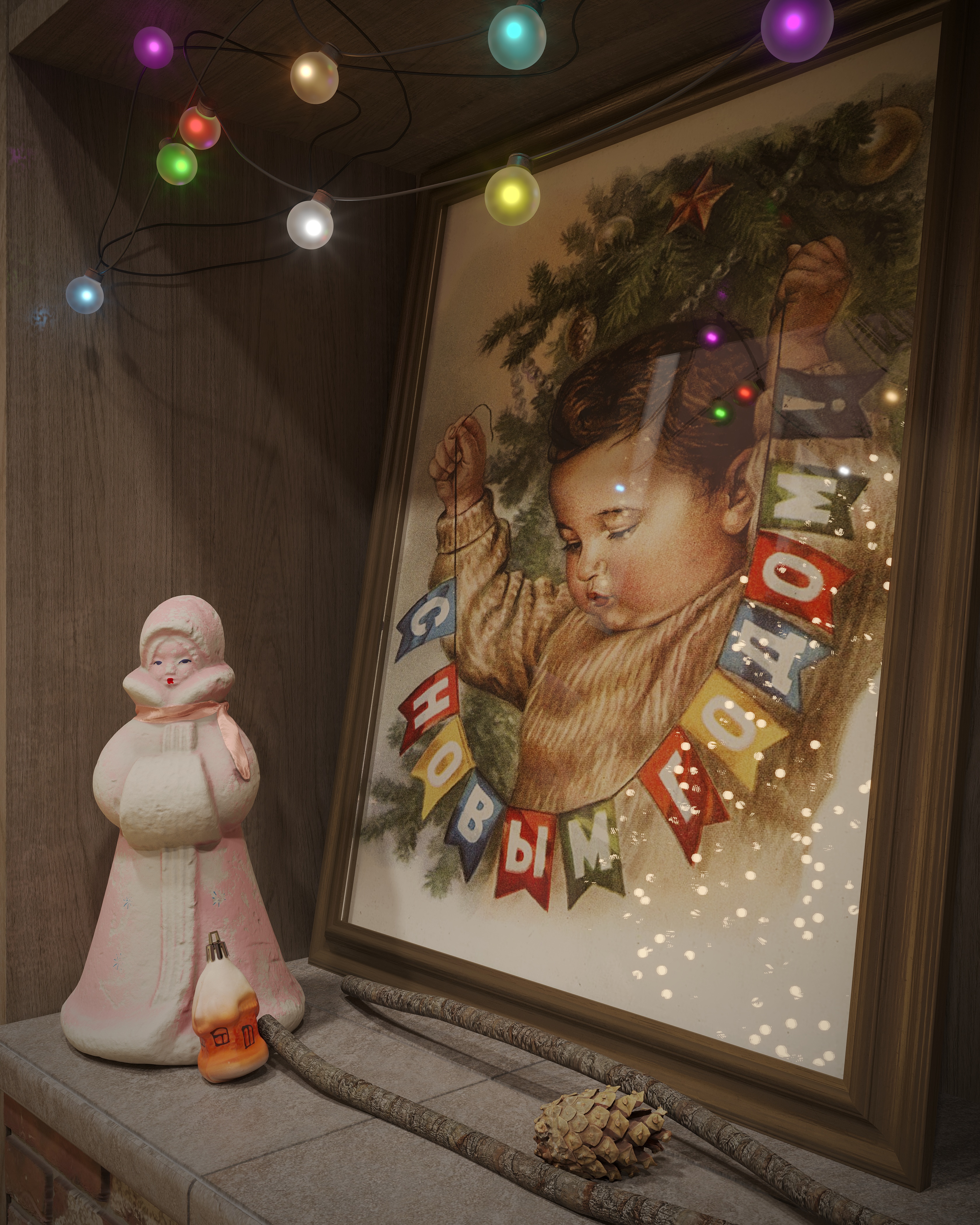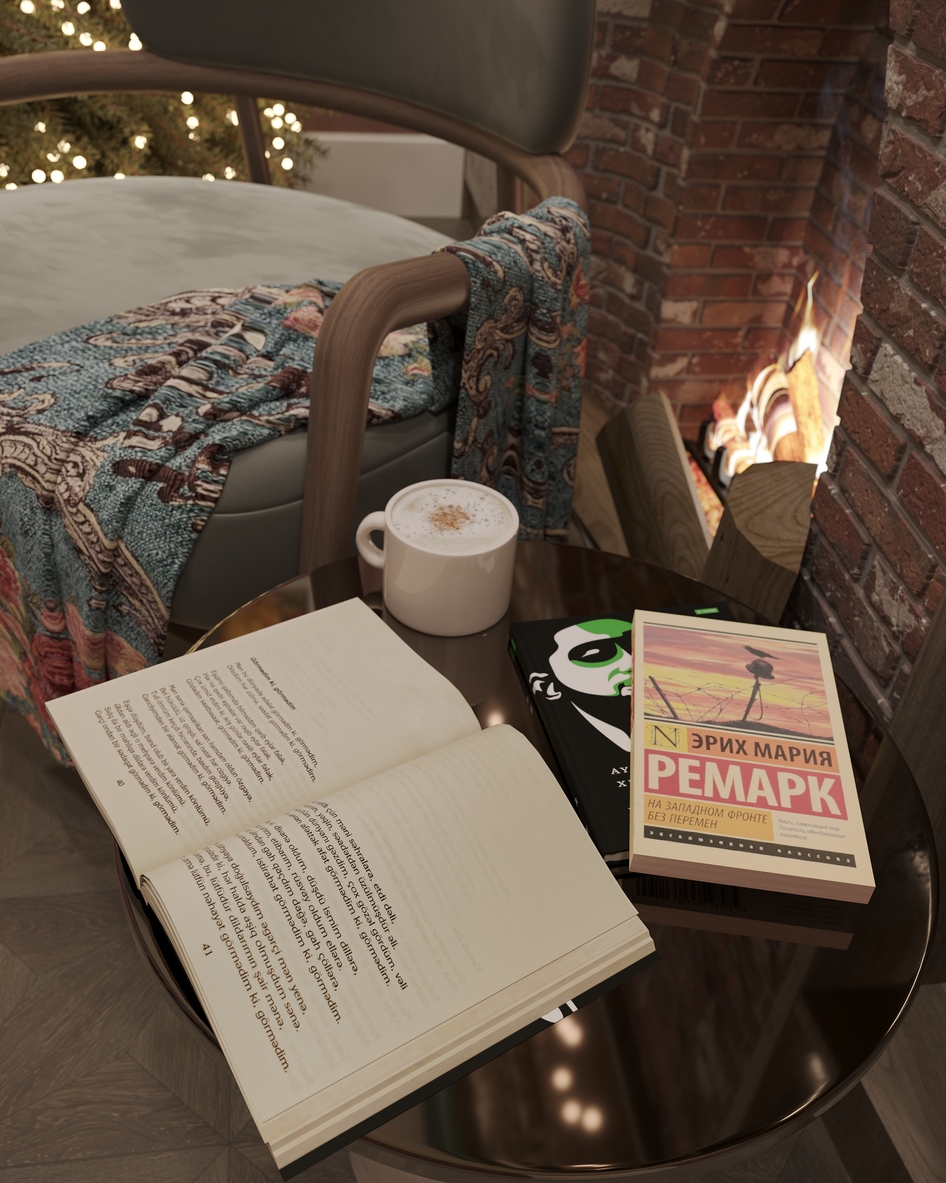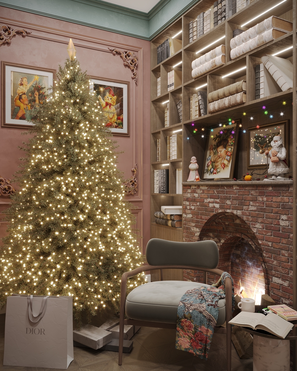 Классический интерьер с новогодним настроением. Мягкий свет, книги, камин.