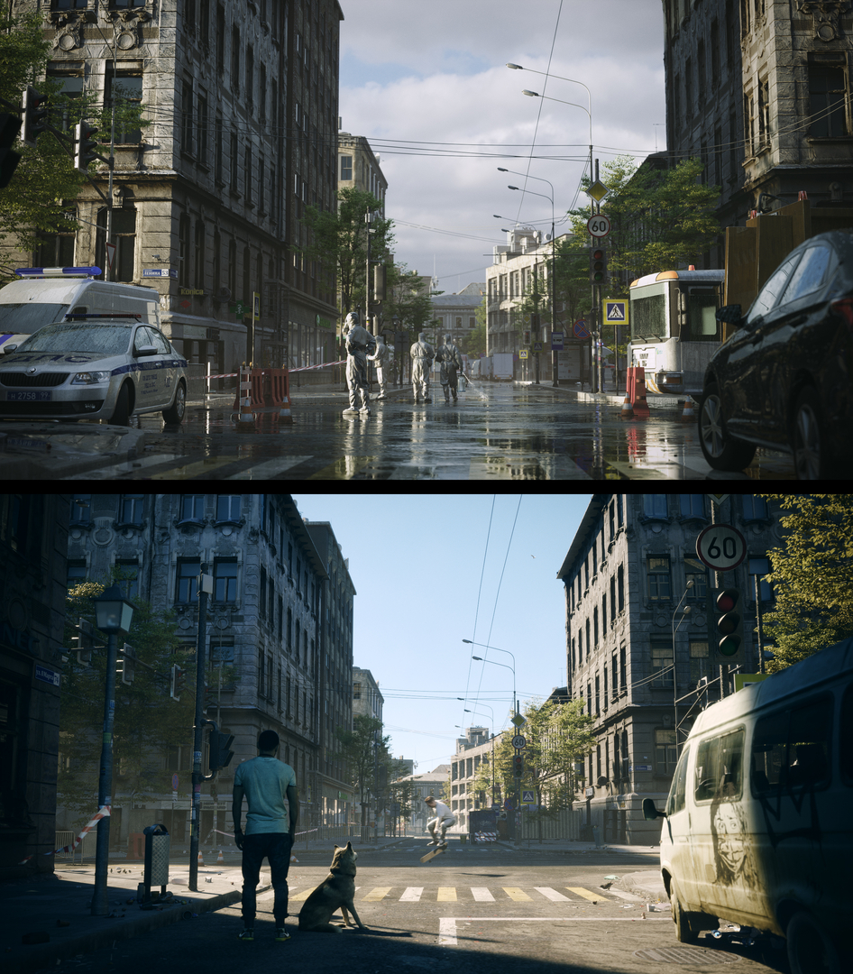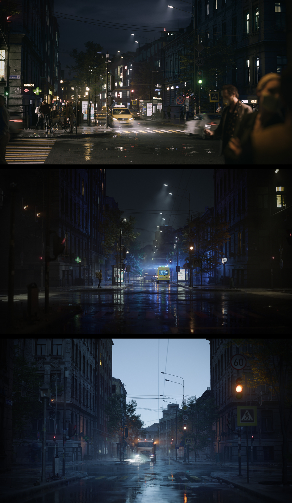 2) если есть капли на машинах и лужи, то и на окнах зданий тоже нужны капли, и сами дома мокрыи