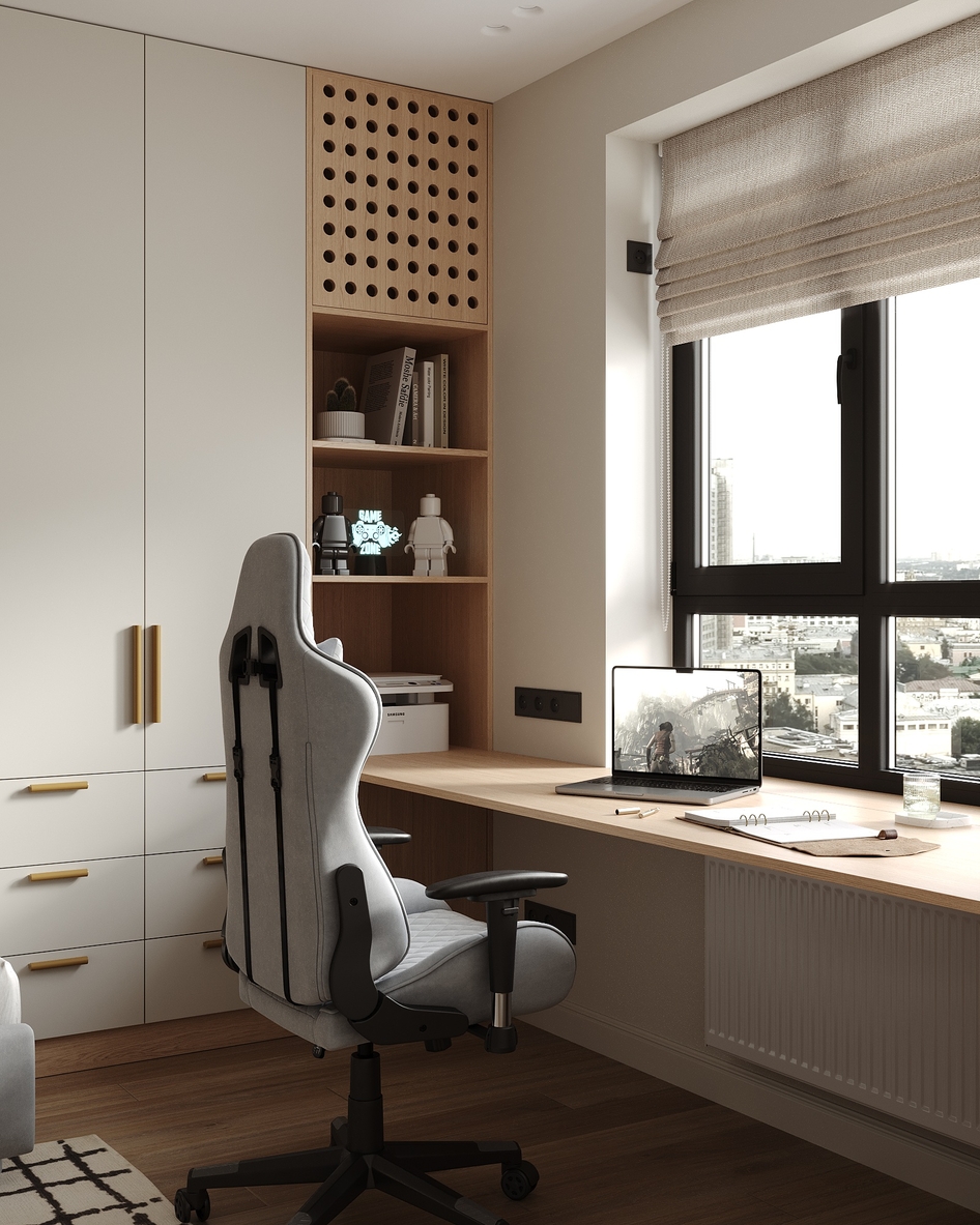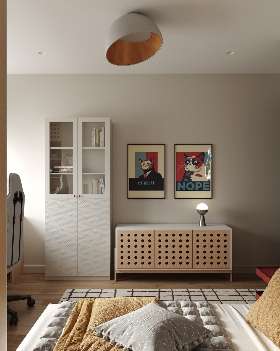Все отлично, приятный дизайн, визуал. Материалы неплохие, отверстия эти, супер идея. Но зачем тут этот странный белый шкаф? Он как будто случайно попал в этот прекрасный интерьер.