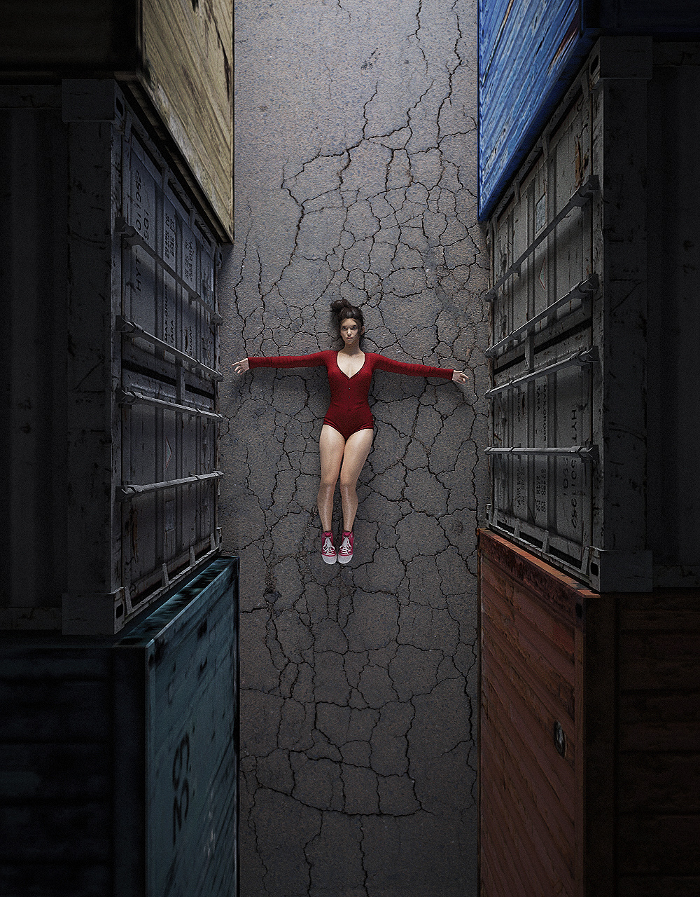 Ощущение, что дама просто решила отправиться в ангар-склад зачем-то полежать меж контейнеров. Врата открыты с двух противоположных сторон, что и дает свет. Т.е. кажется, что она просто пялится в потолок некоего складского помещения. Нет ни какого ощущения неба над головой)). Но это имхо конечно)