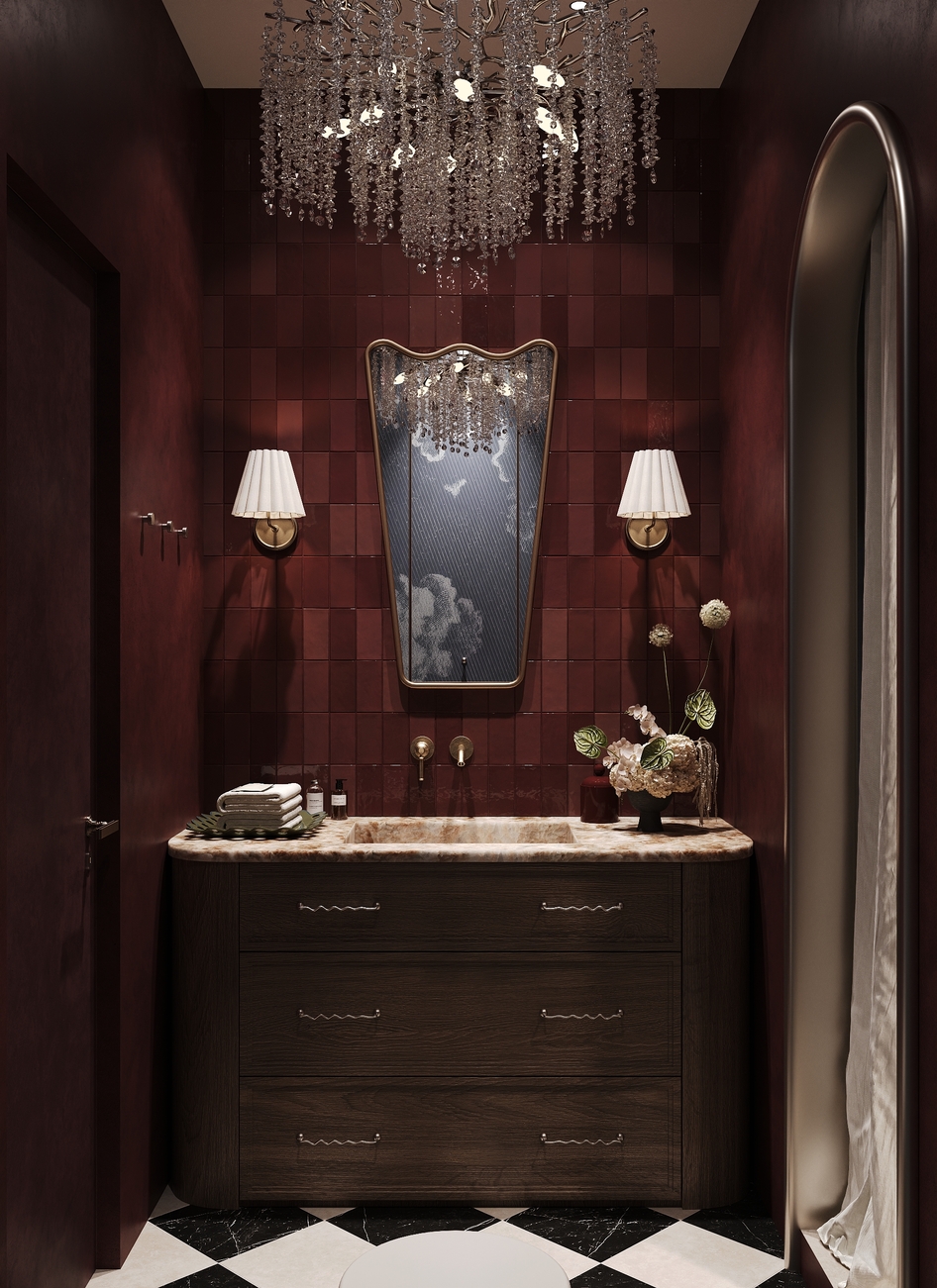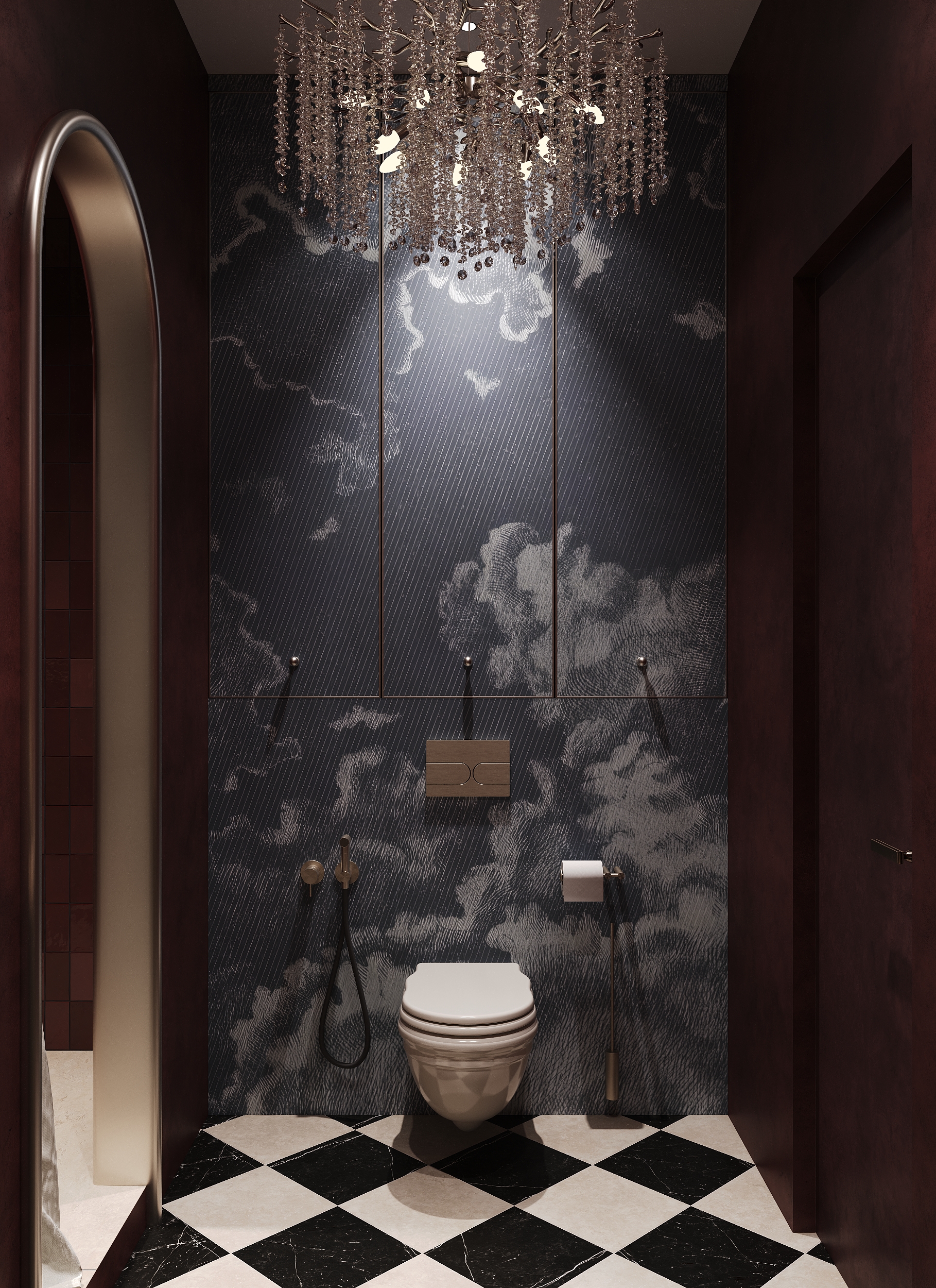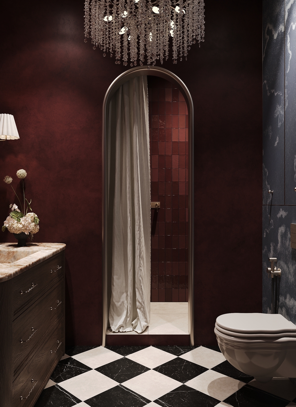 Красивая работа, но всё-таки по моему если добавить арку где обои где унитаз, такую же как с боку, смотрелось бы лучше ( это только моё мнение на уже готовый виз )