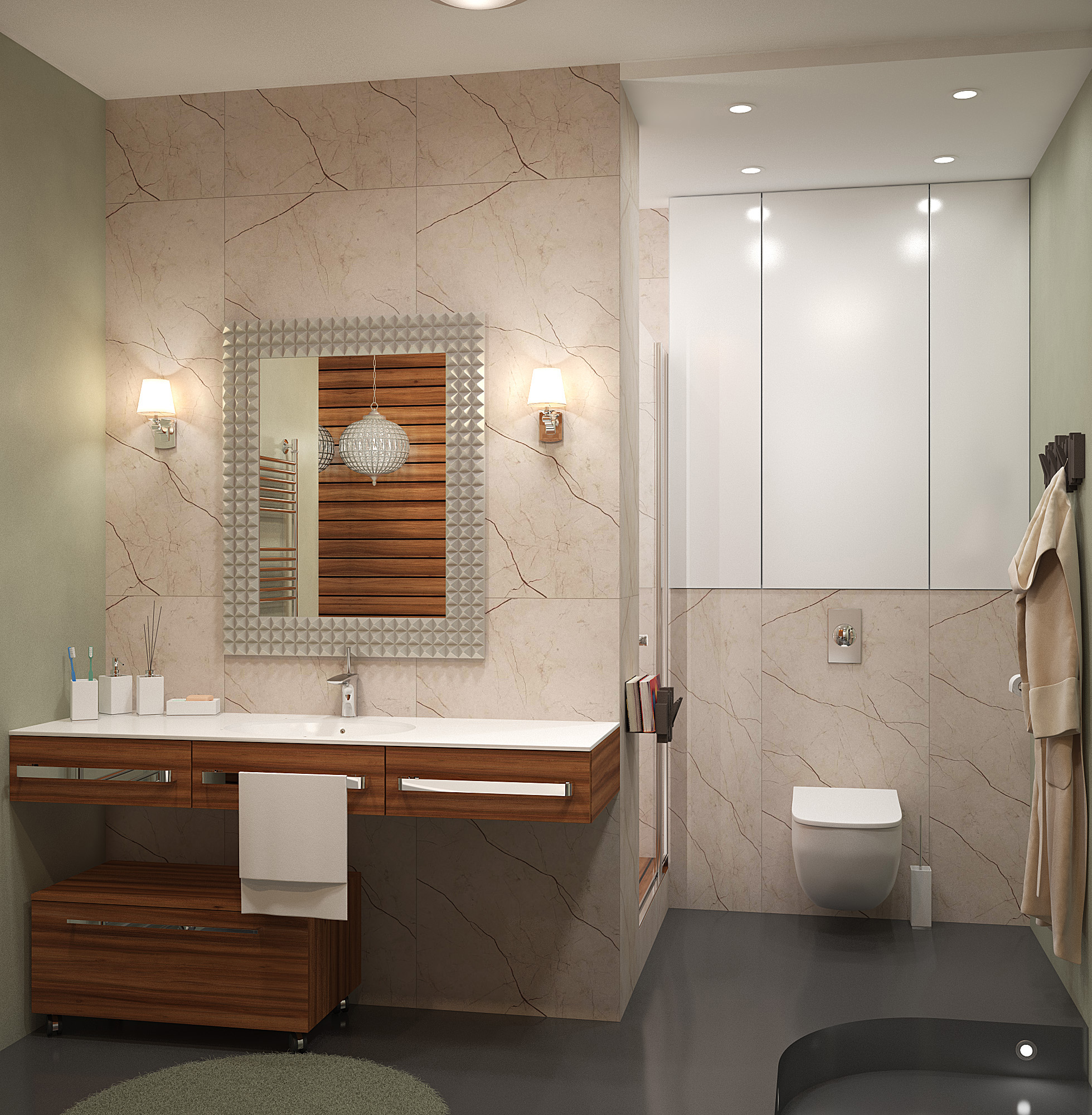 Полное отсутствие рефлексов на мраморе совершенно убивает виз, мат дерево так же страшно унылый, очень странно развешаны большие светильники, странно весит люстра над ванной практически вупор к странного размера зеркалу справа от ванной. Далее вешалка для великанов над странно раположенным полотенцесушителем (я бы его поставил как минимум посередине между рукомойником и ванной, и наверное немного повыше). Далее если сравнить светильники побокам от зеркала с размерами зубных щеток, возникает вопрос какого размера лампочки в светильниках под абажурами (наверное светодиоды). Почему у тумбочки такая тонкая ручка? Ямка возле выхода несомненно разнообразит скучную жизнь вашего заказчика. Почему корзина для белья подпирает дверки встроенного шкафа, без нее они открываются?