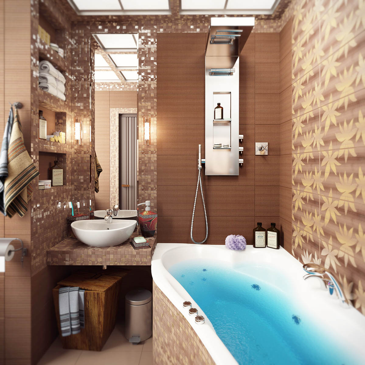 Визуализация понравилась. Несколько слов по дизайну...Подобный дизайн был бы хорош, если бы помещение ванны было хотя бы в два раза больше, а так слишком много всего, аж в глазах рябит. Может мозаику оставить только в обрамлении зеркала и, возможно, потолка, а на полках - фоновая плитка. Декор с листиками над ванной тоже лучше убрать или, если уж очень хочется, сделать вставку из той же мазаики. Будет чуть построже, но более стильно. Ну это мое мнение. За воду в ванной и край умывальника уже писали. Мозаика удалась))