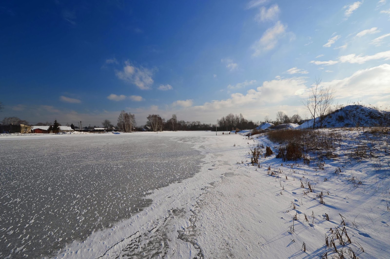 снег на берегу и на доме сейчас больше похож на рыхлый потекший пластик, в жизни на крышах снег лежит иначе, он не стекает, переход от берега к водоему слишком резкий