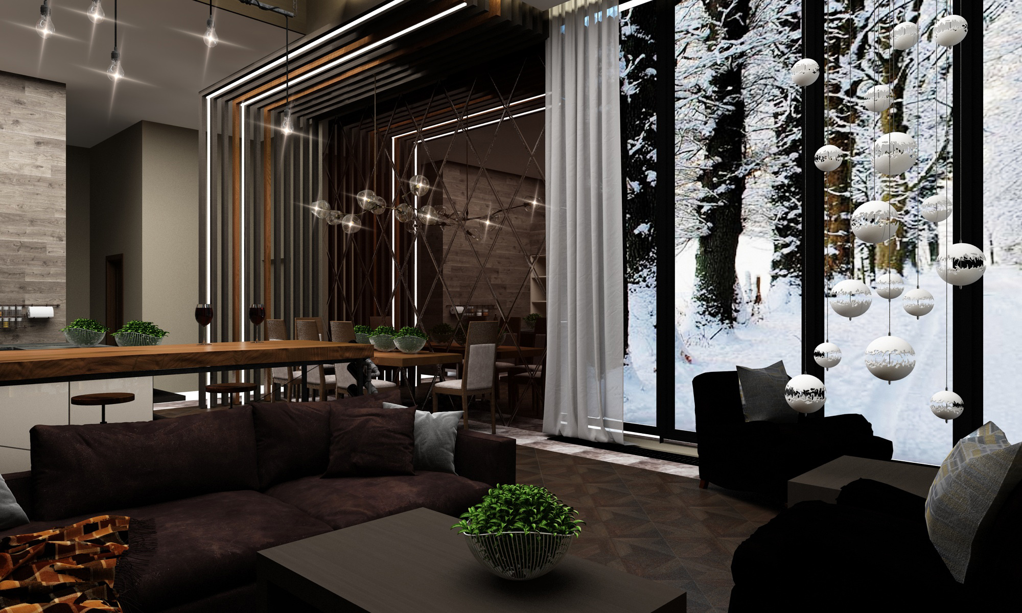 За основу интерьера была взята стилистика загородных домов Норвегии. Заказчики хотели видеть в своем интерьере грубый камень и деревянную текстуру на различных поверхностях. Тем самым дерево придало уюта внутреннему пространству, а камень и панорамные окна дали эффект единения с природой.