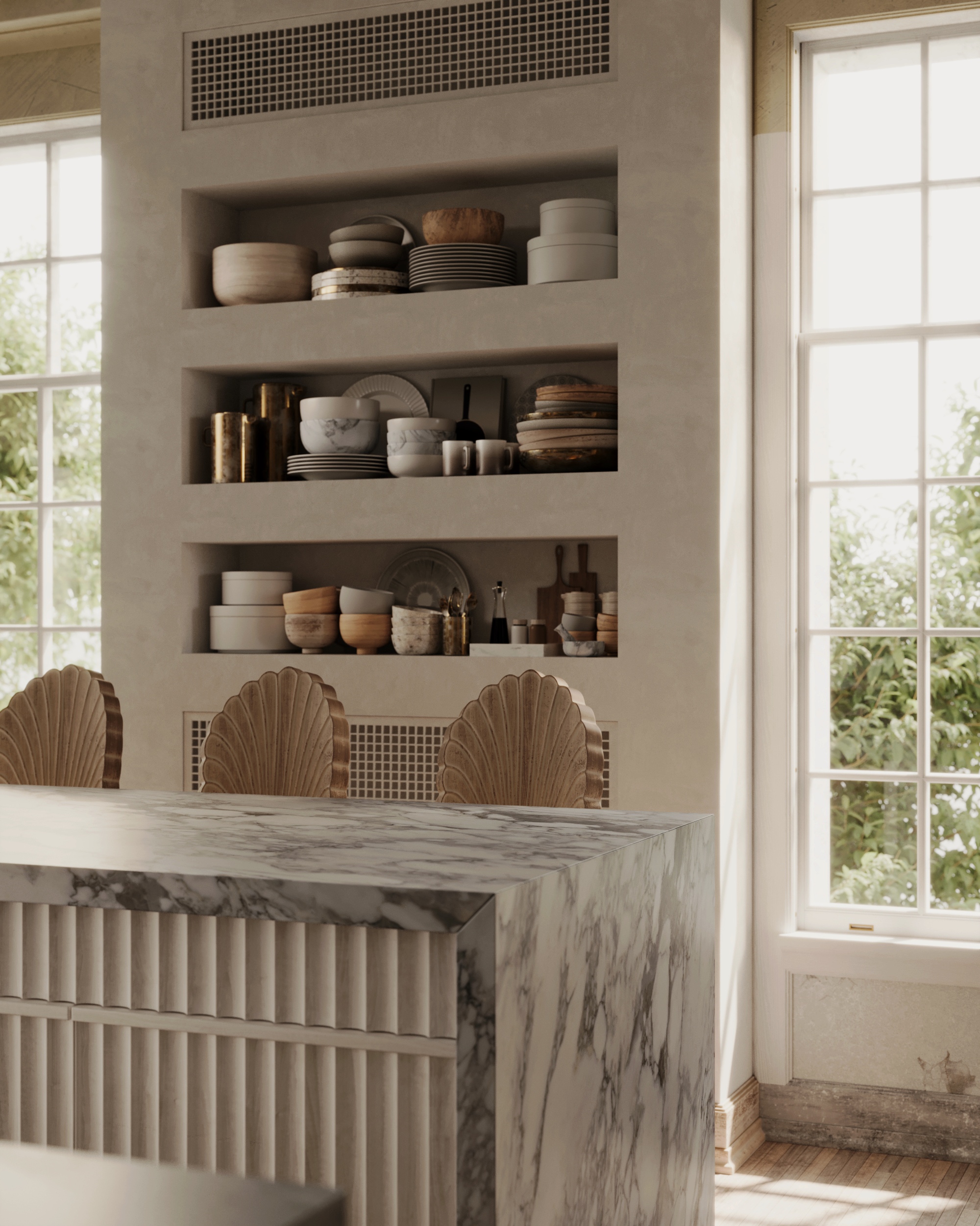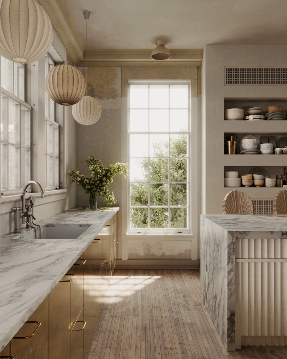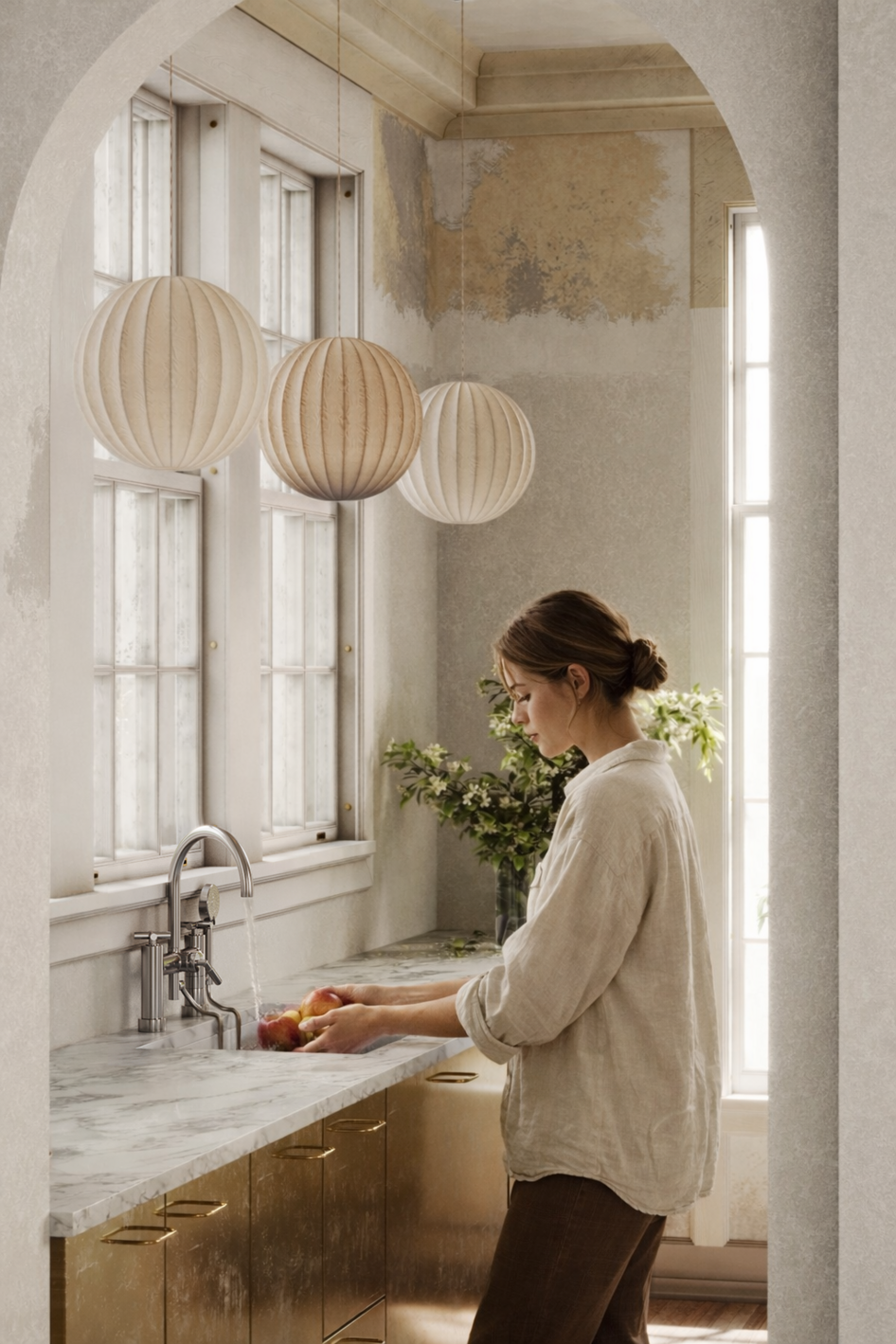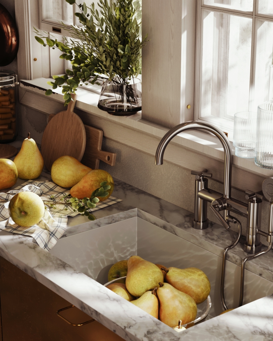 Красиво получилось, но с краном косяк, на вряд ли его так ставить будут, раковину не обязательно ставить по центру столешки её можно на 2 - 3 см подвинуть к фасаду.
