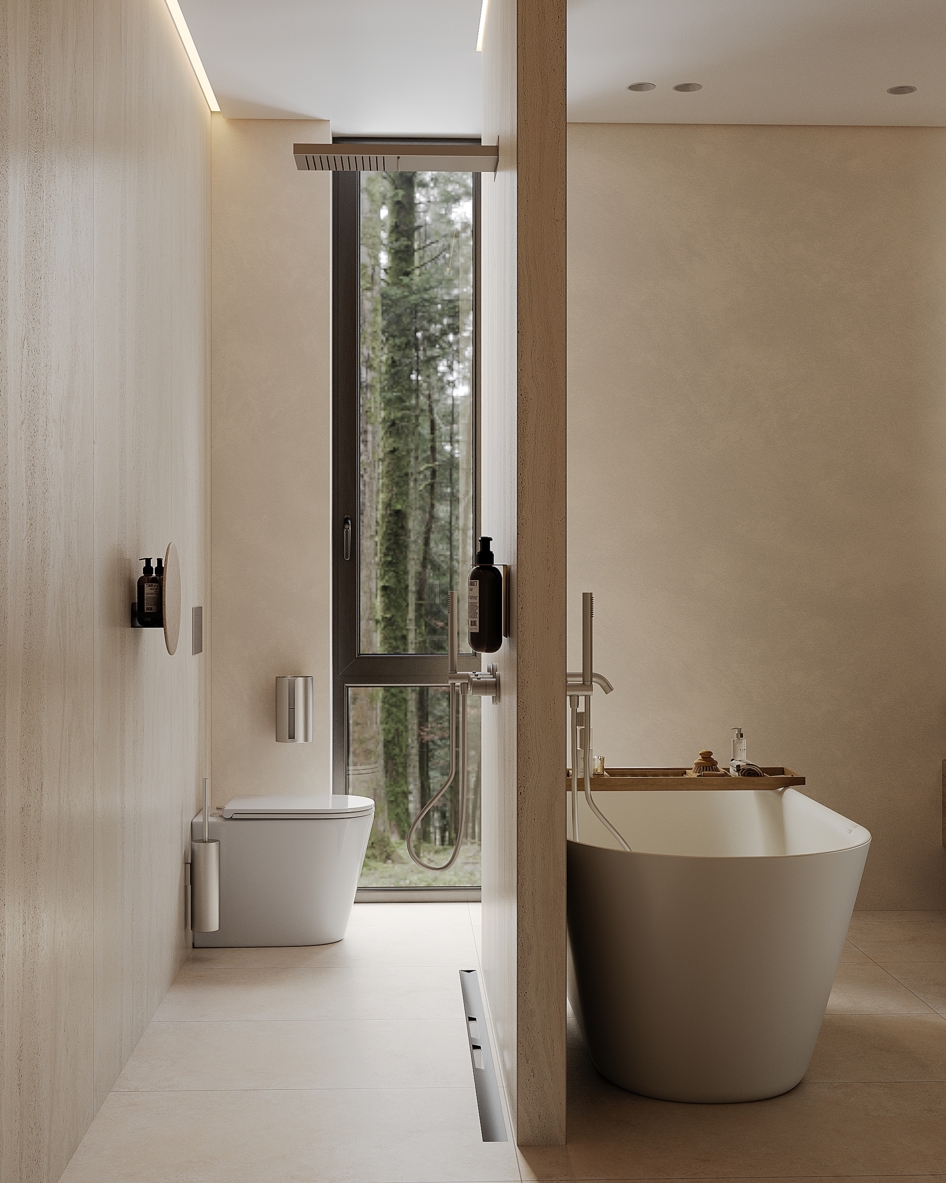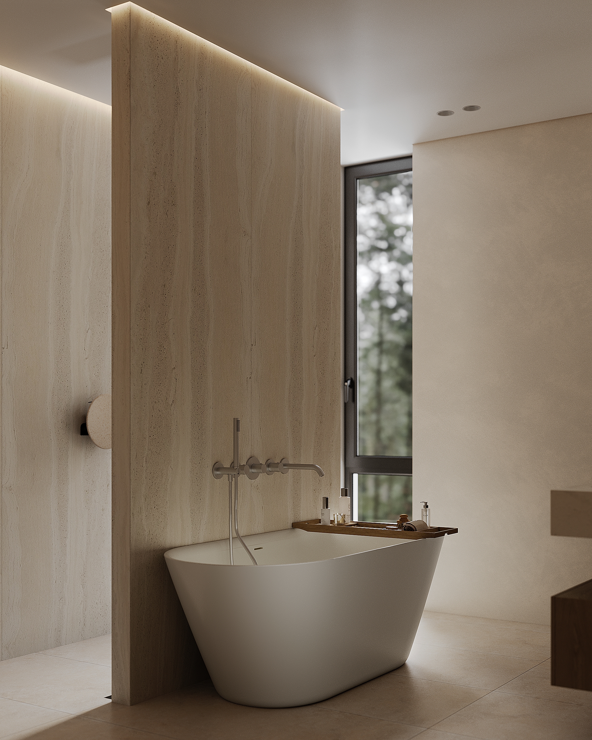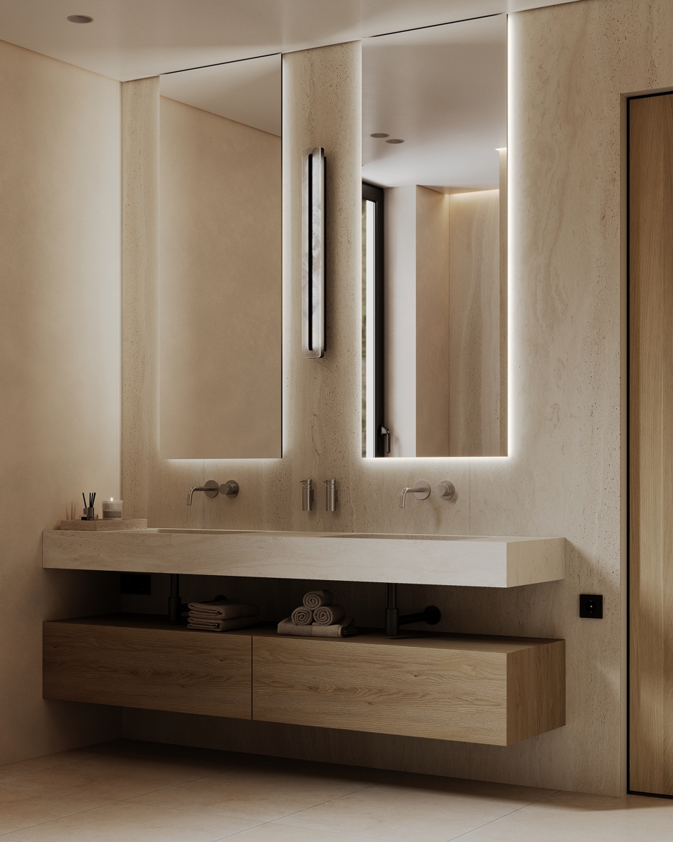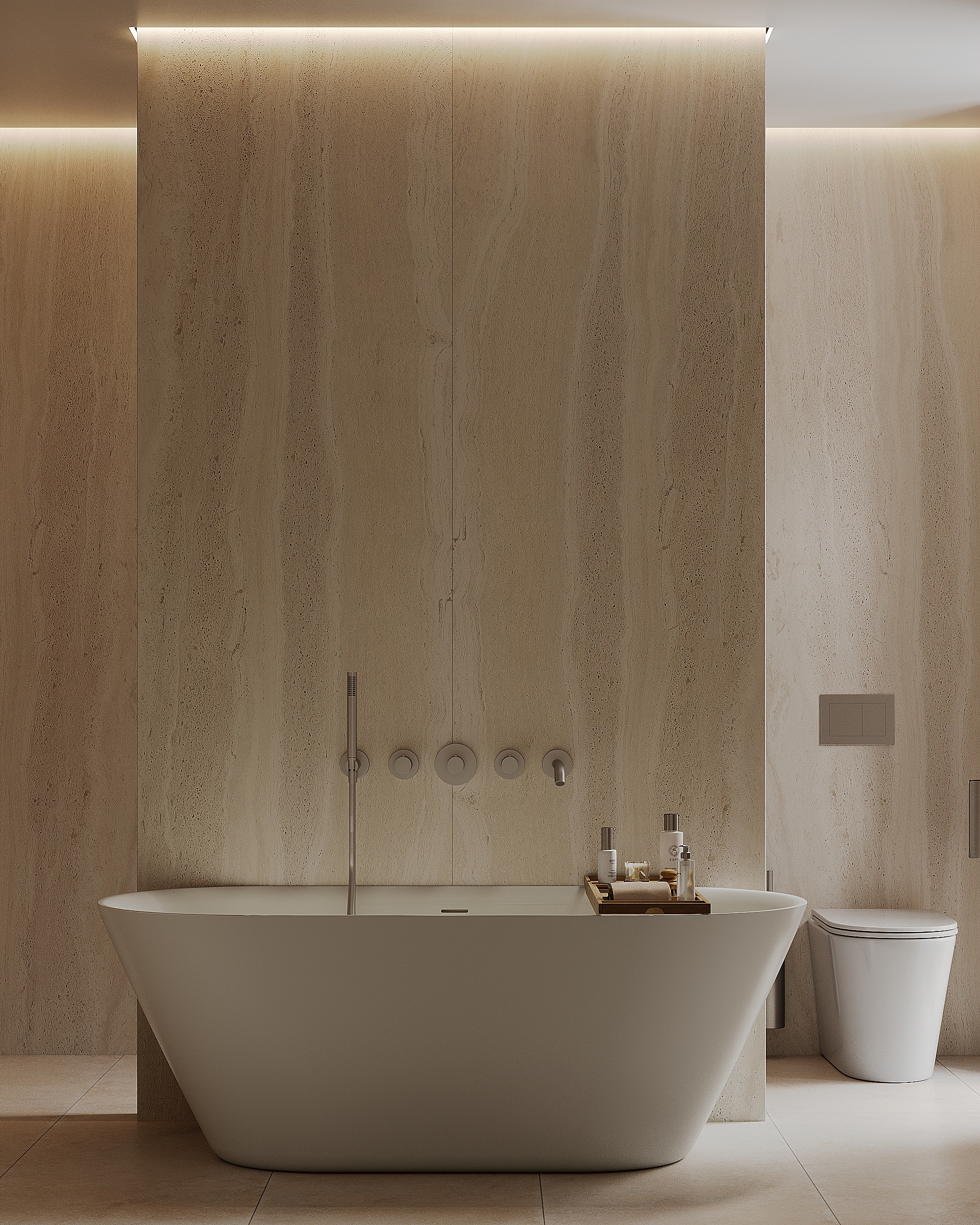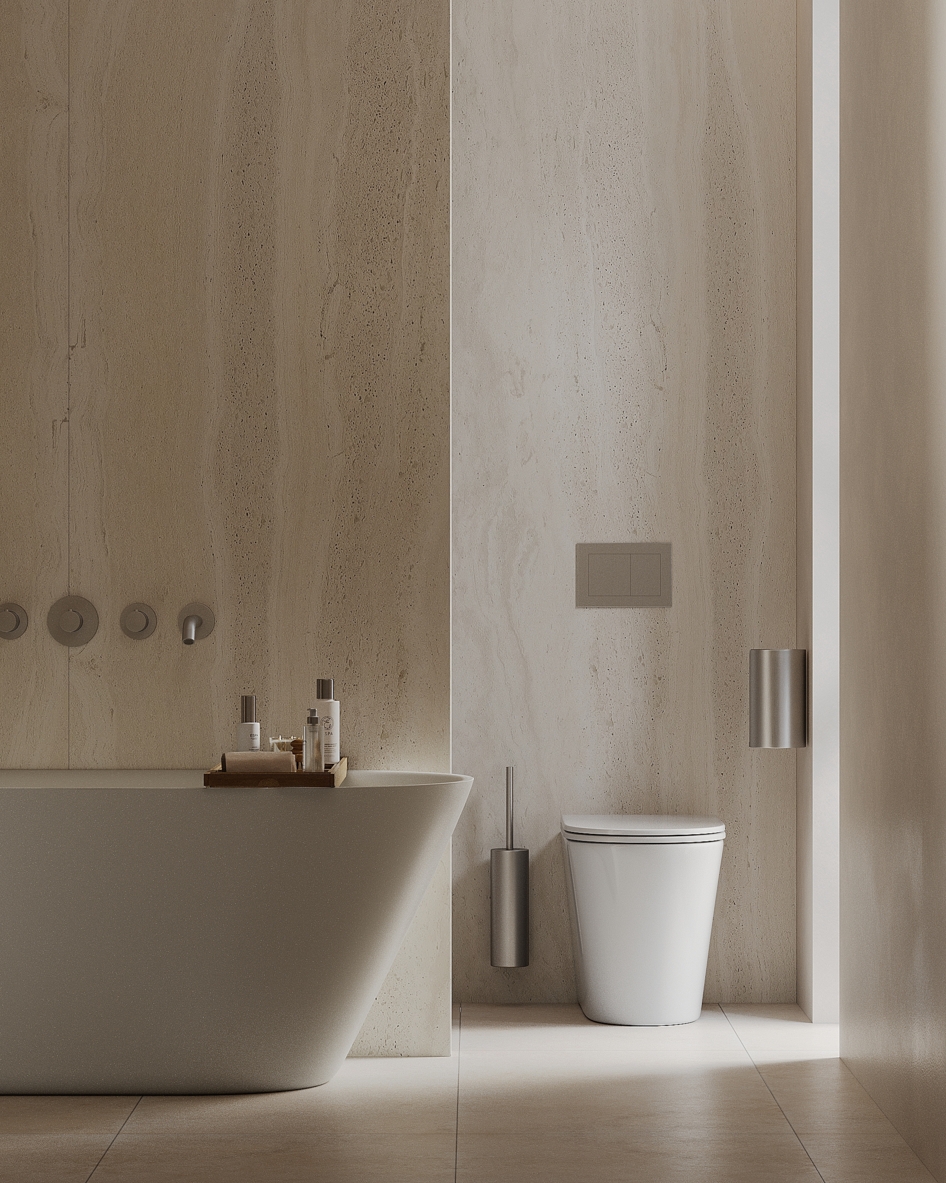 Очень красиво,Очень умно планировка.СОвременно. Качество рендера.Также умное решение кранам -нержавейка.И цвет подходит и уход минимально. Но света мало-нужно больше светильников.Хороший потенциал у материала. Травертин в СССР использовали в отделке стен различных проектных организаций , бань, и других общественных интерьеров. Но если это керамогранит-то выгладит отлично. Возможно это и микроцемент без швов-что ещё лучше потому-что дешевле и быстрее.