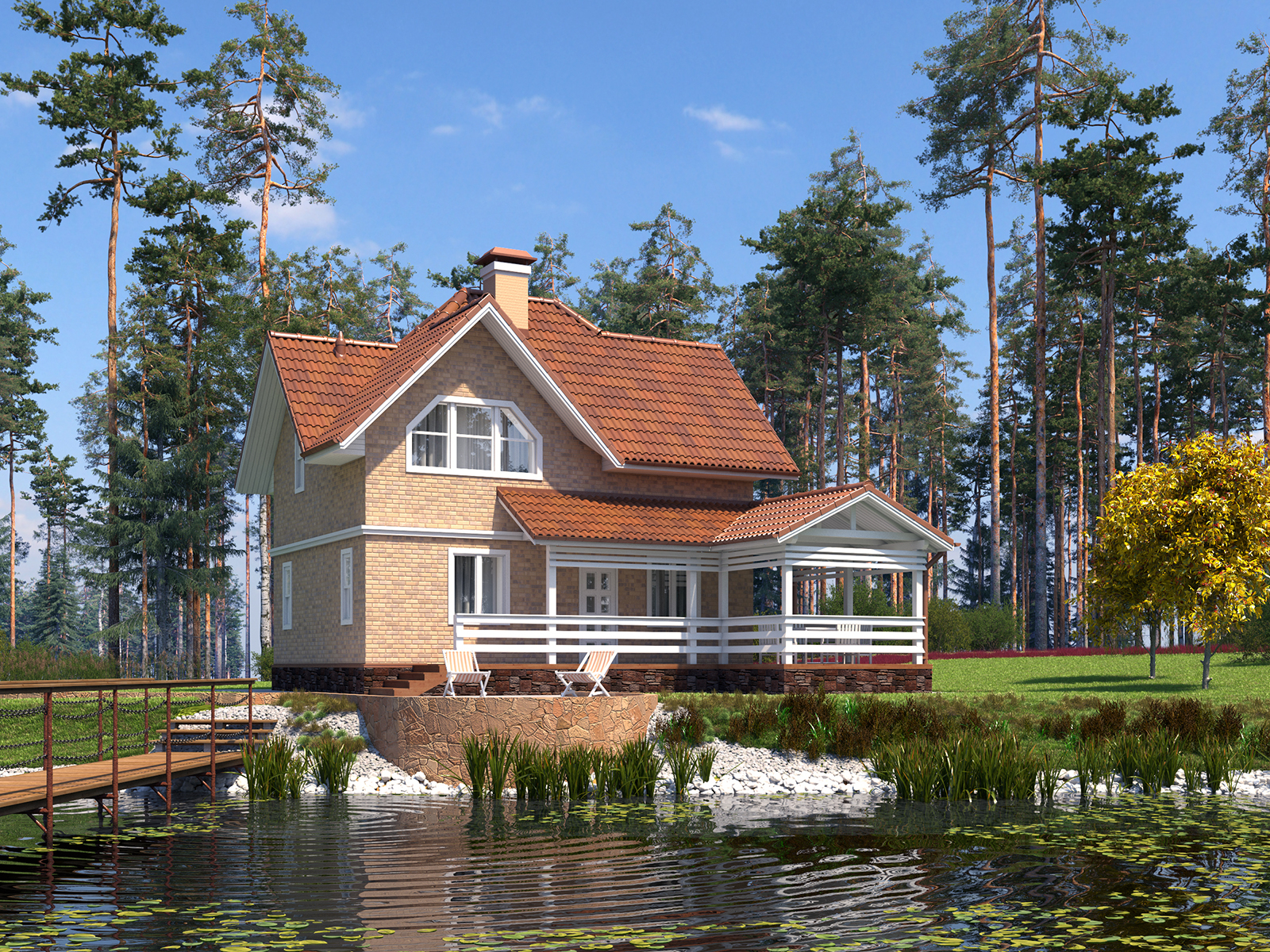 Все остальное надо дотягивать - нету водосточных труб, кирпич, можно было плагином сделать реалистичнее, цоколь жестокая текстура, в камней возле воды либо текстура пропала, либо надо было колор корекшеном затемнить, подшива дома идет в реале перпендикулярно стенам., траве бы добавить разнообразия растительности.