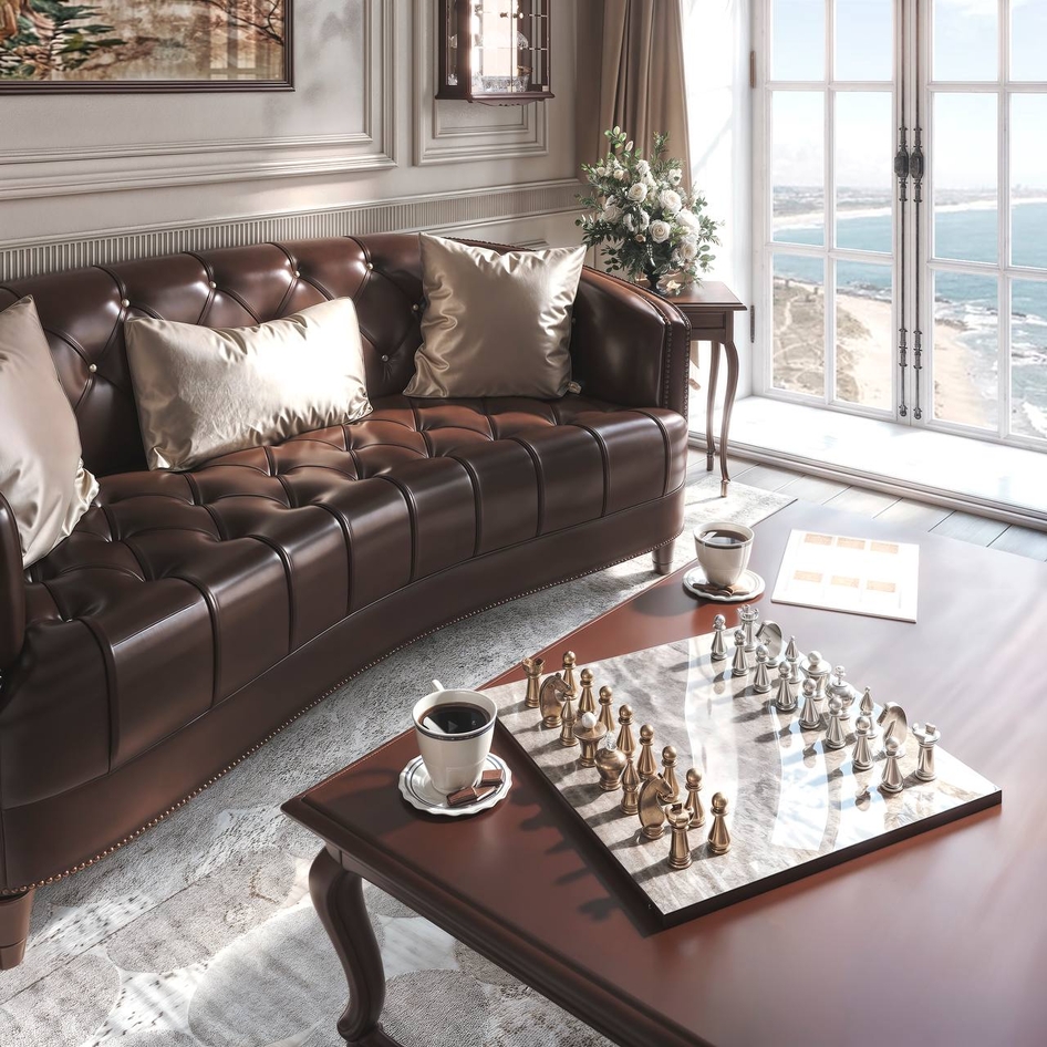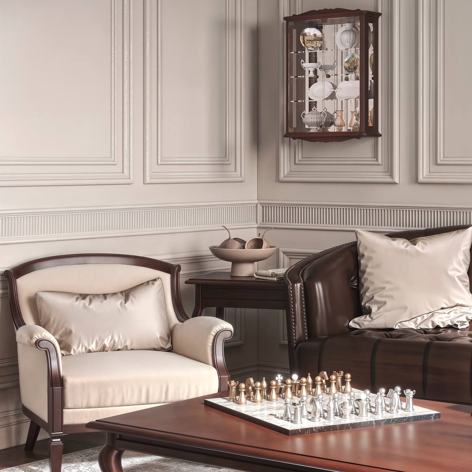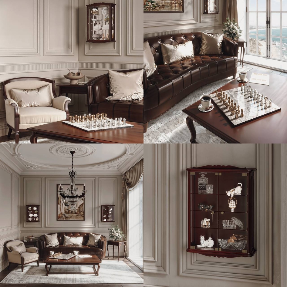 Напишу честно...Создать классический интерьер гостиной комнаты, куда можно вписать витрины, для меня было немного сложновато, так как я понимала, что в кадре должны быть и кофейные столики, и смотреться должно все едино-гостиная, 1 кадр, никаких обеденных зон и т.д. куда бы витрина вписалась логично.
